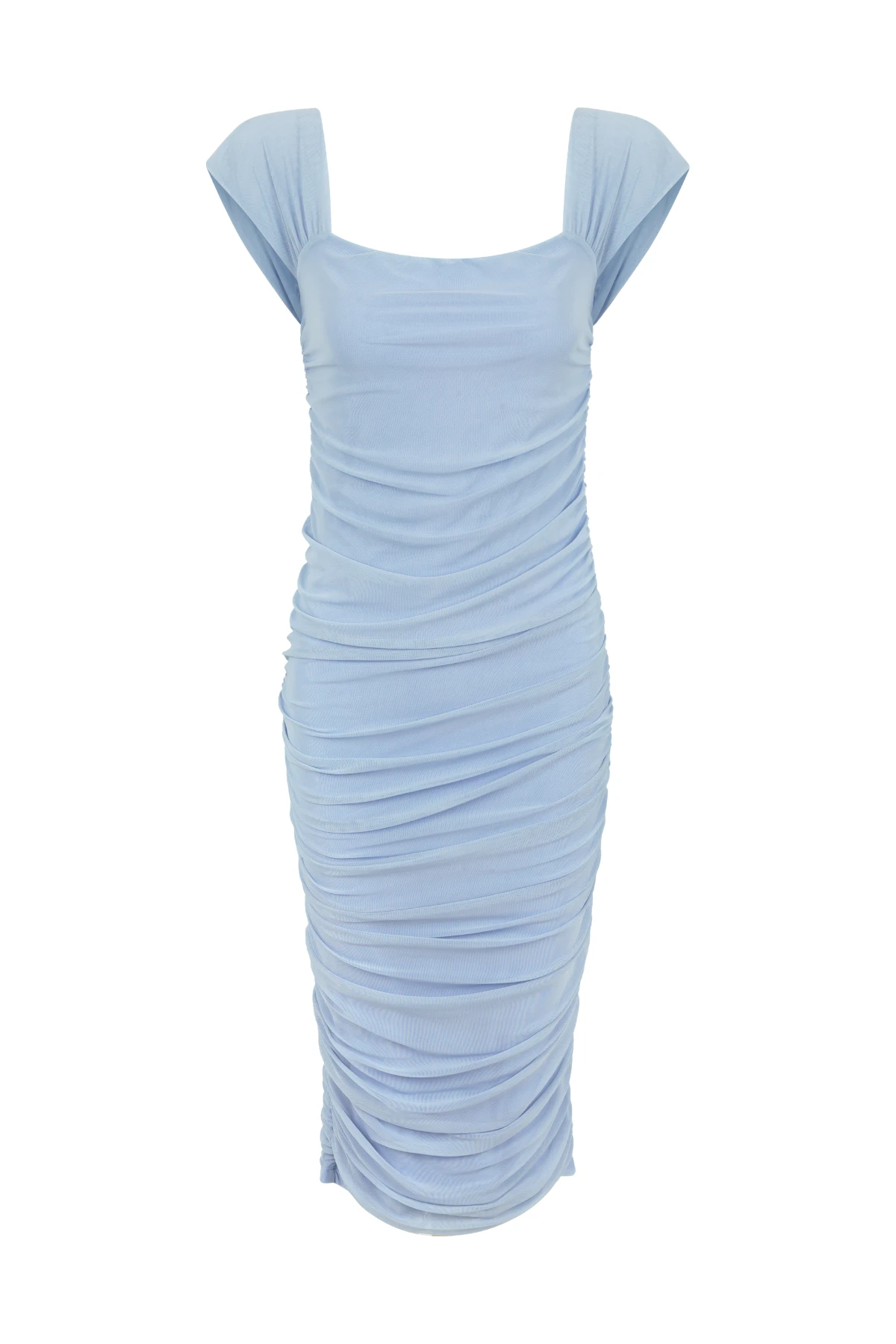 Modelagem midi que acompanha a curvatura do corpo sem apertar. O drapeado lateral com elástico embutido ajusta-se à barriga, modelando a silhueta de forma natural e confortável ao longo da gravidez.