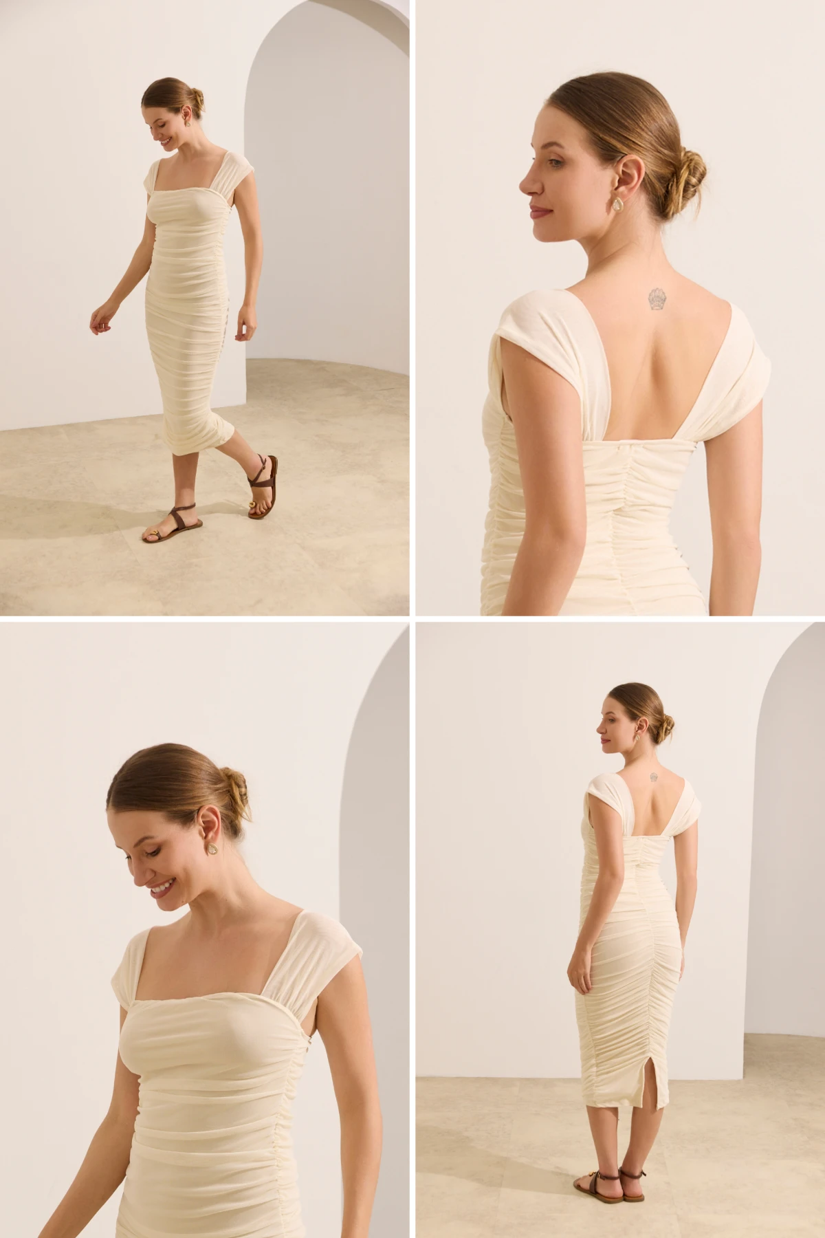 Vestido midi drapeado em tule com forro macio.