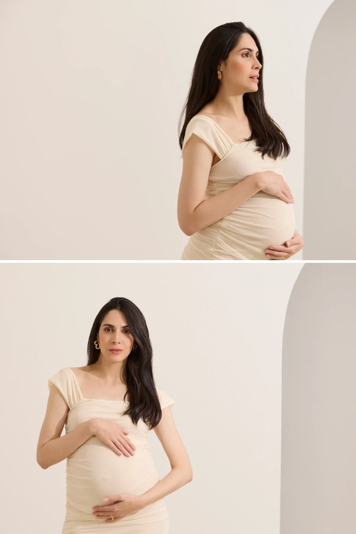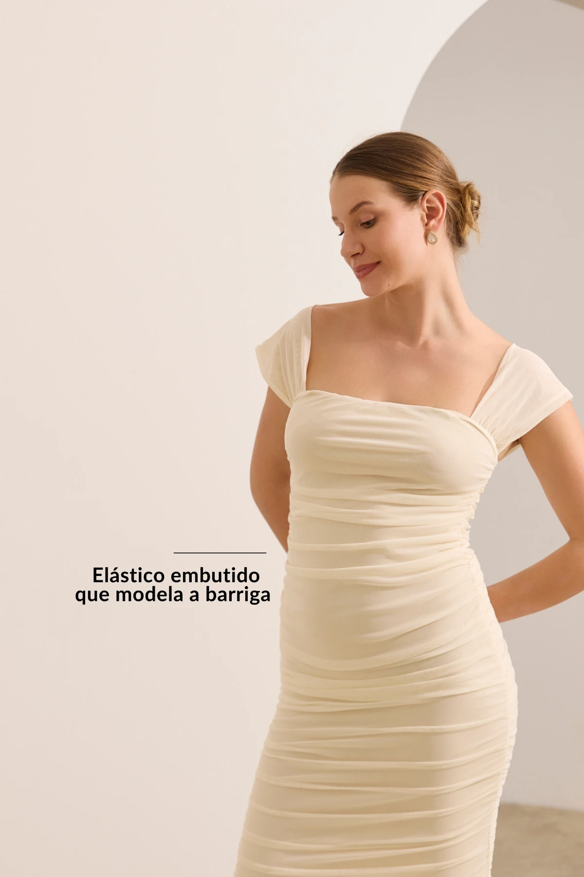 Modelagem midi que acompanha a curvatura do corpo sem apertar. O drapeado lateral com elástico embutido ajusta-se à barriga, modelando a silhueta de forma natural e confortável ao longo da gravidez.