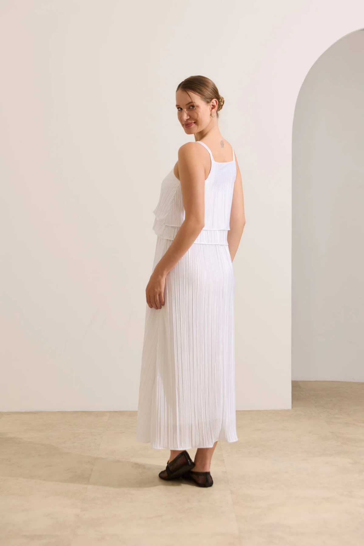 - Tecido plissado levemente perolado