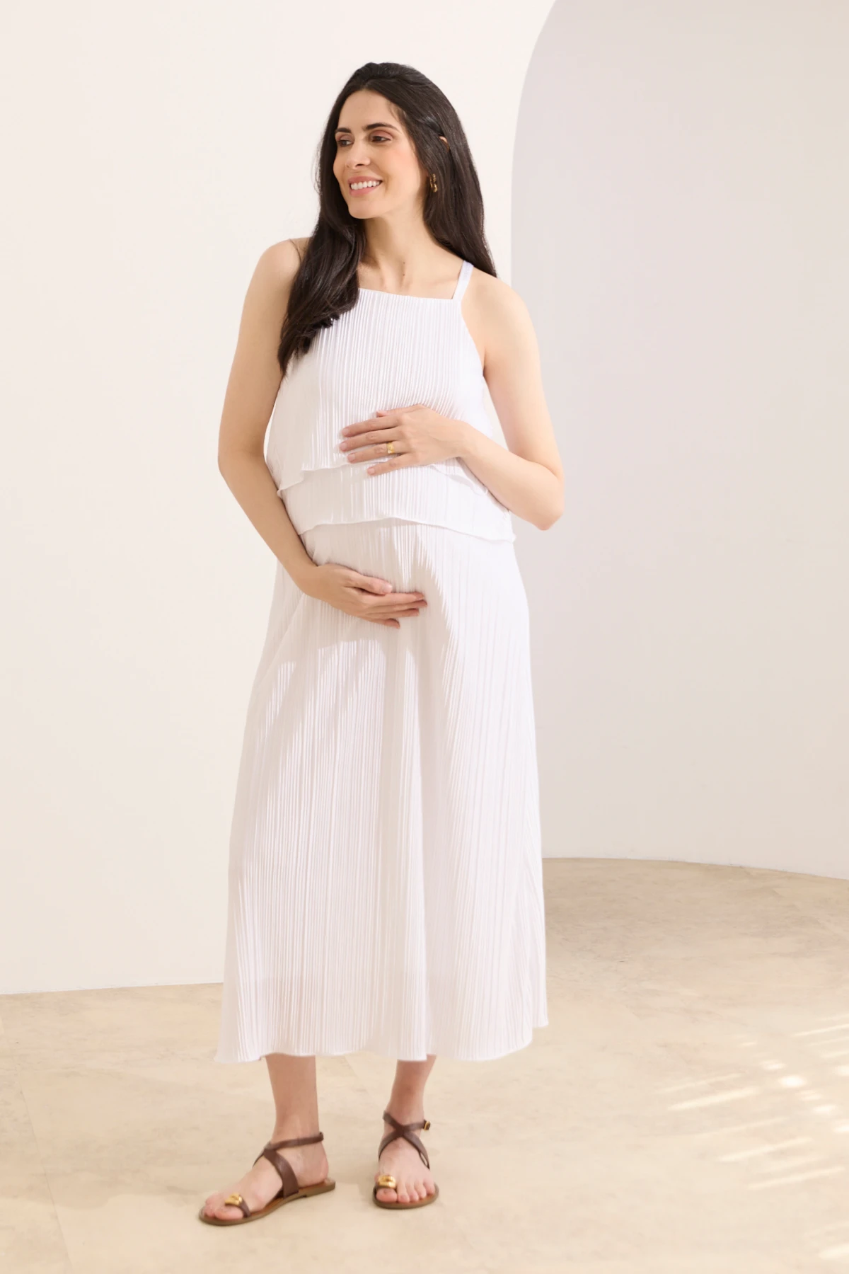 Vestido midi e soltinho, produzido em tecido plissado levemente perolado. A modelagem do busto possui sobreposição de 2 camadas, com forro interno e abertura para uma amamentação fácil e prática. As alças são na largura ideal que possibilidade usar com sutiã. O vestido possui ótimo caimento e fluidez para acompanhar desde a gestação à amamentação.