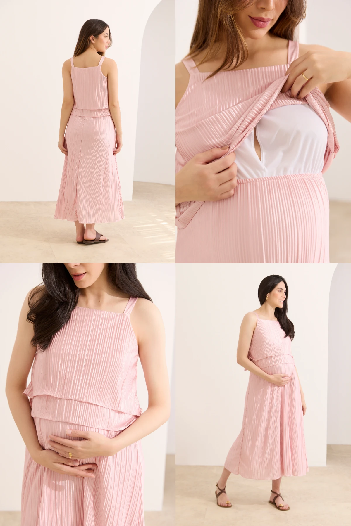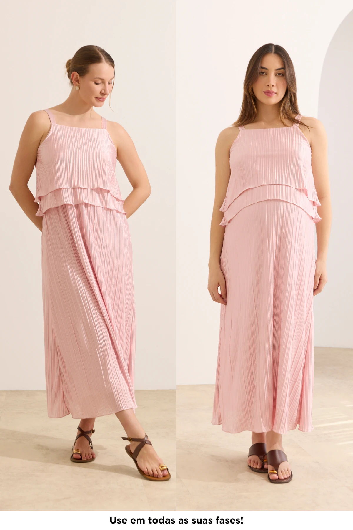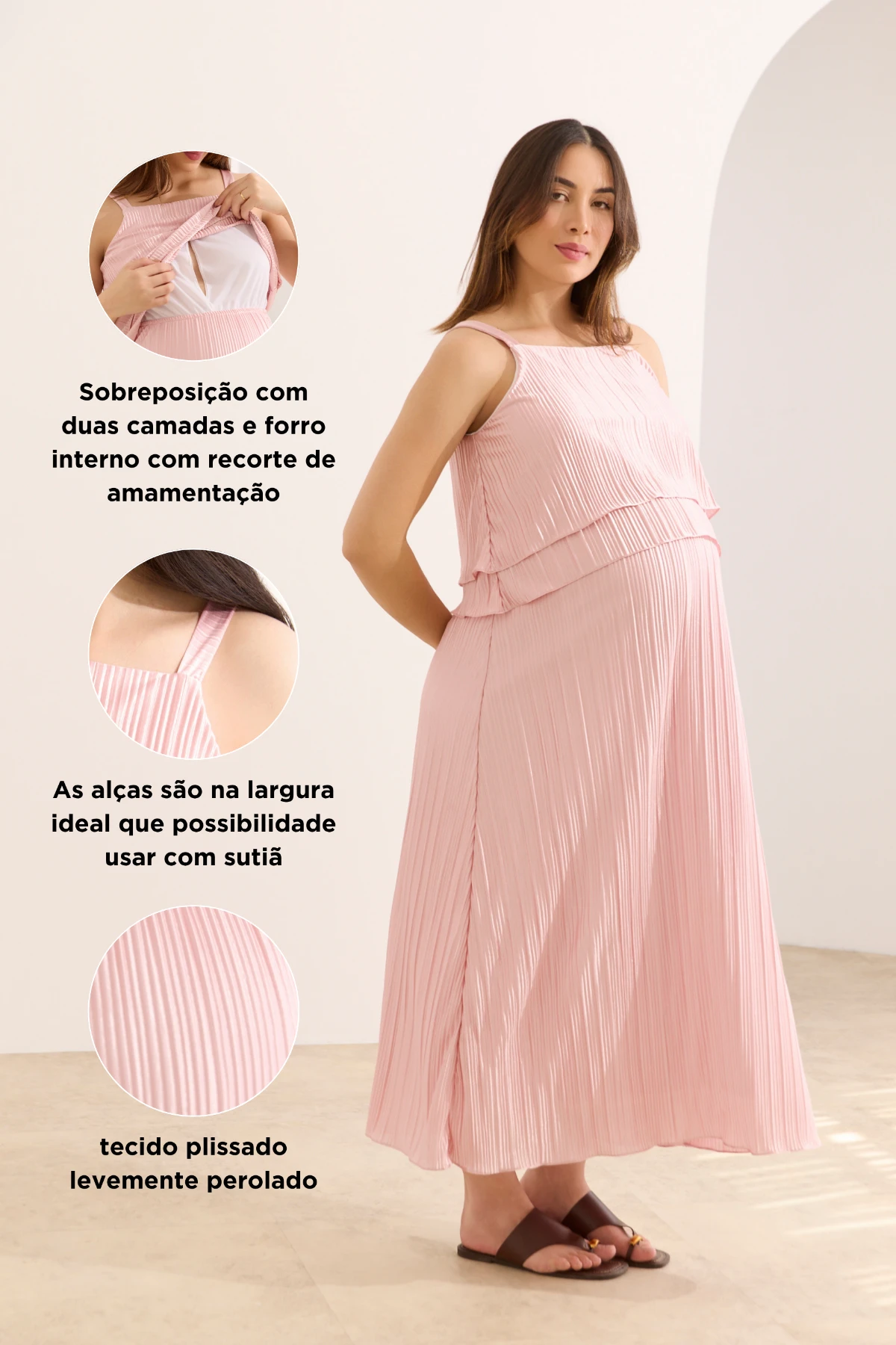Vestido produzido em tecido plissado levemente perolado, com modelagem leve e soltinha. Comprimento midi, possui sobreposição com 2 camadas e forro interno com recorte que facilita a amamentação. Perfeito para usar em todas as fases, desde a gestação à amamentação.