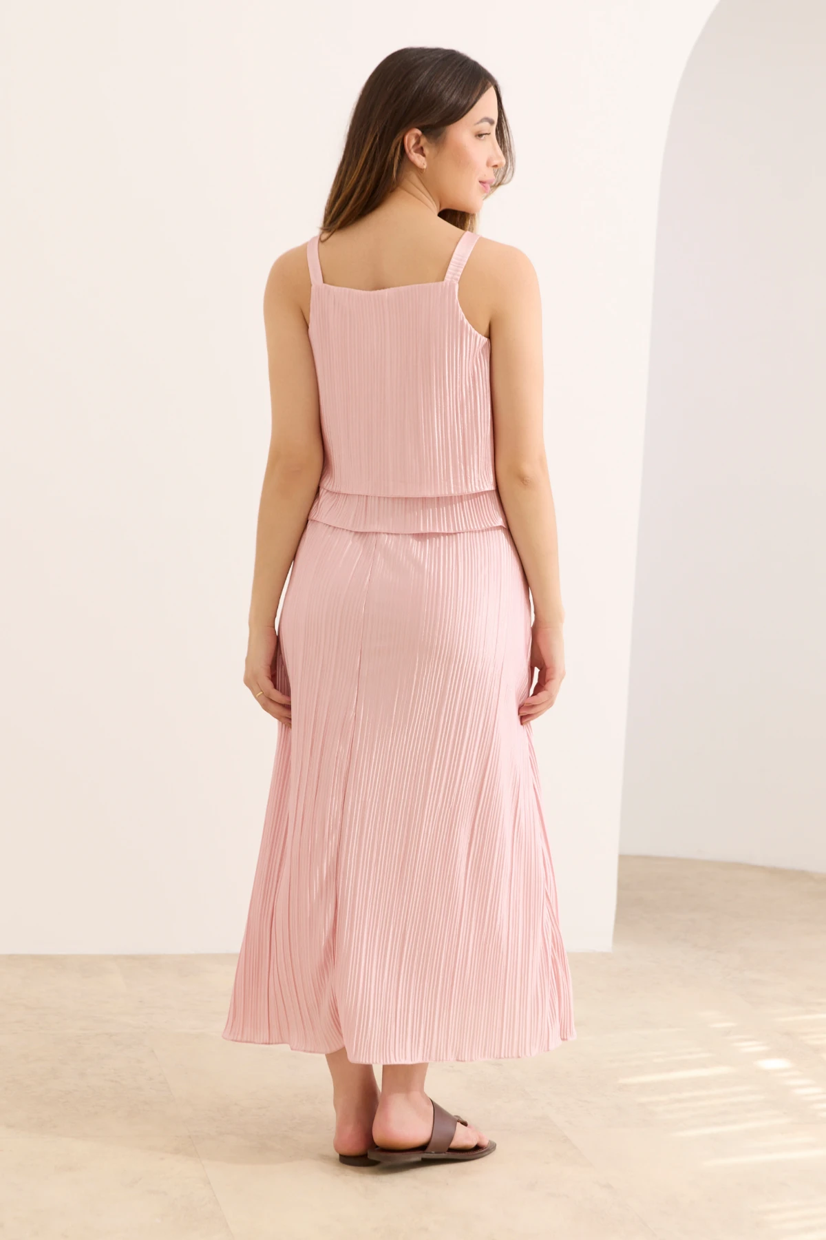 Vestido midi e soltinho, produzido em tecido plissado levemente perolado. A modelagem do busto possui sobreposição de 2 camadas, com forro interno e abertura para uma amamentação fácil e prática. As alças são na largura ideal que possibilidade usar com sutiã. O vestido possui ótimo caimento e fluidez para acompanhar desde a gestação à amamentação.