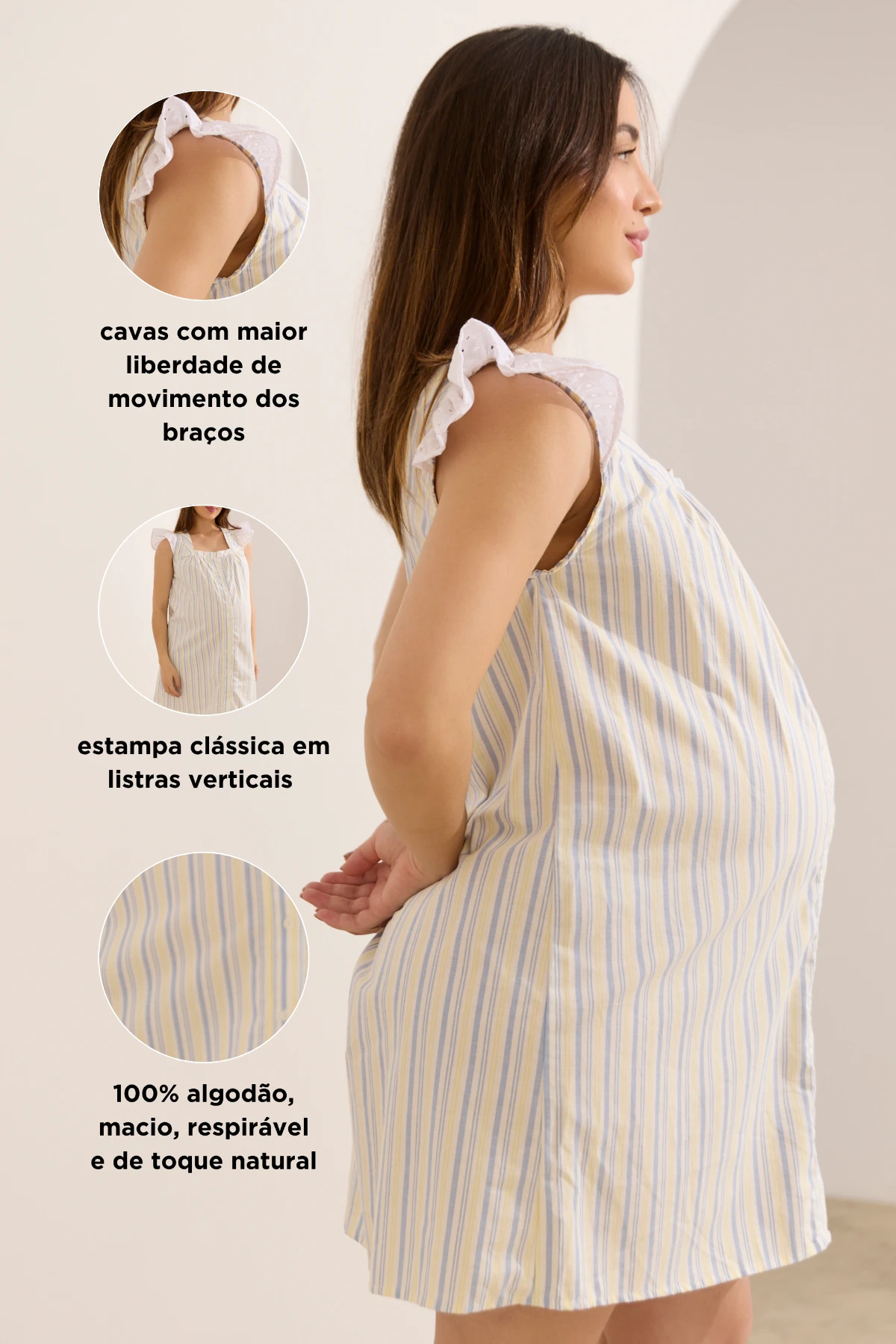 As mangas em laise verão trazem pequenos recortes que criam um acabamento romântico, sem comprometer a funcionalidade. As listras verticais têm função estética e prática: criam um efeito visual alongador que ajuda a harmonizar a silhueta durante a gestação, valorizando a barriga sem marcá-la.
