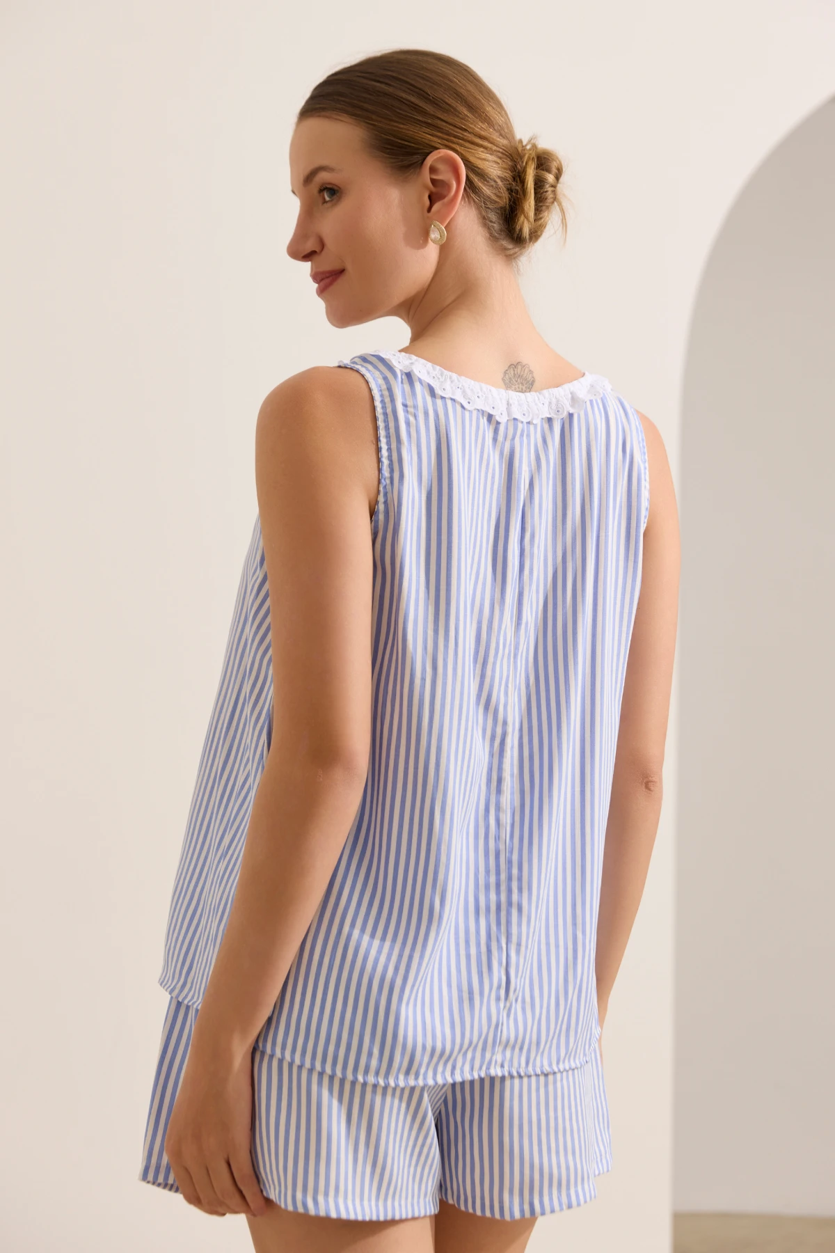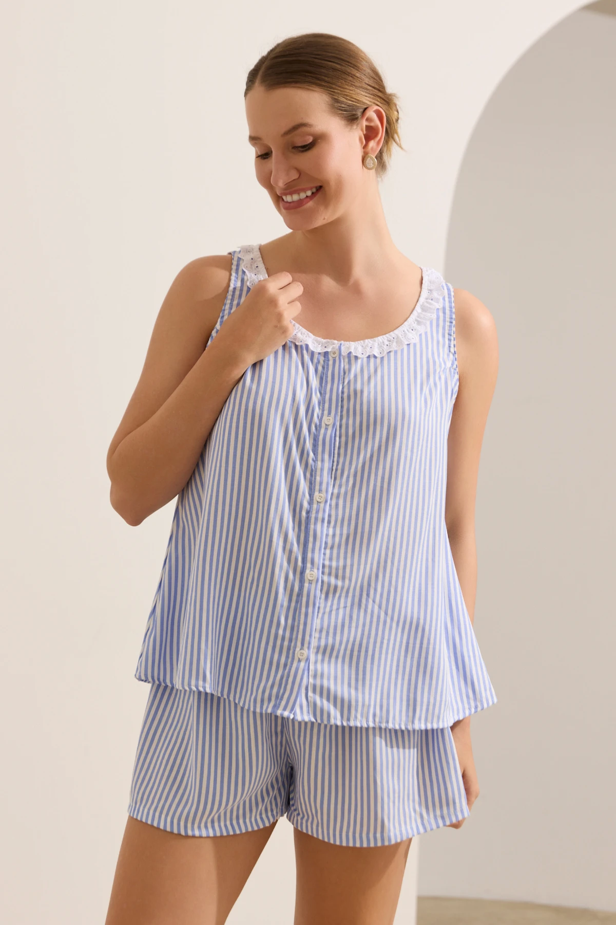 Confeccionado em viscose (tecido plano), o Short Doll Listrado com Renda tem toque macio e caimento estruturado.