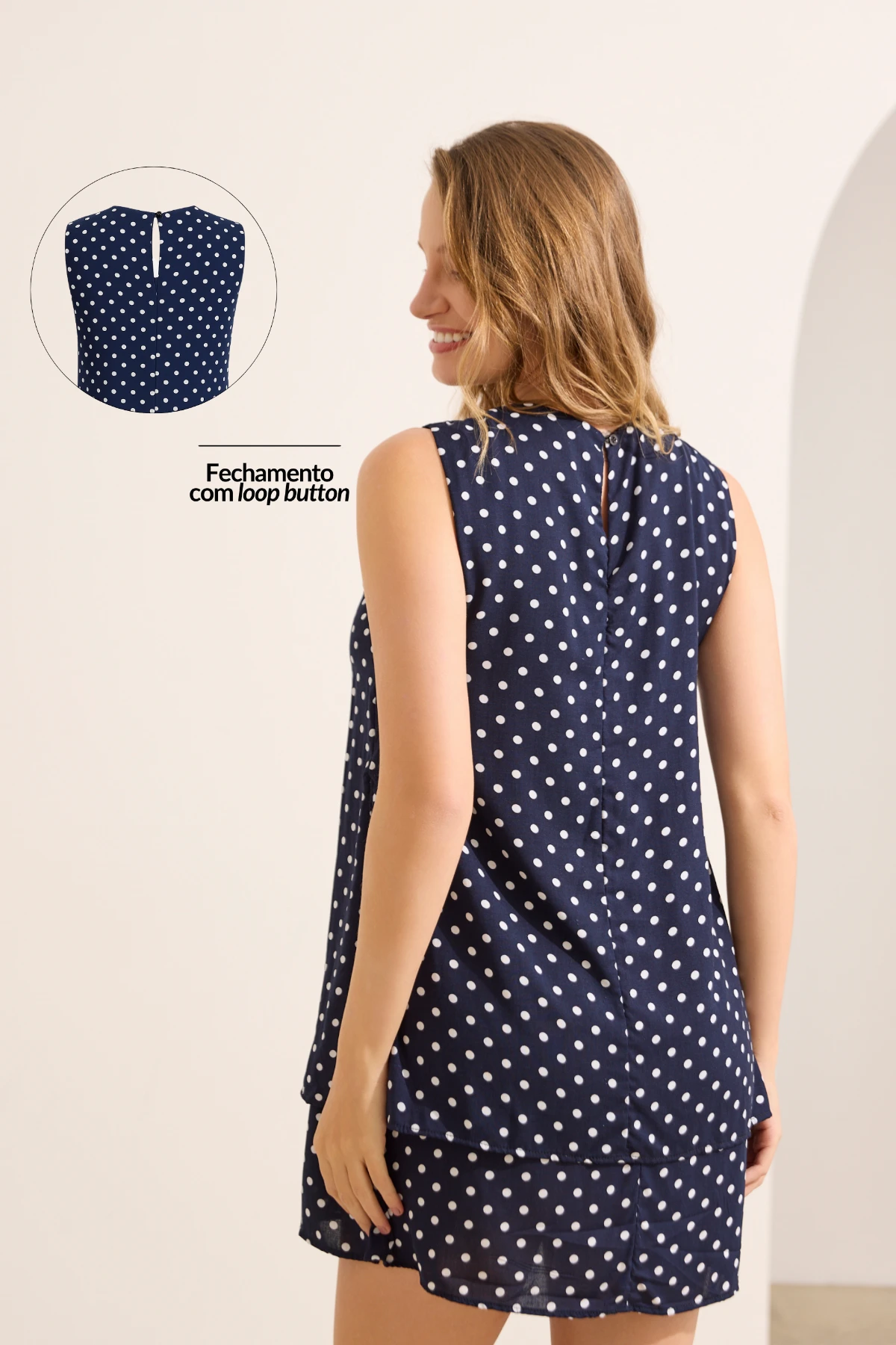 Confeccionado em tecido leve e fluido. Toque suave.