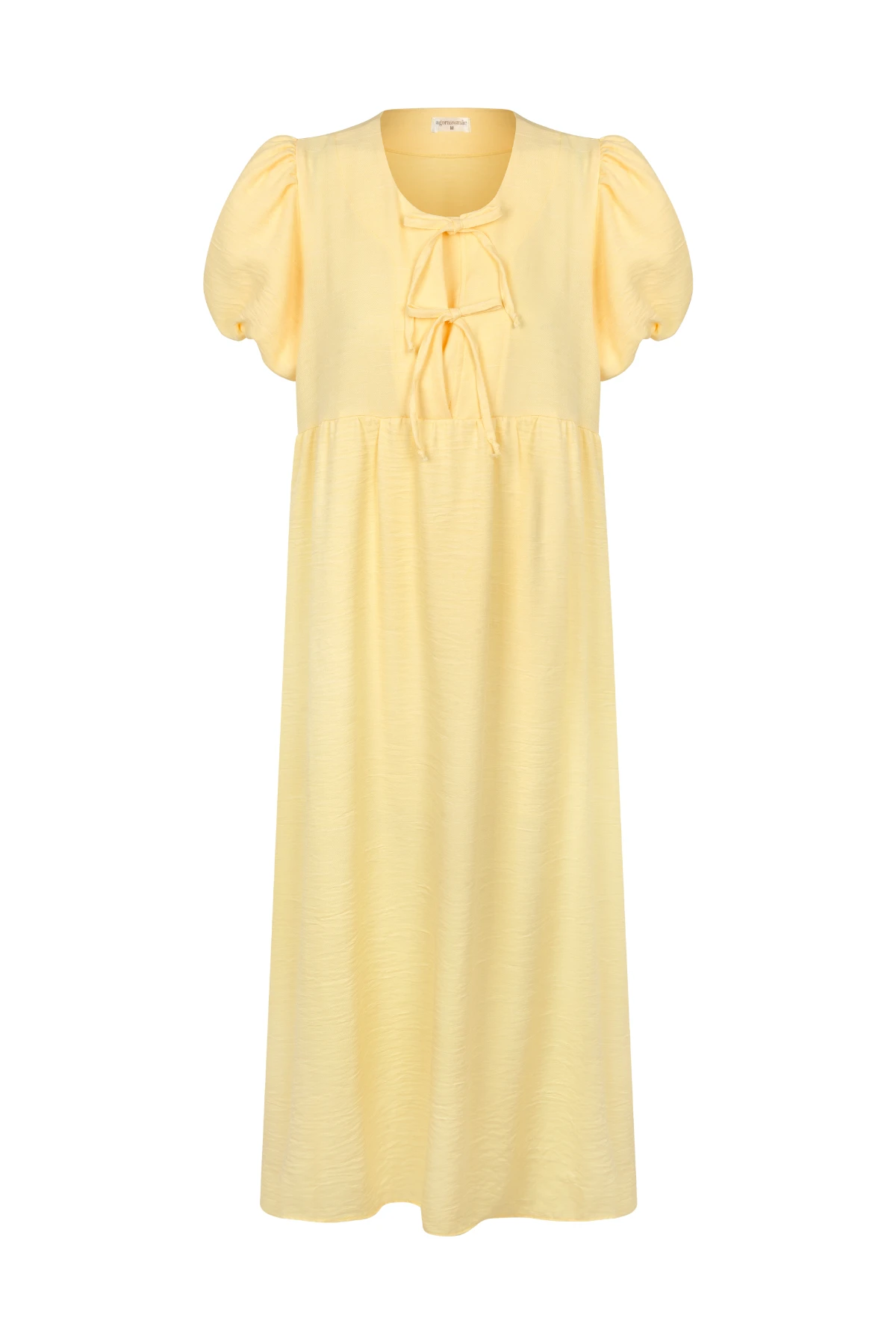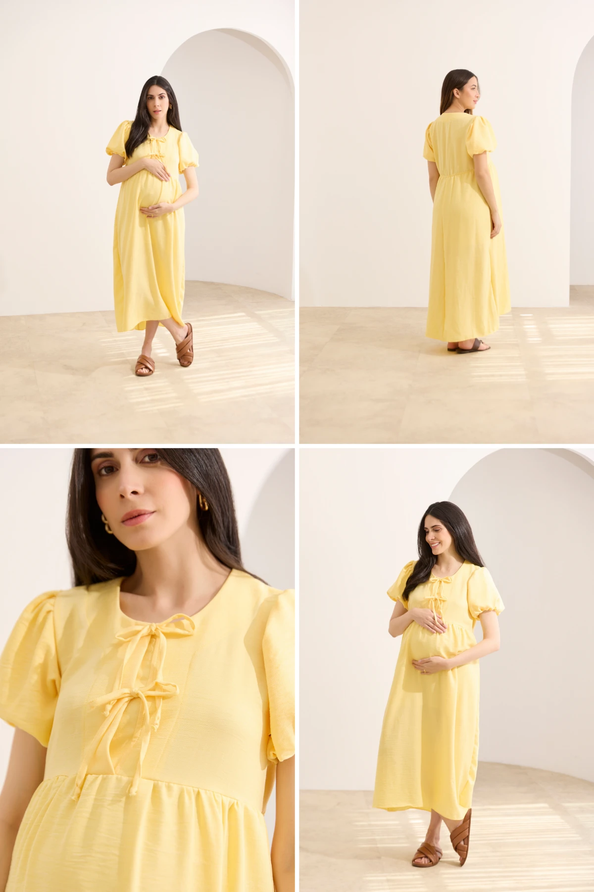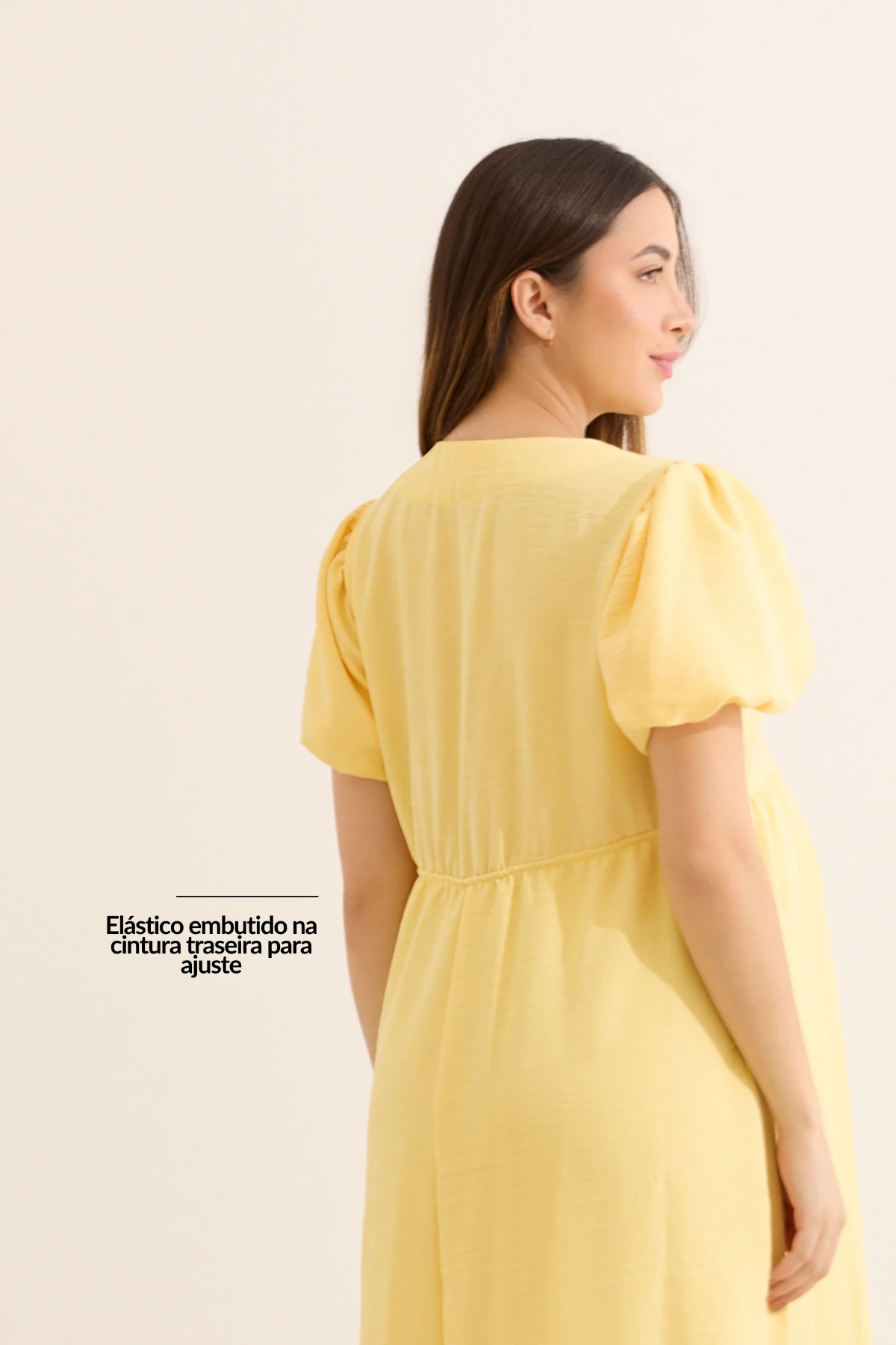 Vestido midi para amamentar com manga bufante e decote ajustável por amarração, que facilita o acesso durante a amamentação.