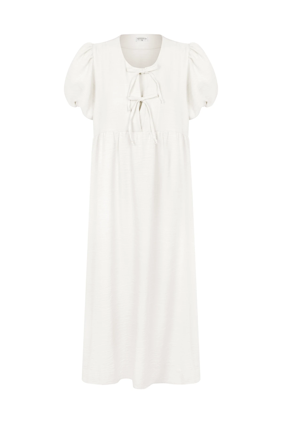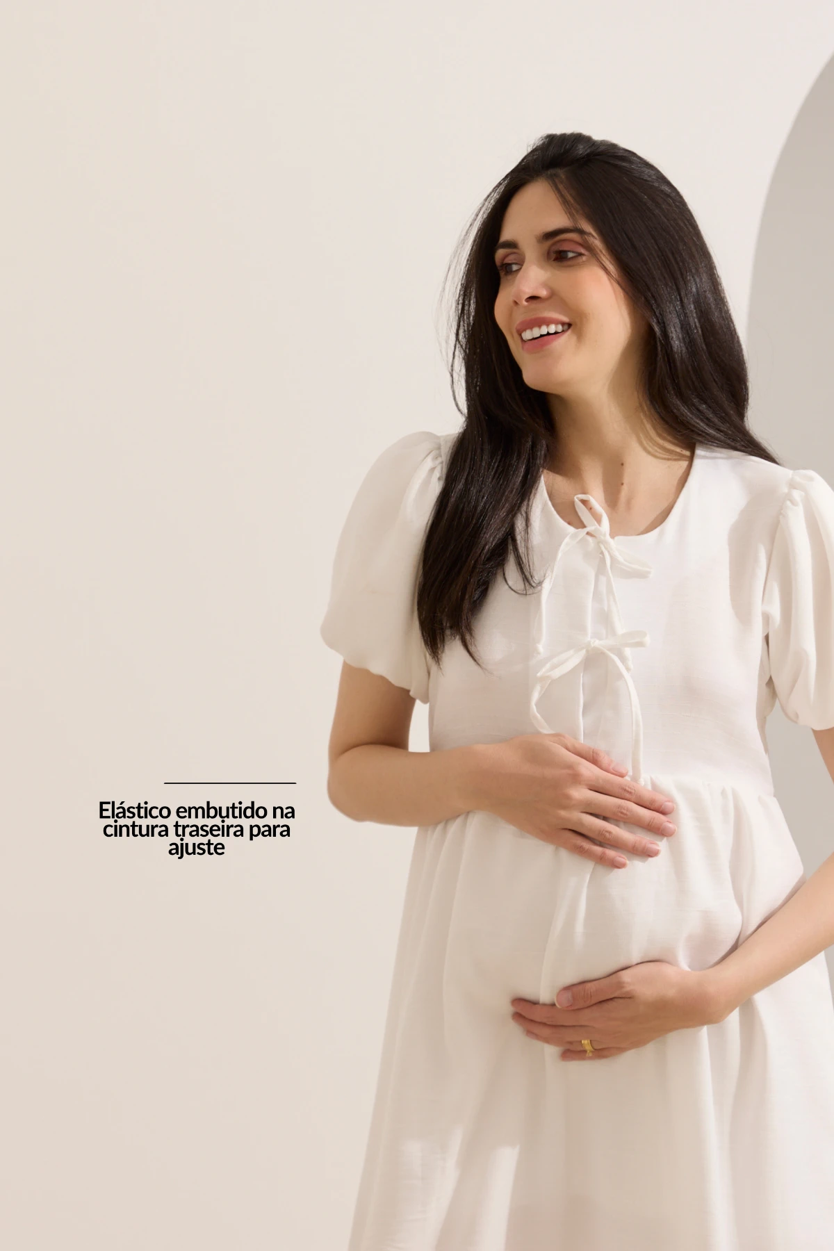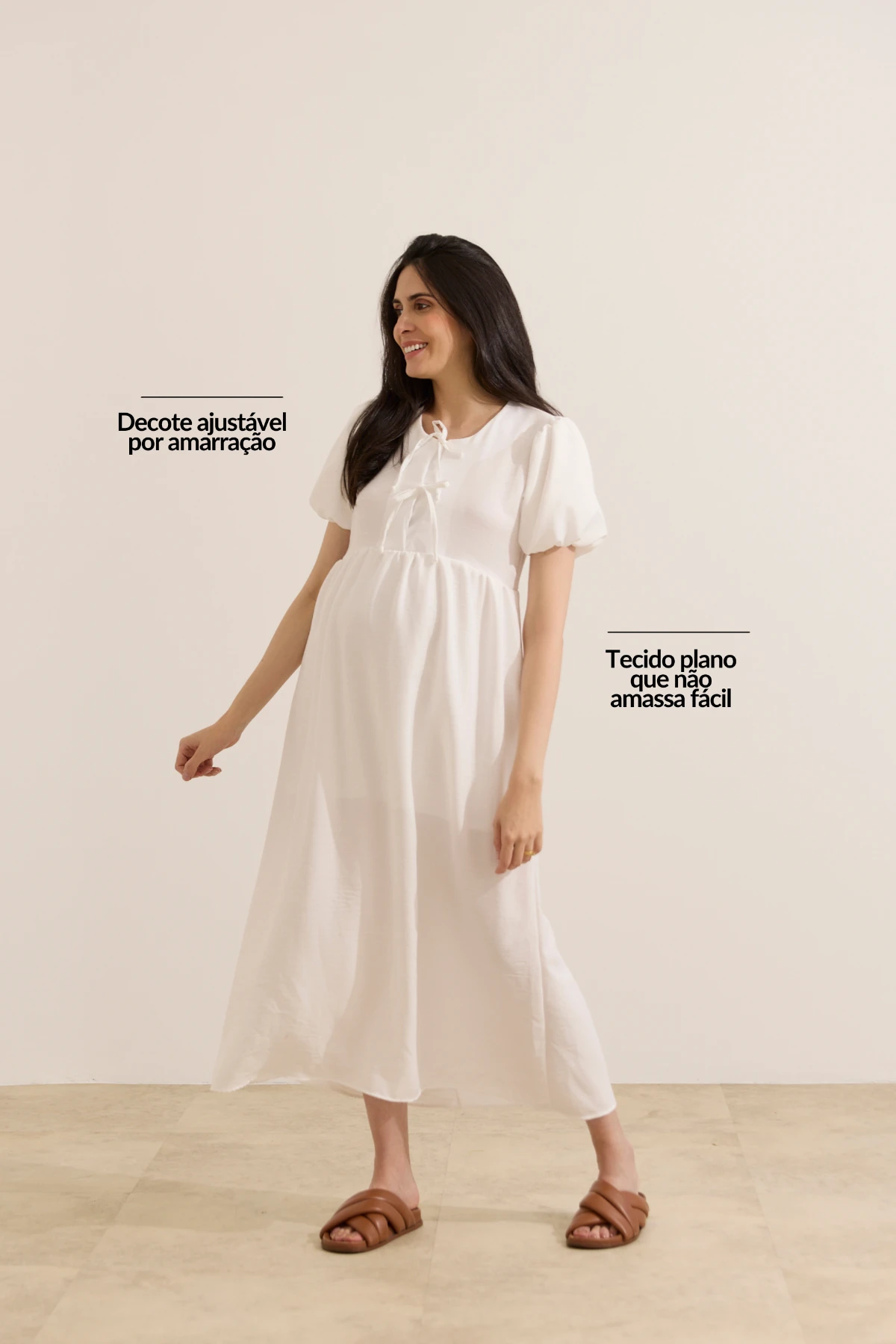 Vestido midi para amamentar com manga bufante e decote ajustável por amarração, que facilita o acesso durante a amamentação.