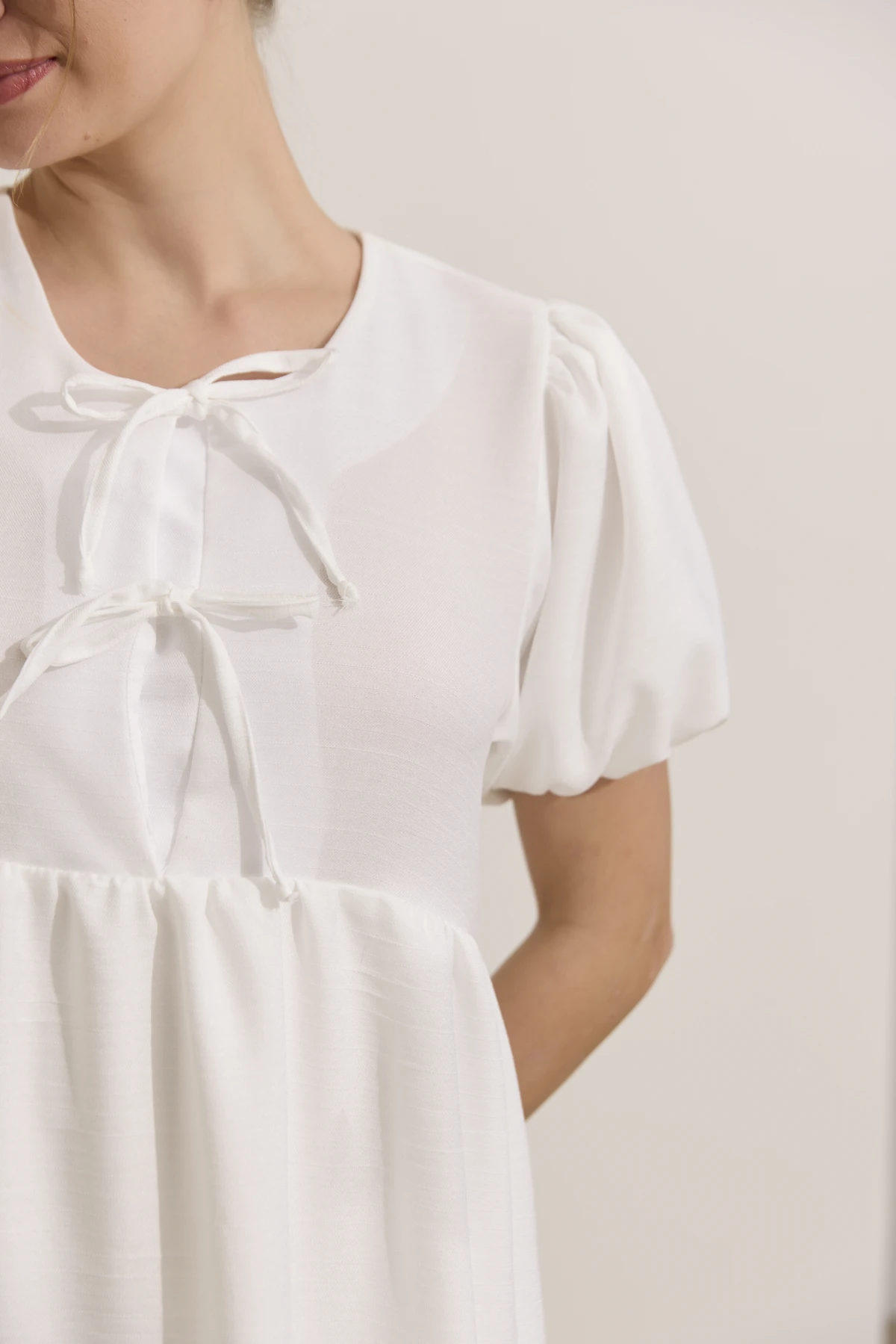As mangas bufantes acrescentam presença e movimento ao visual. O acabamento é limpo e de fácil manutenção, pensado para manter o caimento e a aparência ao longo do tempo.