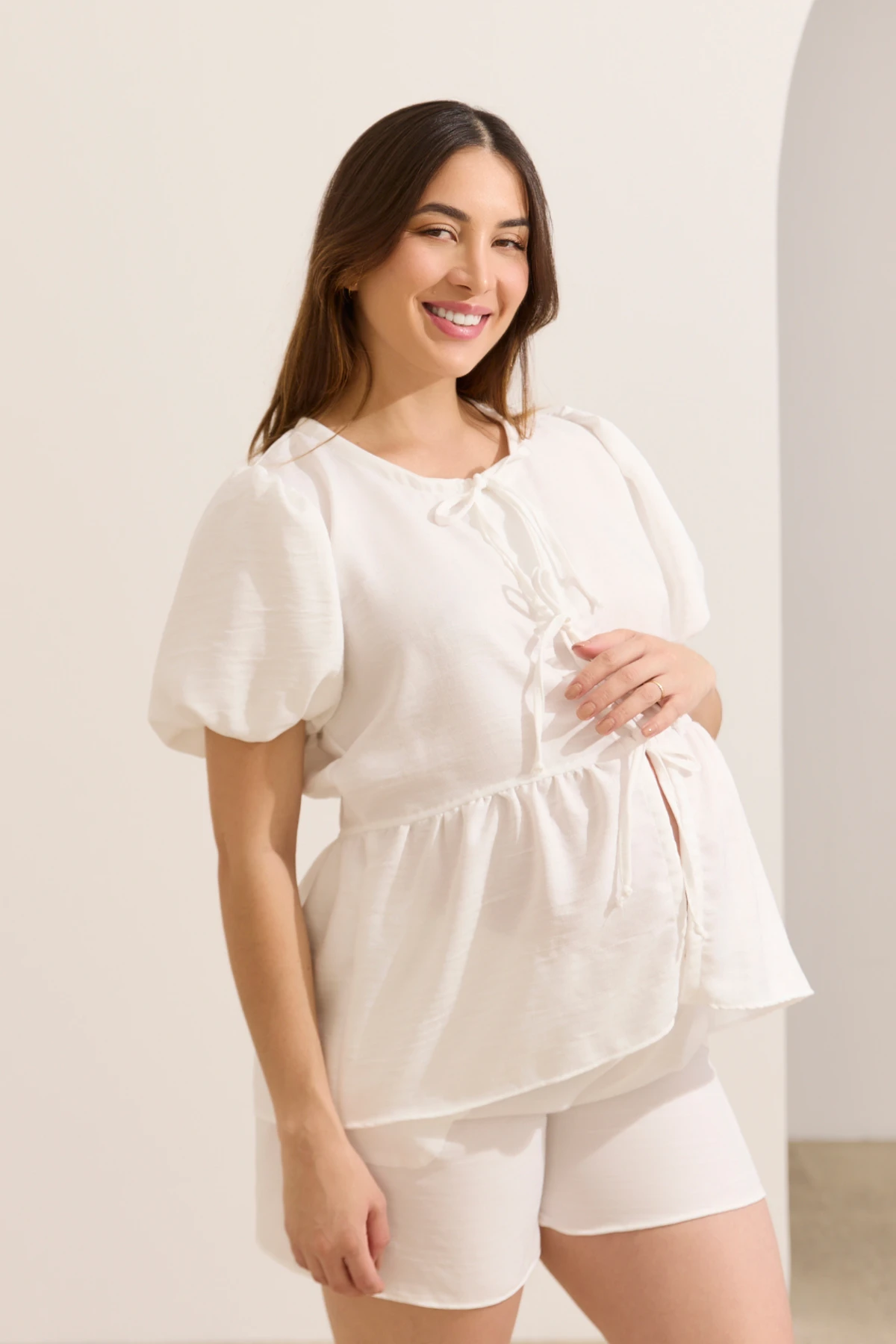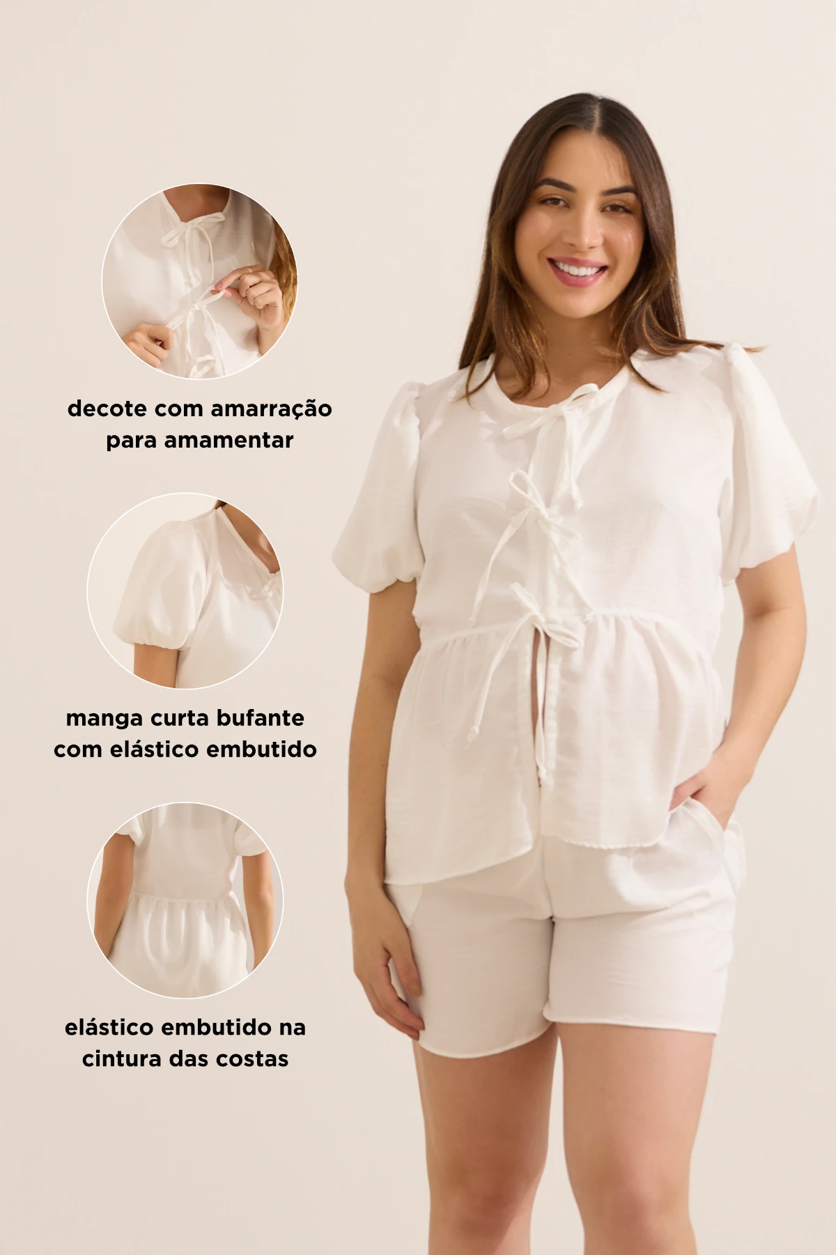 Conjunto de short e blusa, feito em tecido plano que não amassa com facilidade. A blusa tem mangas bufantes, elástico na cintura na parte das costas e abertura na frente com cordão do mesmo tecido que fornece um ajuste personalizado para uma amamentação prática. O short possui bolsos funcionais na frente, elástico embutido no cós além de regulagem interna com cordão do mesmo tecido que fica escondido, ajustando-se conforme o crescimento da barriga na gestação. As peças são perfeitas para serem usadas juntas ou separadas para compor looks únicos em qualquer fase da maternidade.