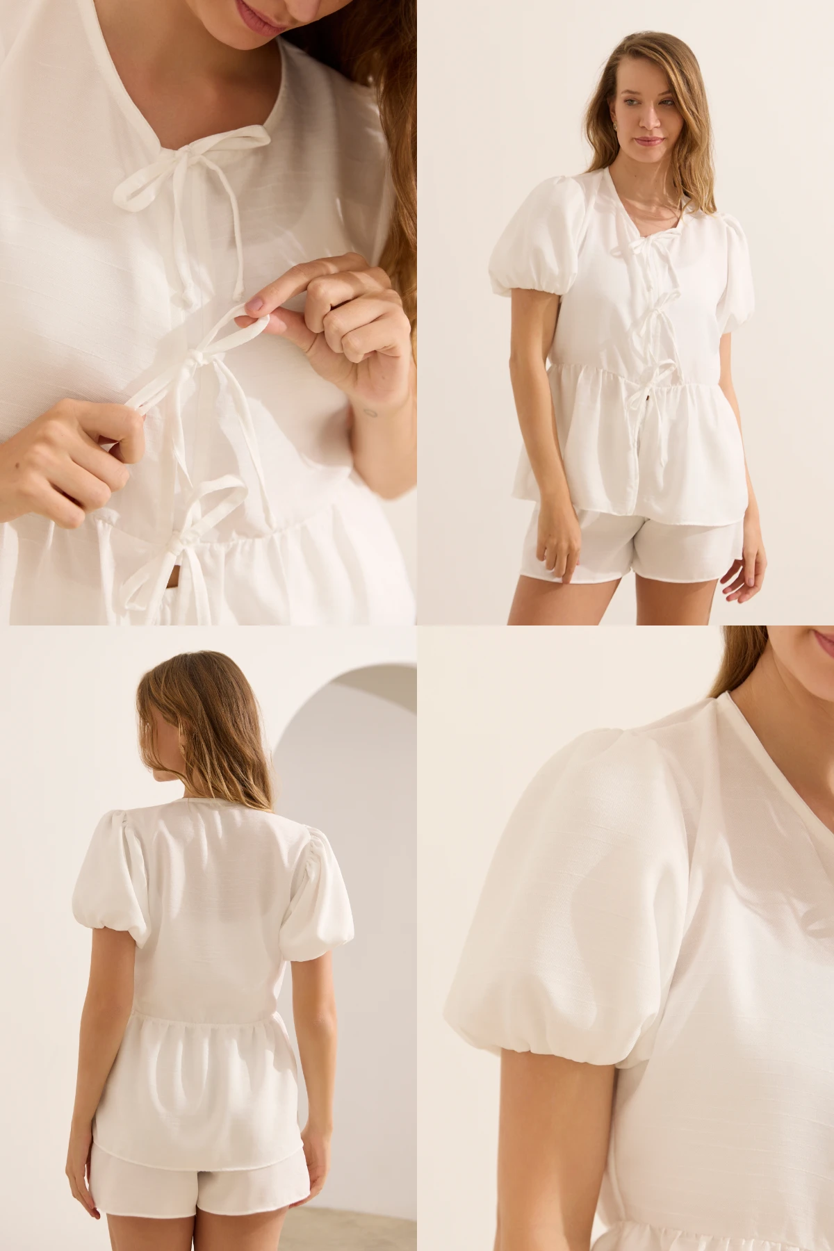 Conjunto ideal para usar em qualquer fase da maternidade, conta com 1 short e 1 blusa de tecido plano. A blusa de mangas bufantes tem abertura na frente com cordão do mesmo tecido e elástico embutido na cintura da parte das costas. O short tem elástico embutido no cós além de regulagem interna com cordão do mesmo tecido e bolsos funcionais na parte da frente. Produzido em tecido leve e macio, combine com diferentes peças.