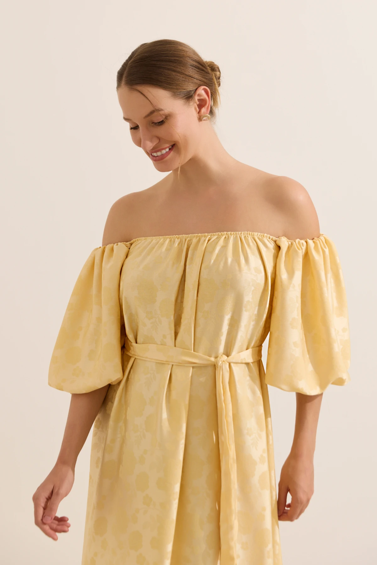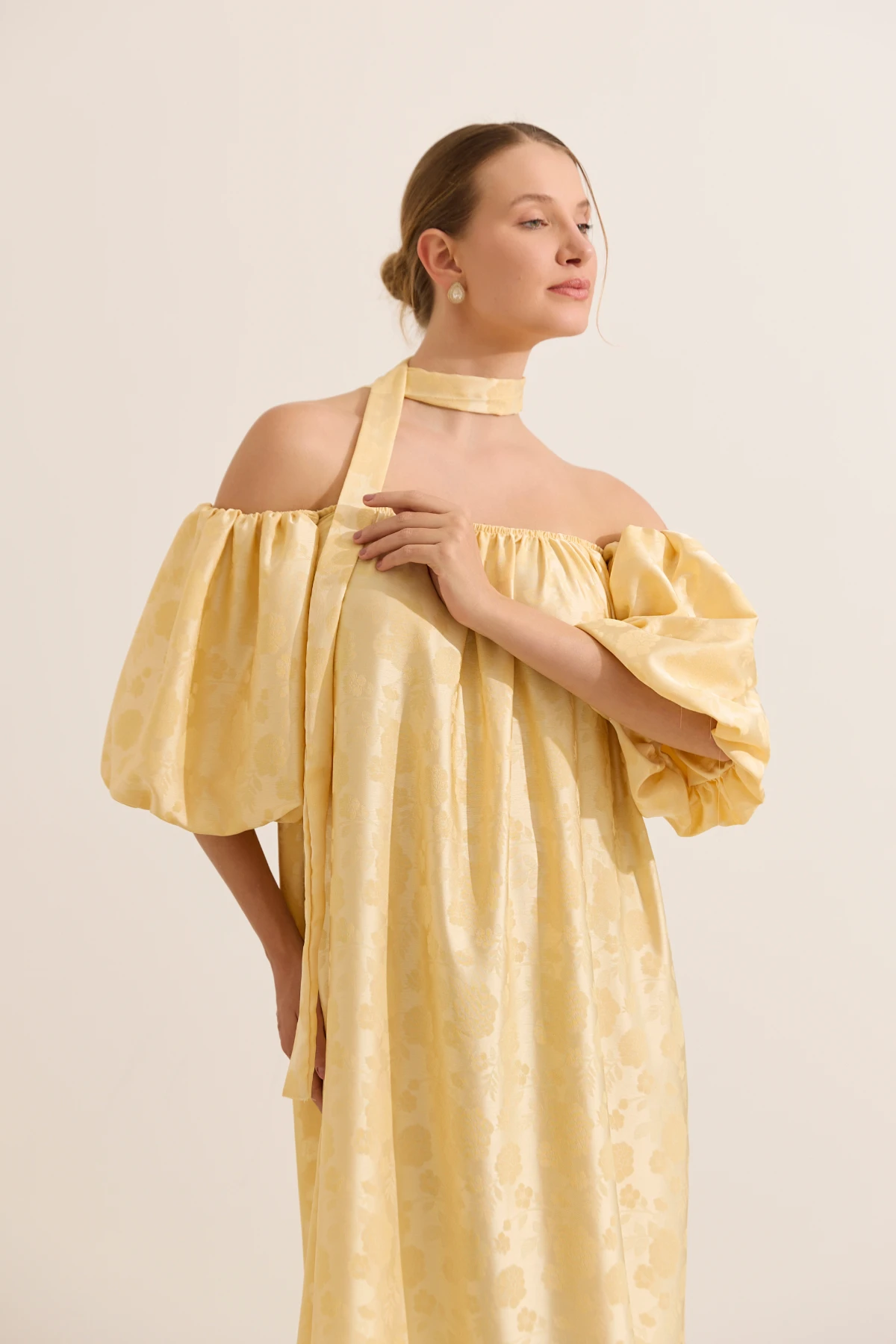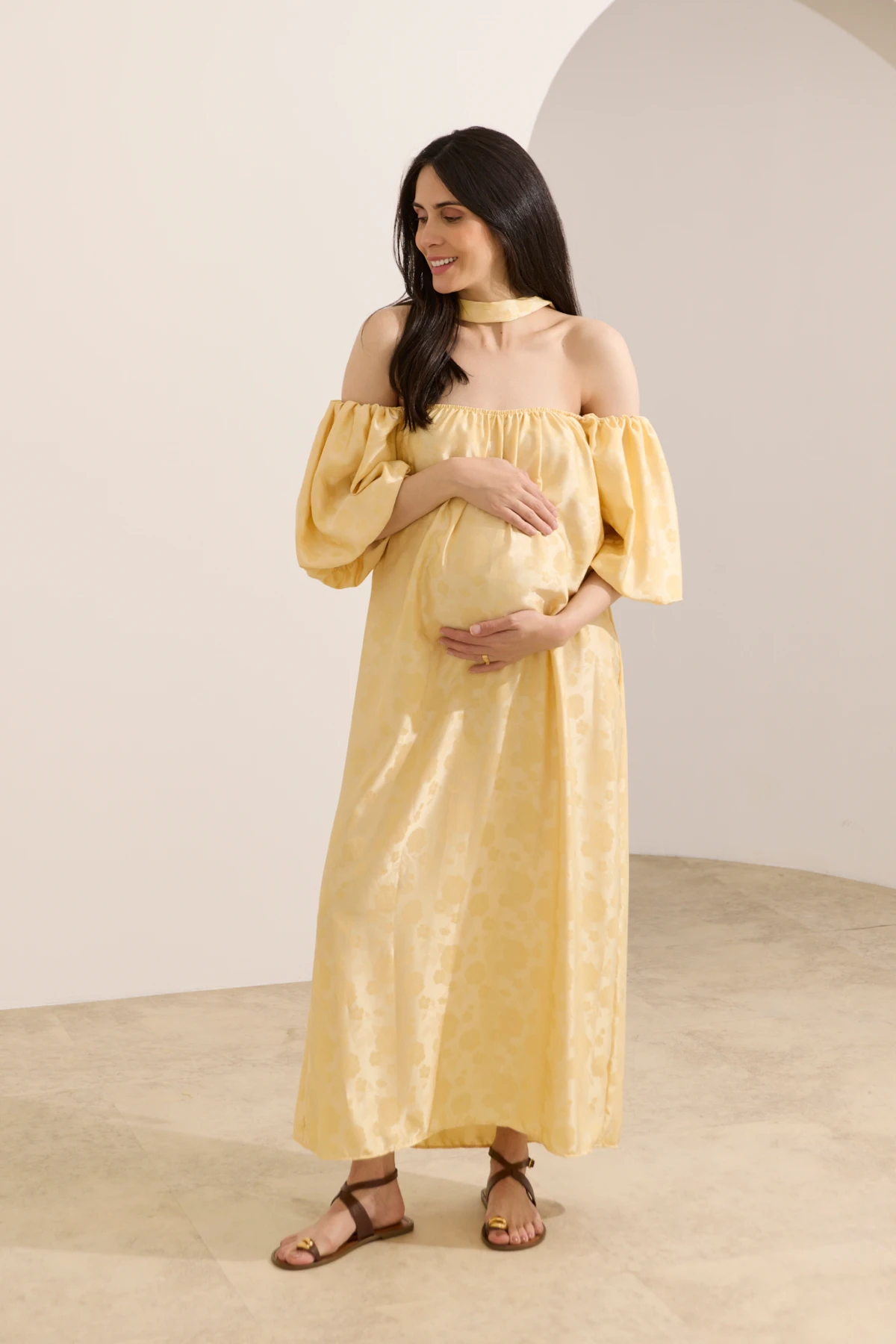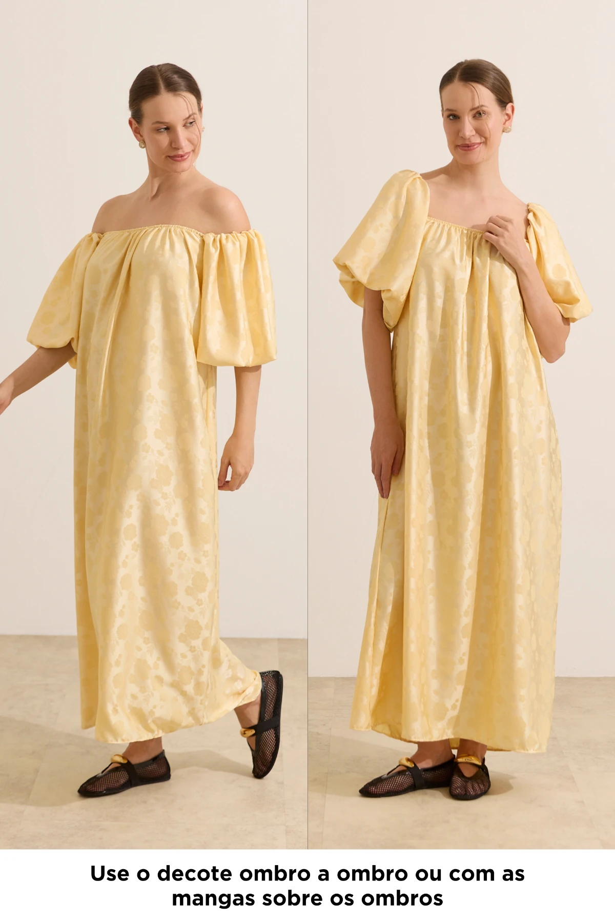 Vestido longo com decote versátil: ombro a ombro ou permite usar as mangas sobre os ombros. Produzido em tecido plano, modelagem soltinha para acompanhar a gestação. Com elástico embutido no decote reto e nas mangas bufantes, que se ajustam de maneira confortável ao corpo. O vestido é perfeito para momentos especiais, como chá de bebê ou ensaio fotográfico. Permite amamentar com facilidade, basta baixar o decote que é flexível. Acompanha faixa para usar de diferentes formas.