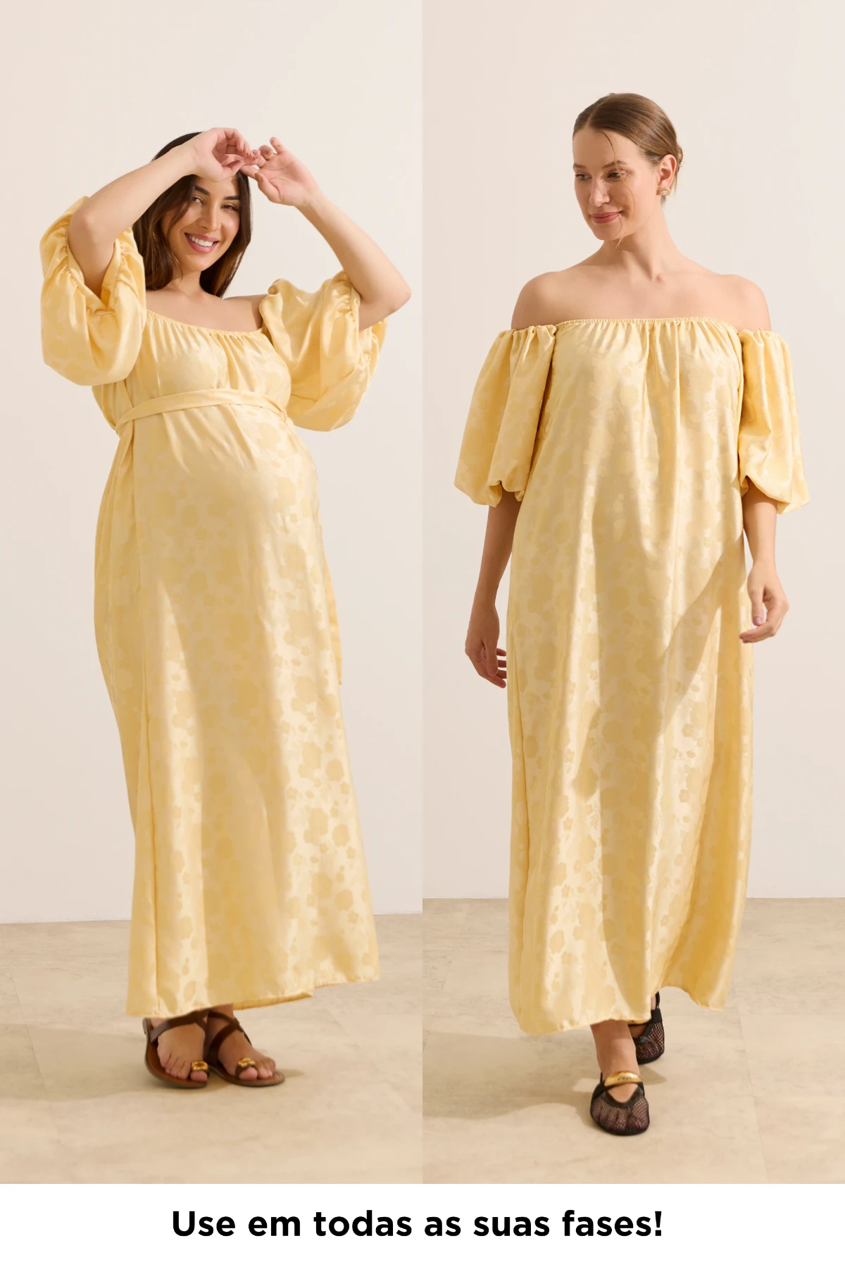 Vestido longo com decote versátil: ombro a ombro ou permite usar as mangas sobre os ombros além de acompanhar uma faixa solta para usar de diferentes formas, seja na cintura destacando ainda mais a delicadeza da gestação ou no pescoço para um look unico. Produzido em tecido plano texturizado, que não amassa com facilidade, possui modelagem soltinha para acompanhar toda a gestação. Com elástico embutido no decote reto e nas mangas bufântes, que se ajustam de maneira confortavél ao corpo. O vestido é perfeito para momentos especiais, como chá de bebê ou ensaio fotográfico. Permite amamentar com facilidade, basta baixar o decote que é flexível.