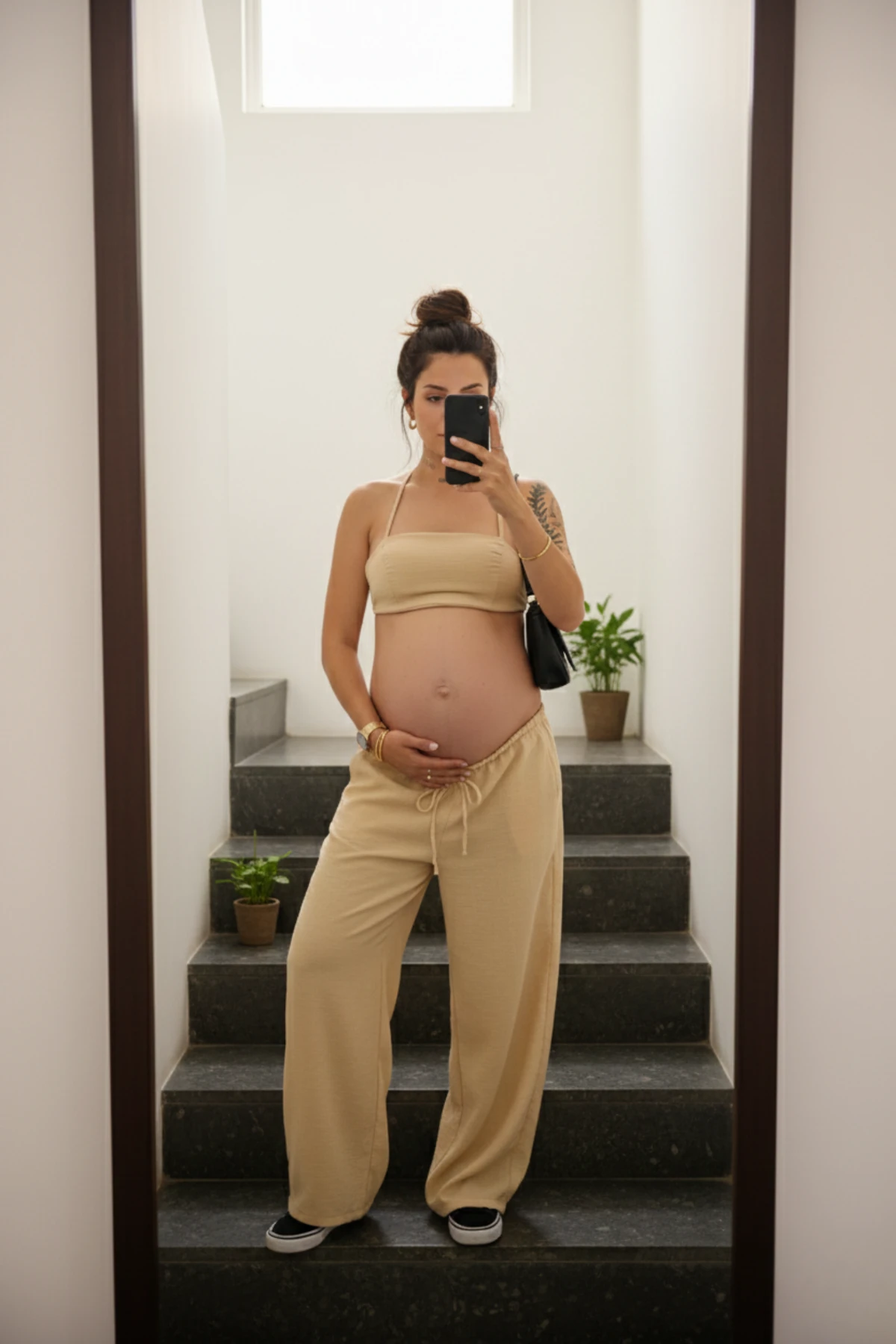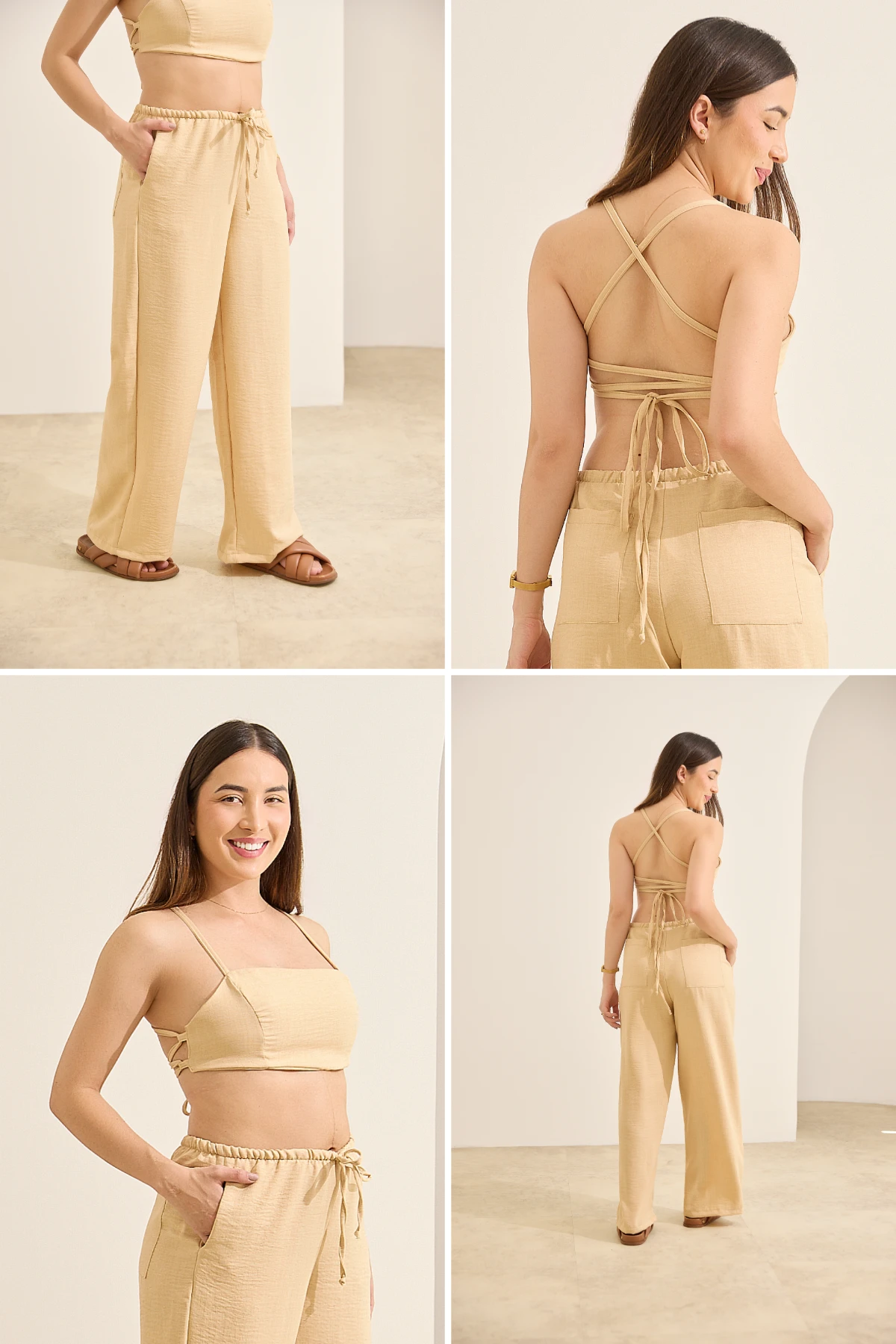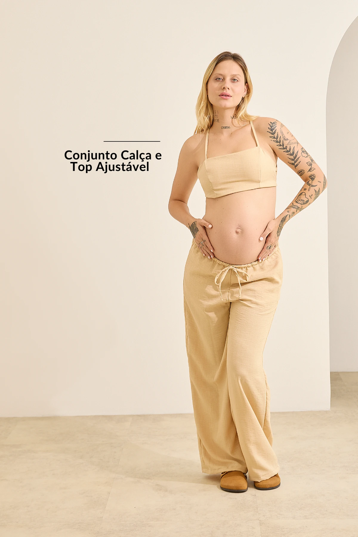 Conjunto: Top cropped + Calça pantalona (Conjunto Calça e Top Ajustável — Natural).
