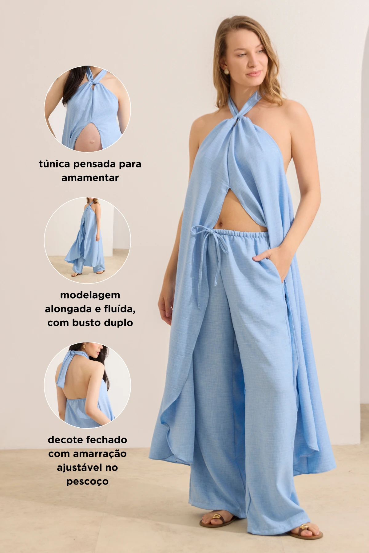 Conjunto composto por calça, túnica alongada e top frente única duplo, pensado para acompanhar gestação, amamentação e pós-parto.
