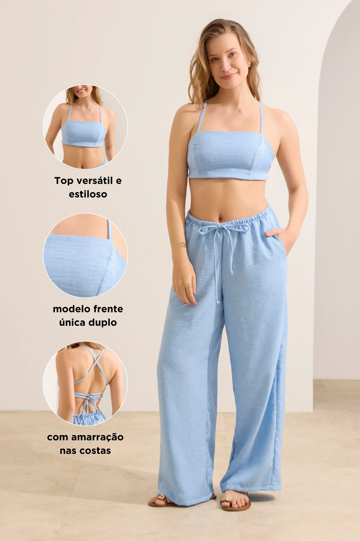 O top frente única duplo, com amarração nas costas, funciona como peça principal em dias quentes ou como sobreposição para compor looks com a túnica e a calça. Permite combinações variadas para ensaios, saídas e uso diário.