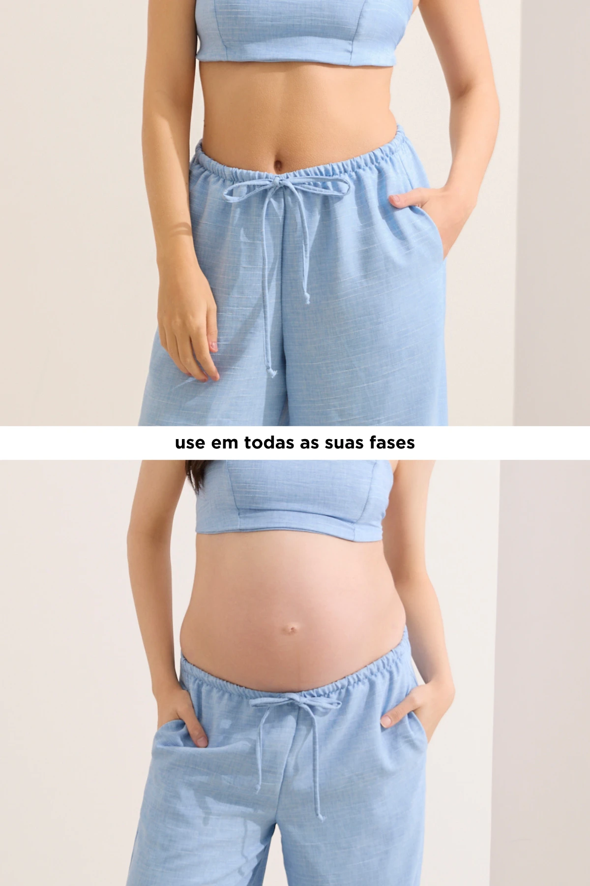 Ajuste que acompanha o corpo: elástico + amarração na calça para adaptar ao crescimento da barriga.