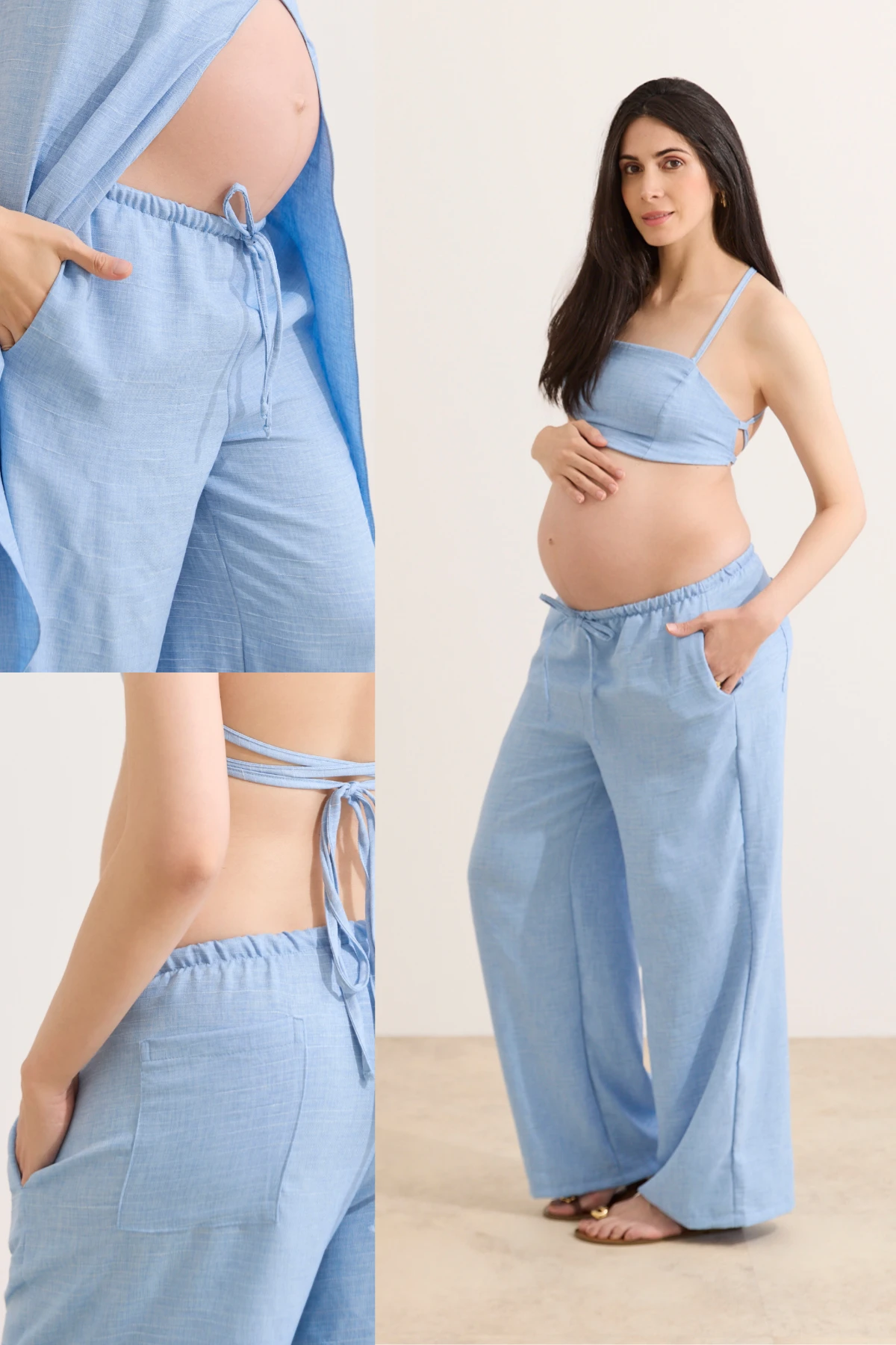 A calça de corte reto traz elástico embutido na cintura e cordão/amarração do mesmo tecido para regular o ajuste conforme a barriga cresce. Bolsos dianteiros e traseiros adicionam funcionalidade para a rotina da maternidade. O corte prioriza liberdade de movimento e conforto prolongado.