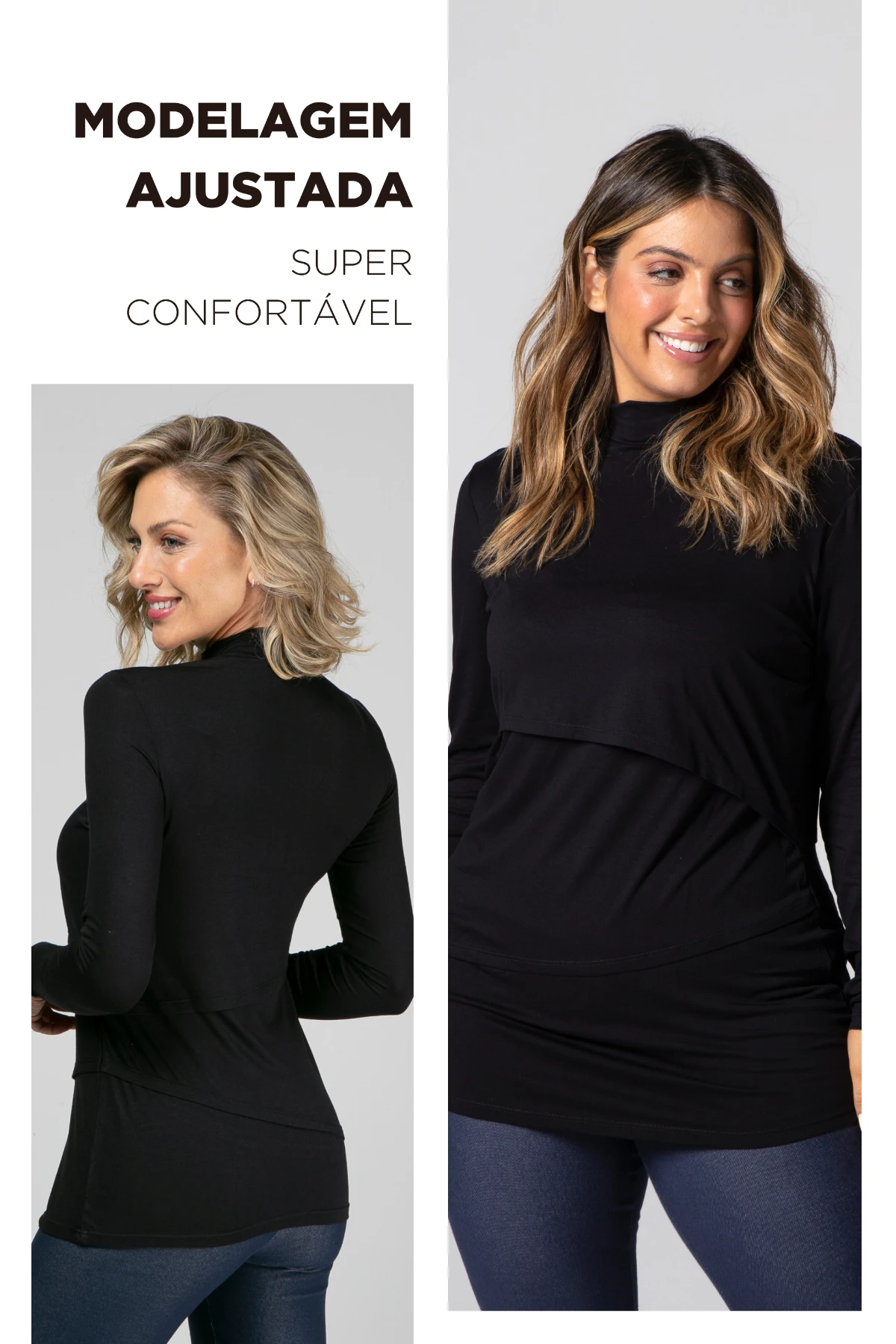 Conforto: modelagem ajustada que não aperta e comprimento pensado para cobertura e versatilidade.