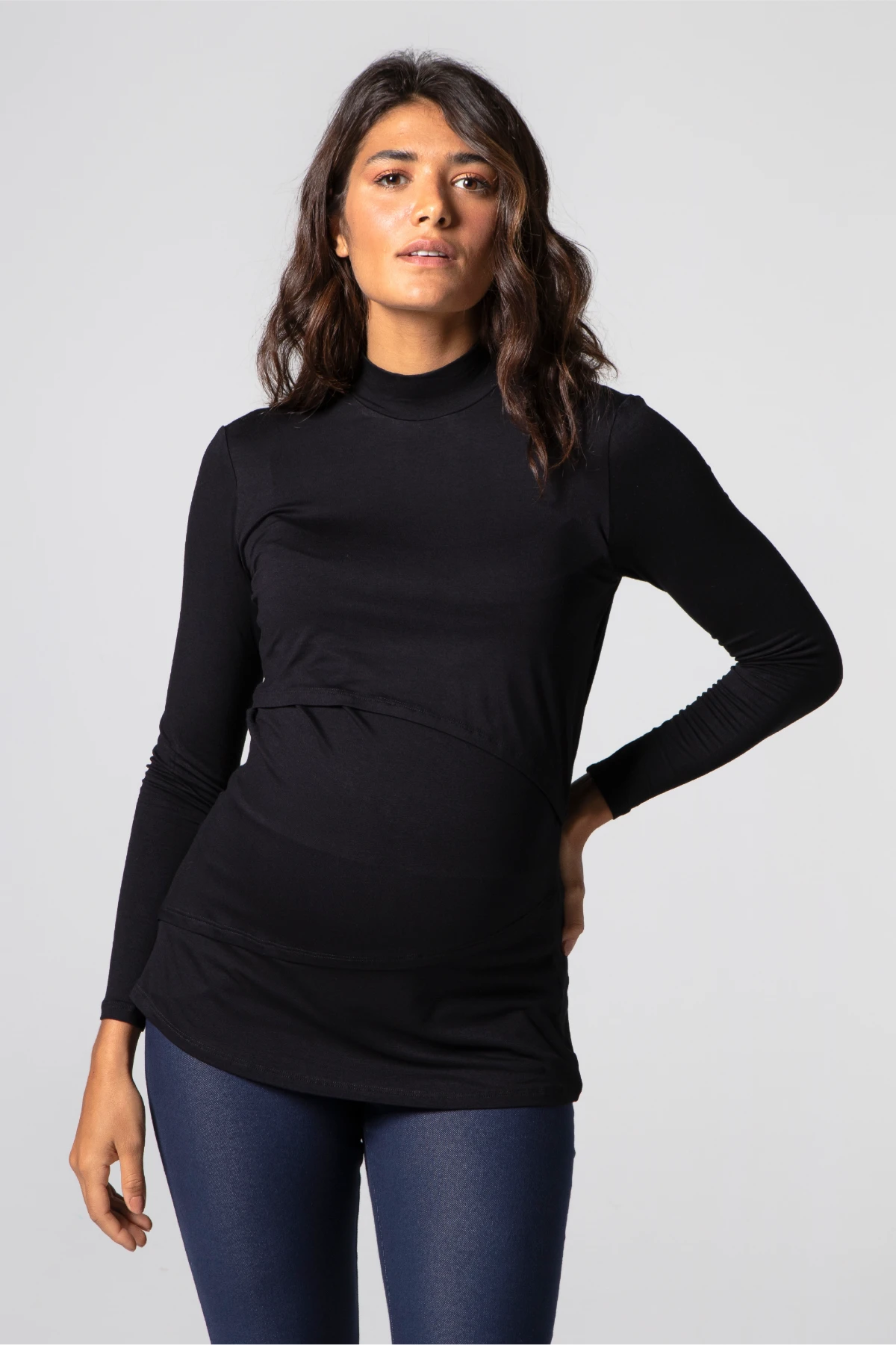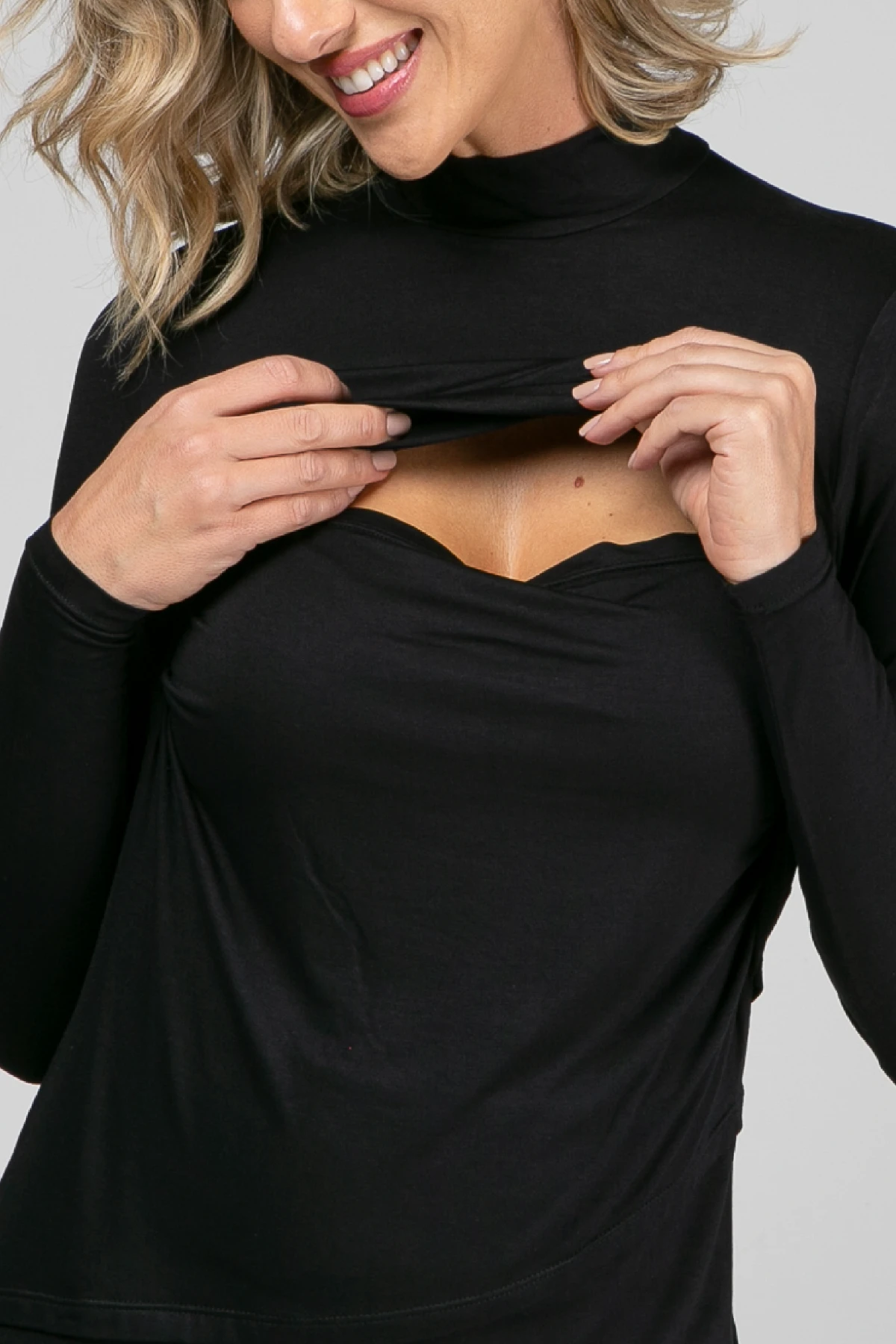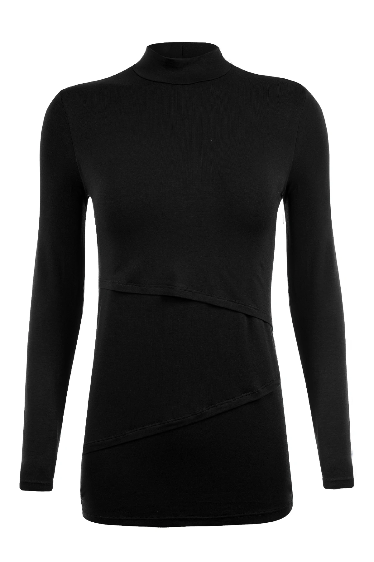 A Blusa Gestante e Amamentação Golinha Manga Longa traz recortes assimétricos e sobreposição discreta para permitir o acesso ao seio sem abrir a peça.