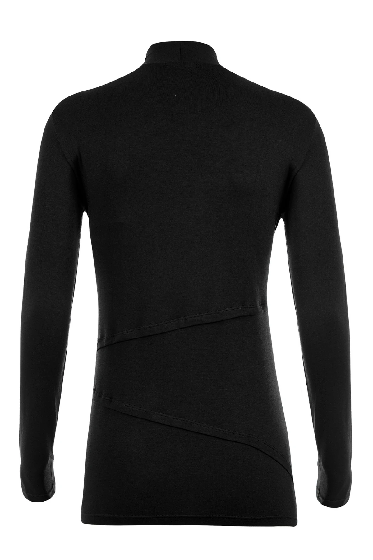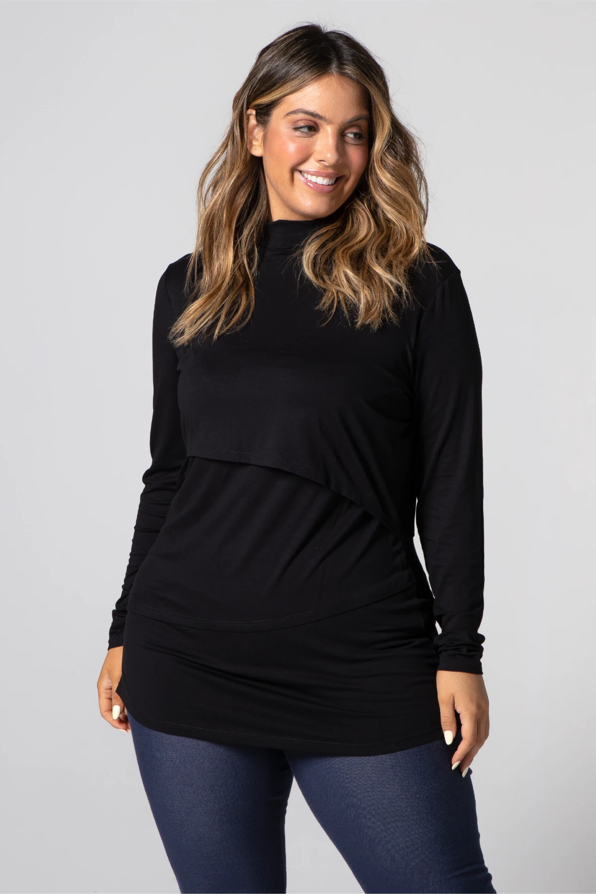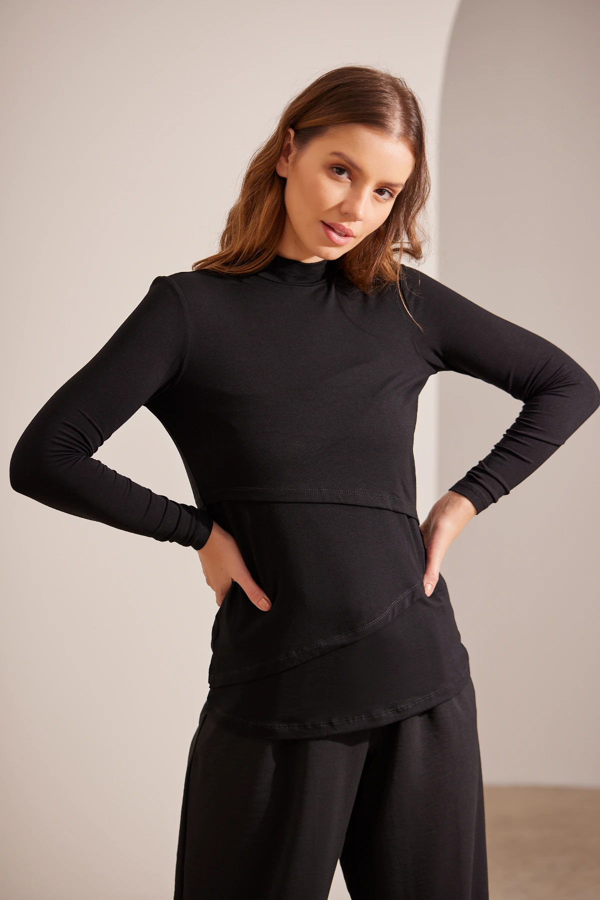 A Blusa Gestante e Amamentação Golinha Manga Longa traz recortes assimétricos e sobreposição discreta para permitir o acesso ao seio sem abrir a peça.