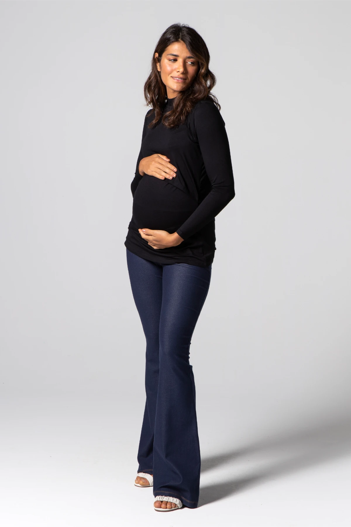Feita em viscolycra super elástica, tem modelagem ajustada e comprimento abaixo do quadril — veste da gestação ao pós-parto com conforto e acabamento moderno.