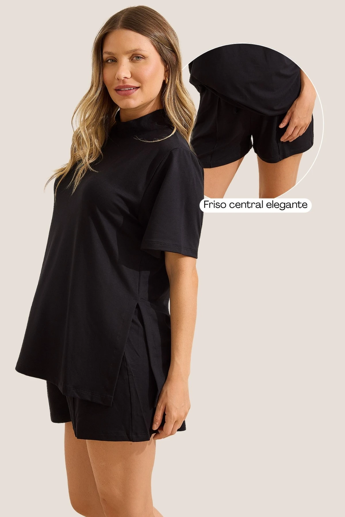 Conta com modelagem reta e soltinha, em comprimento ideal. O recorte com friso central traz um toque alinhado, inspirado na alfaiataria.