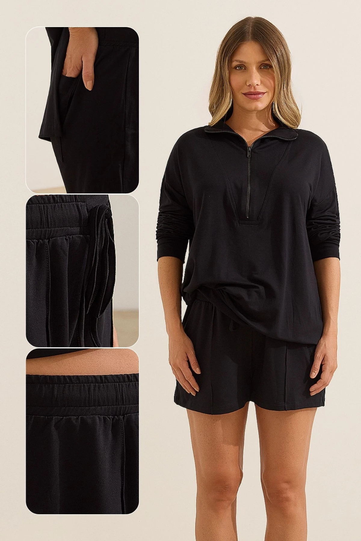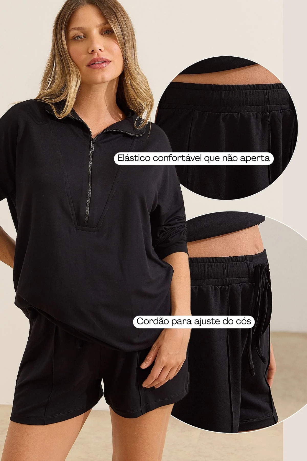 O cós com elástico embutido na cintura e cordão para regulagem permite ajuste da gestação ao pós-parto.