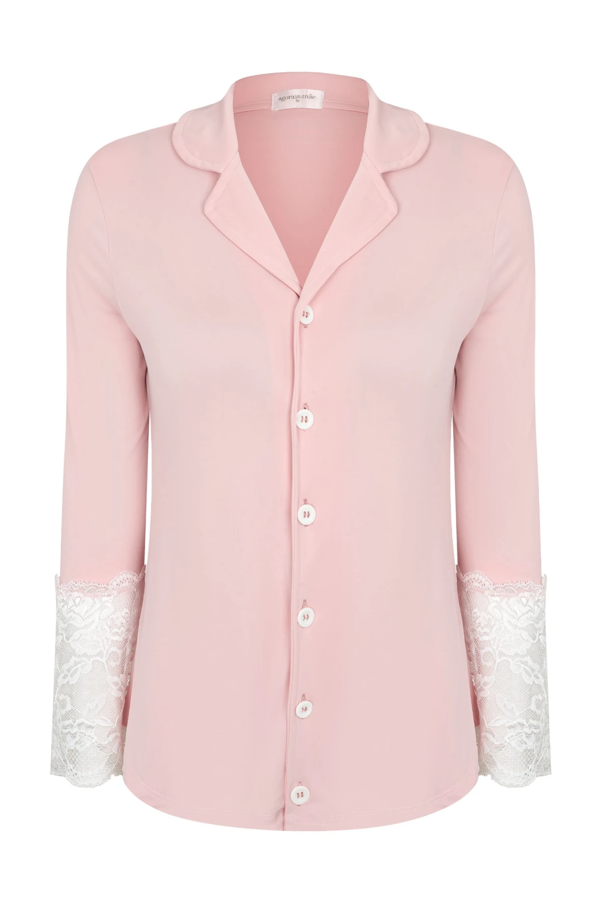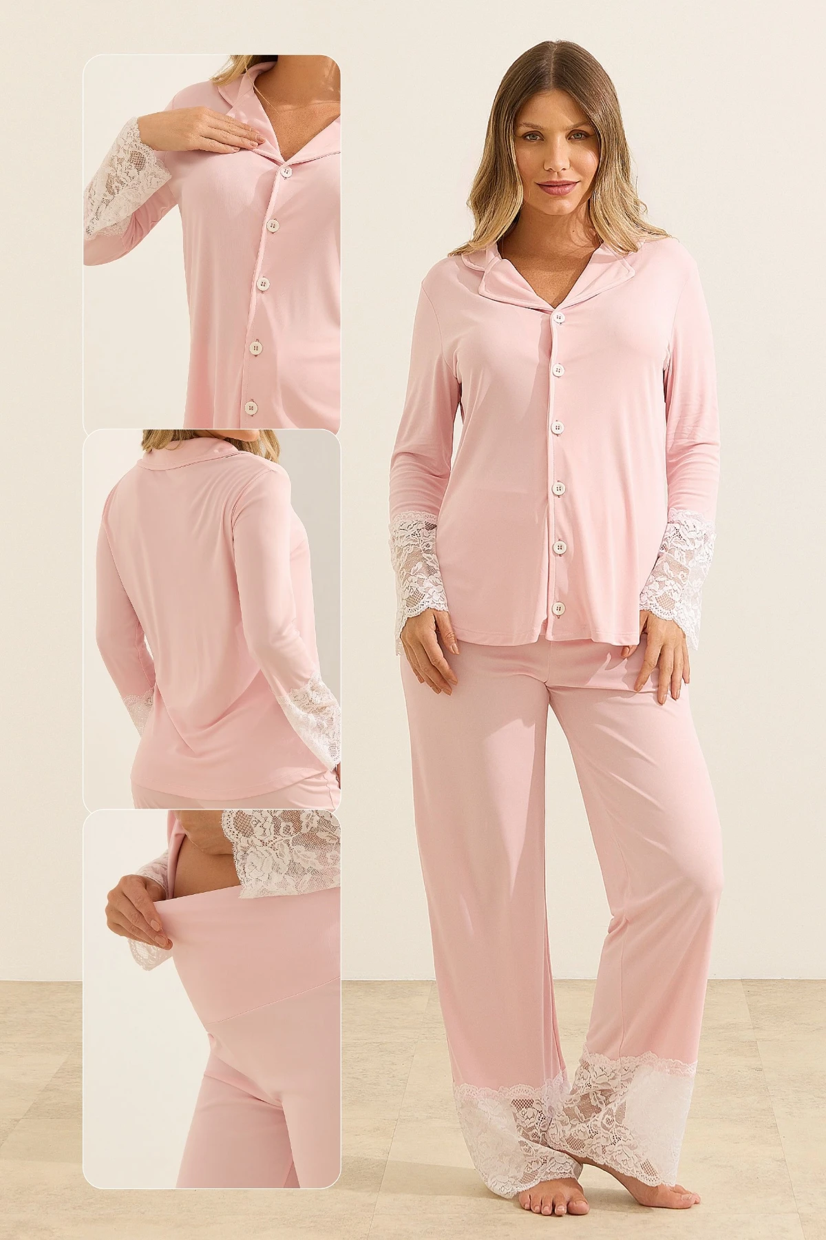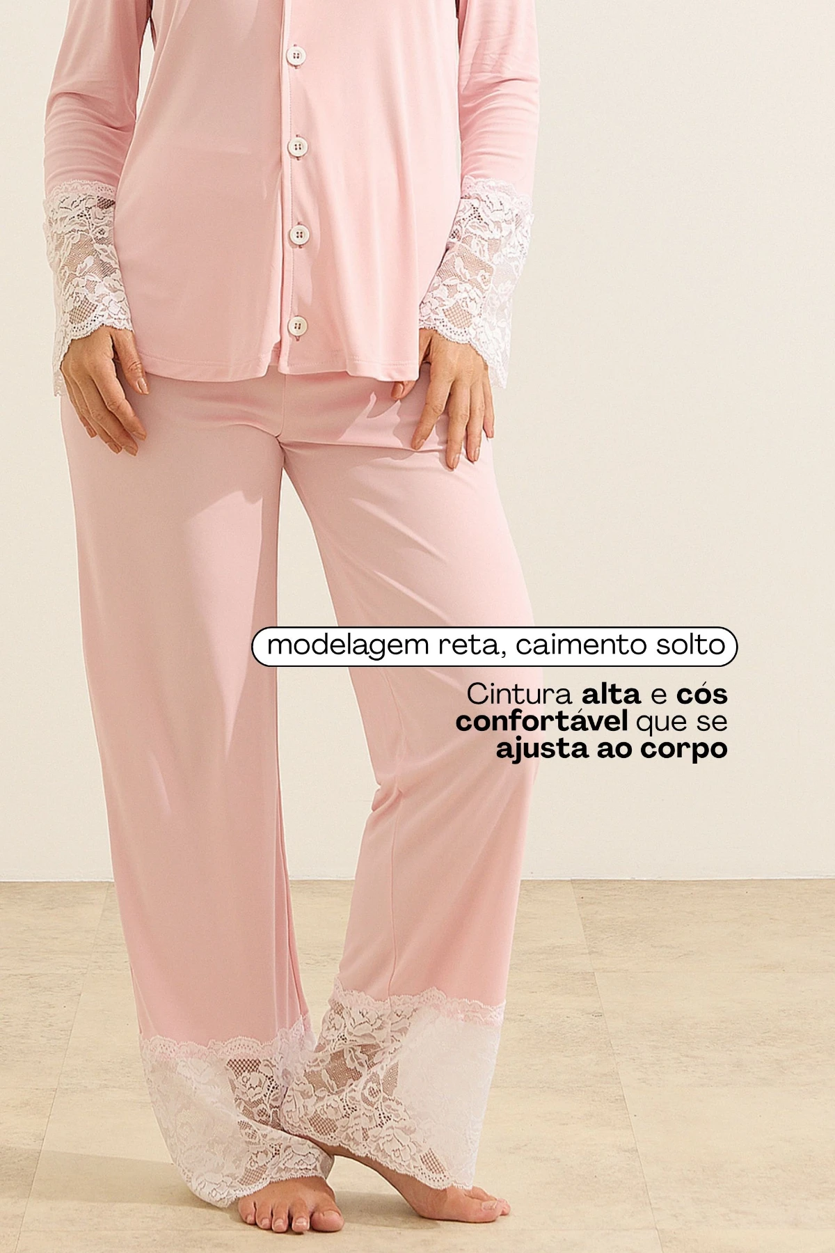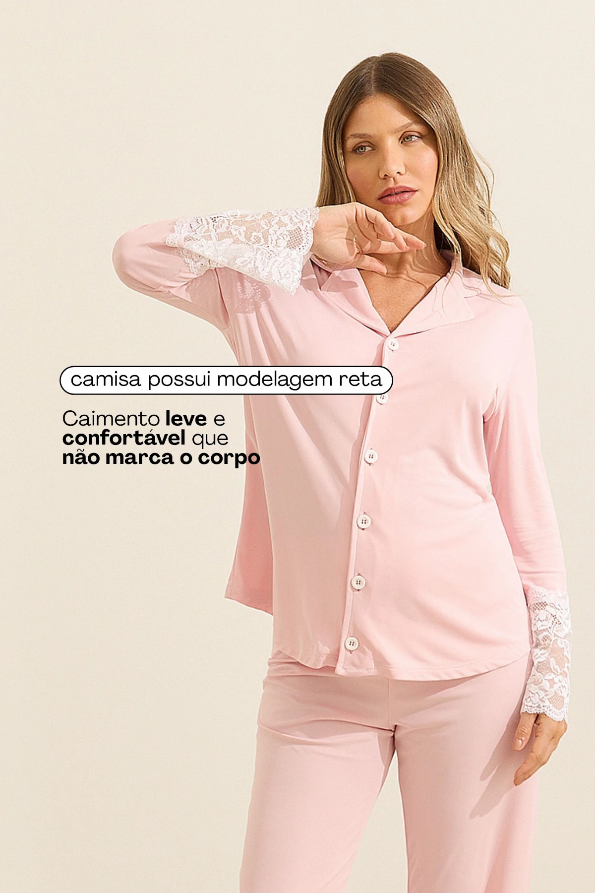 O Pijama Americano 100% Poliamida com Renda une modelagem clássica, toque sedoso e acabamento delicado. Com camisa de abertura frontal funcional para amamentação e calça de caimento fluido com detalhes em renda, é confortável e perfeito para todos os momentos.