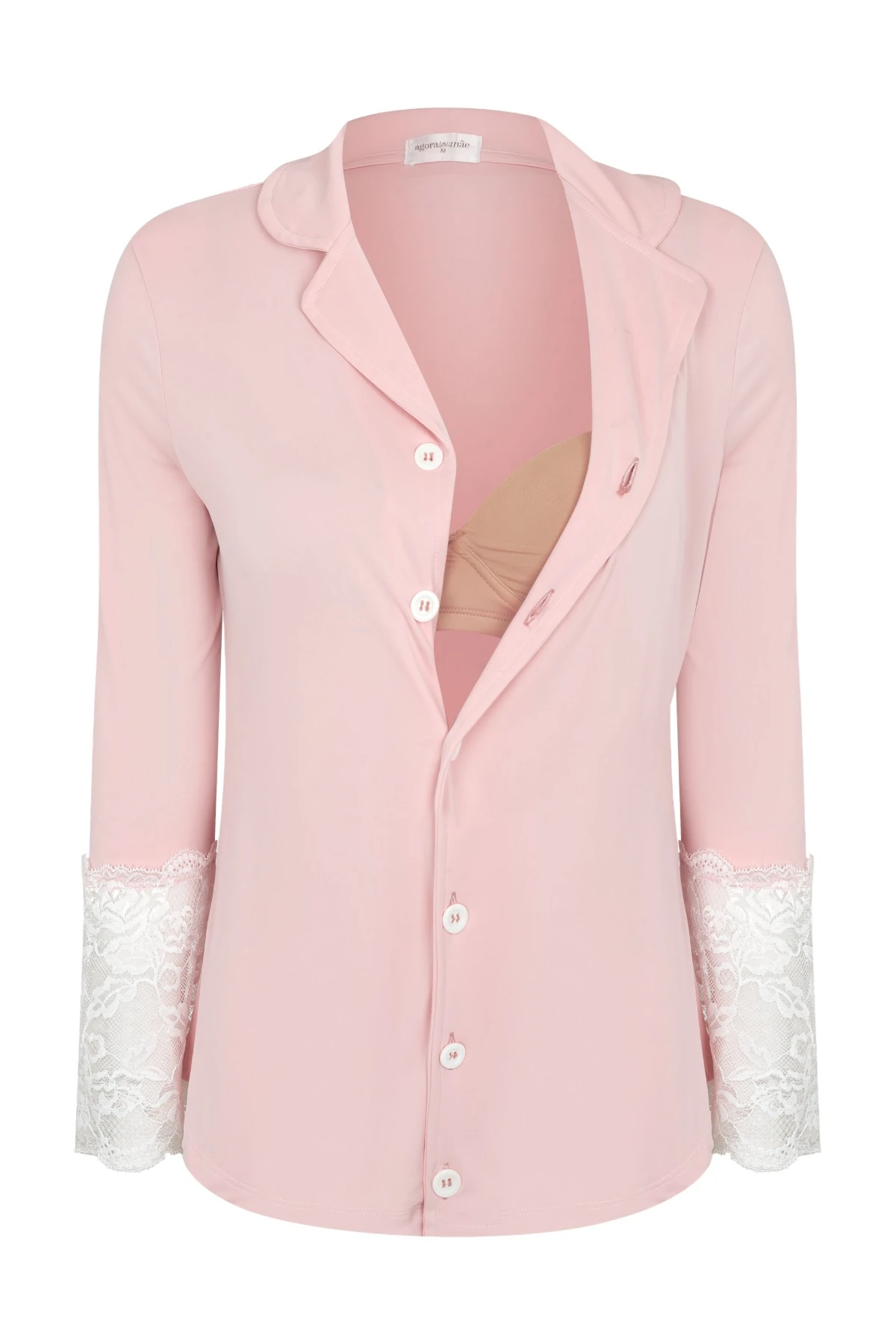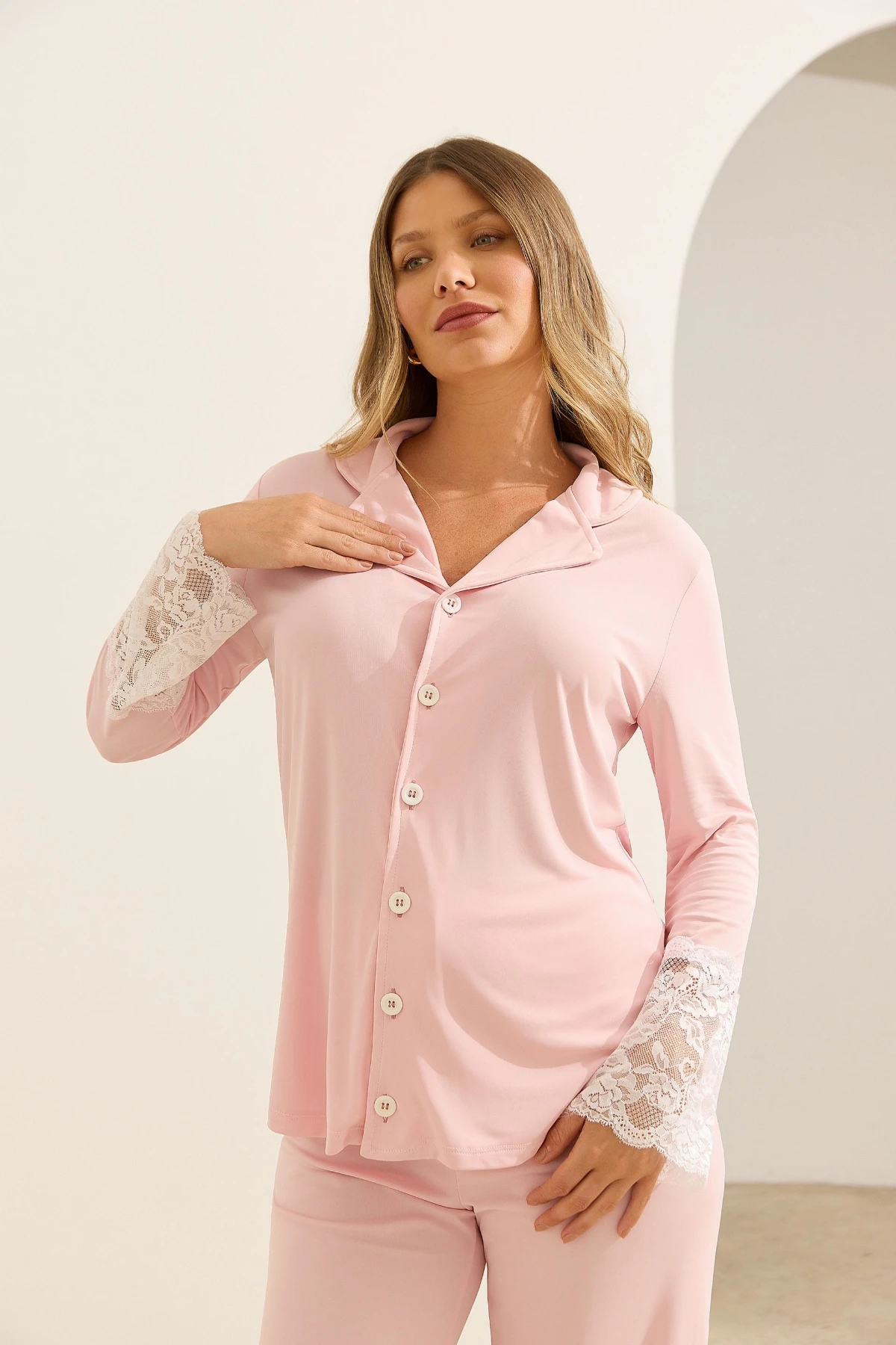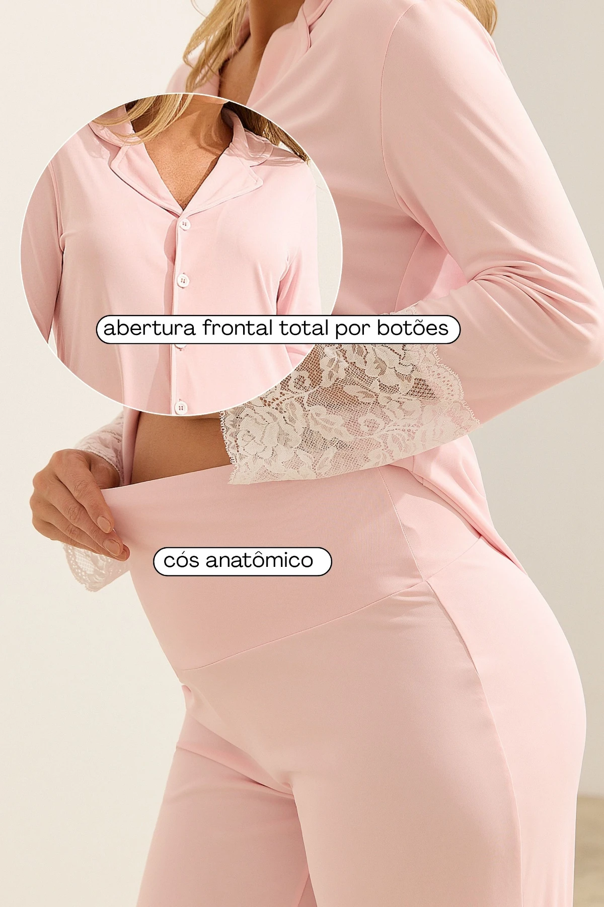 A abertura frontal total por botões facilita a amamentação com praticidade e discrição. As mangas são longas e ganham destaque especial nos punhos amplos com aplicação de renda.