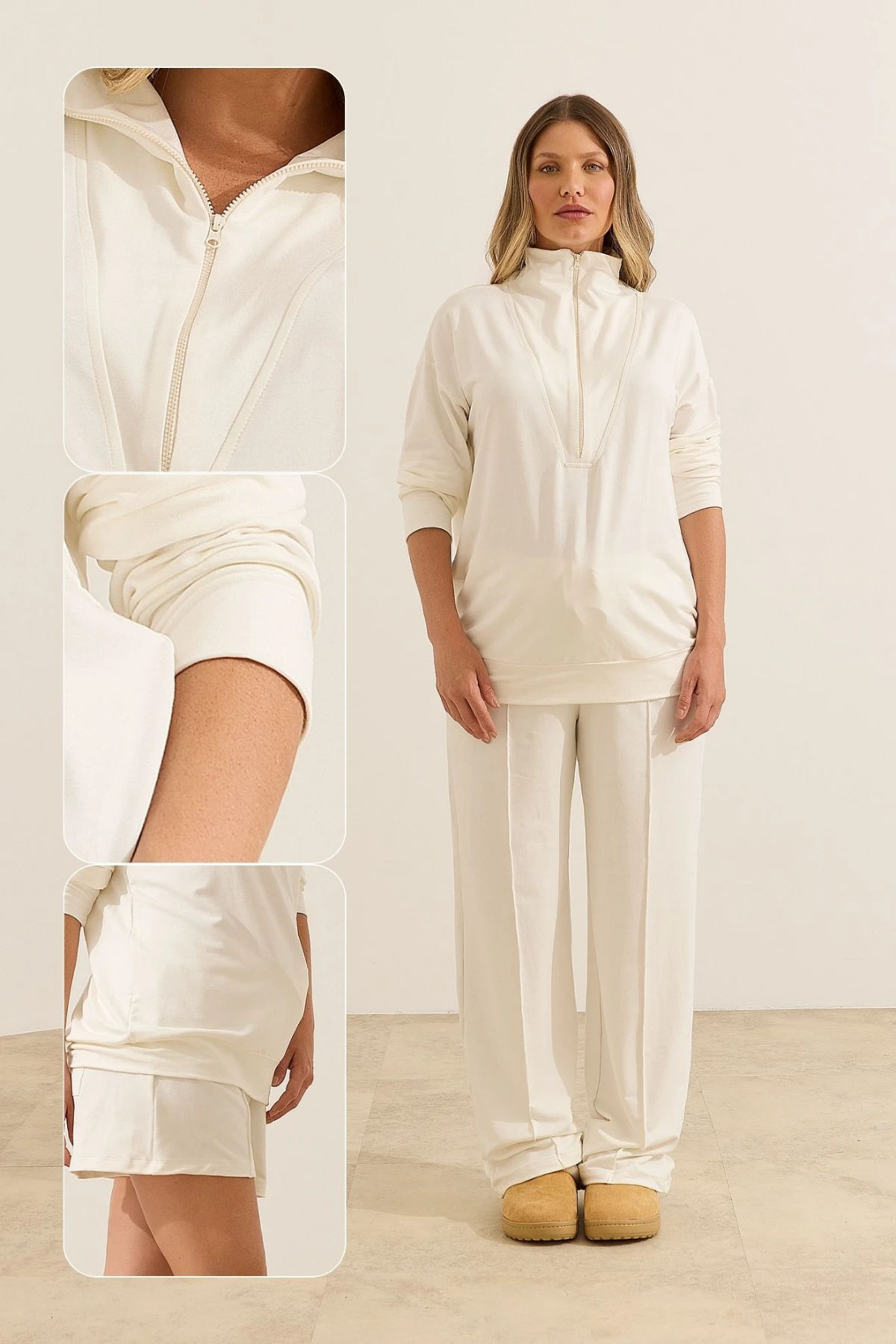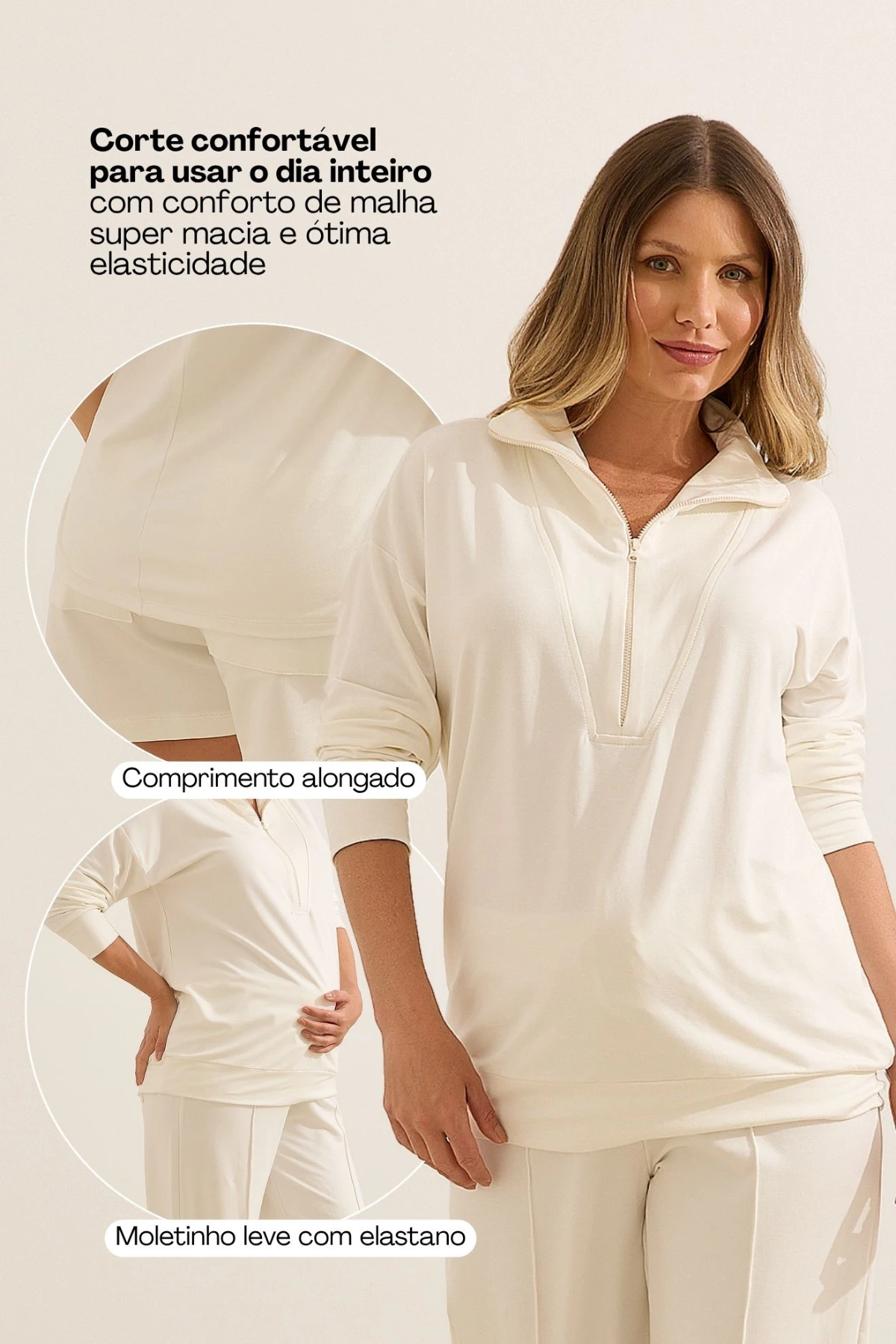 Blusa Moletinho Ultraconforto® com Zíper, produzida em malha exclusiva Ultraconforto®, com uma modelagem que acompanha toda a gestação até a amamentação. Feita SEM POLIÉSTER que não deforma!