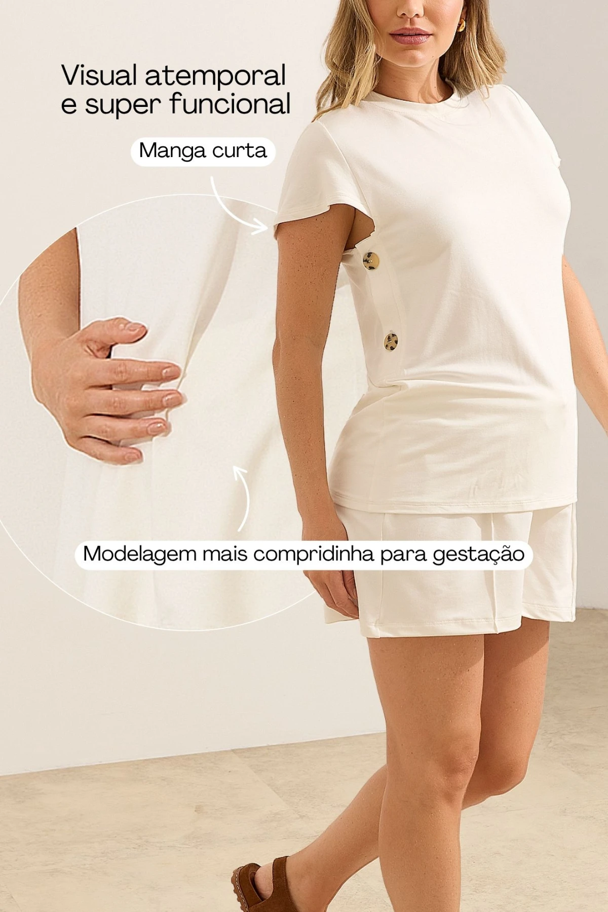 A Blusa Ultraconforto® com Botões Laterais é a peça versátil que atravessa fases com você. Super macia e ZERO POLIÉSTER que não deforma! Durante a gestação, o comprimento ideal cobre a barriga com segurança, sem subir ou incomodar. No pós-parto, os botões laterais facilitam a amamentação de forma prática e discreta.