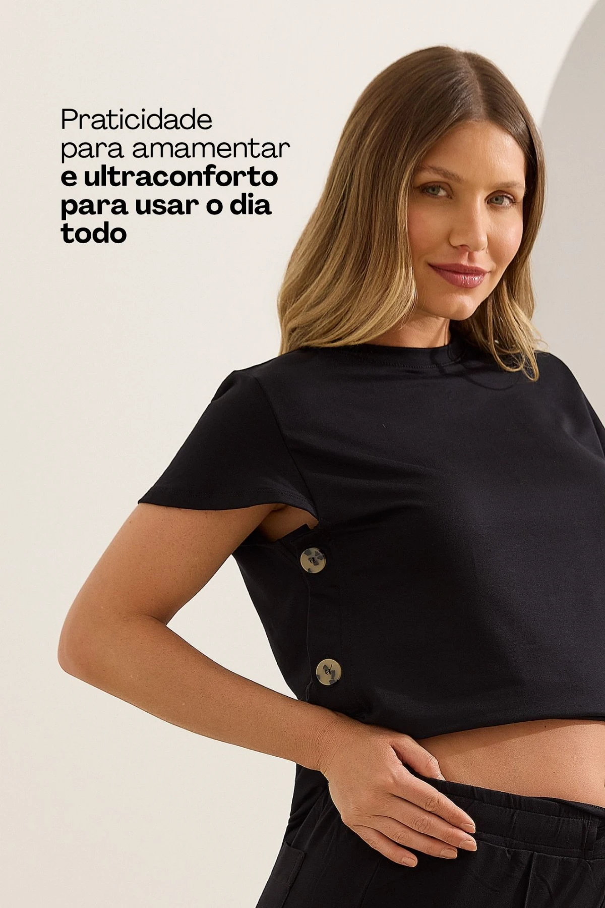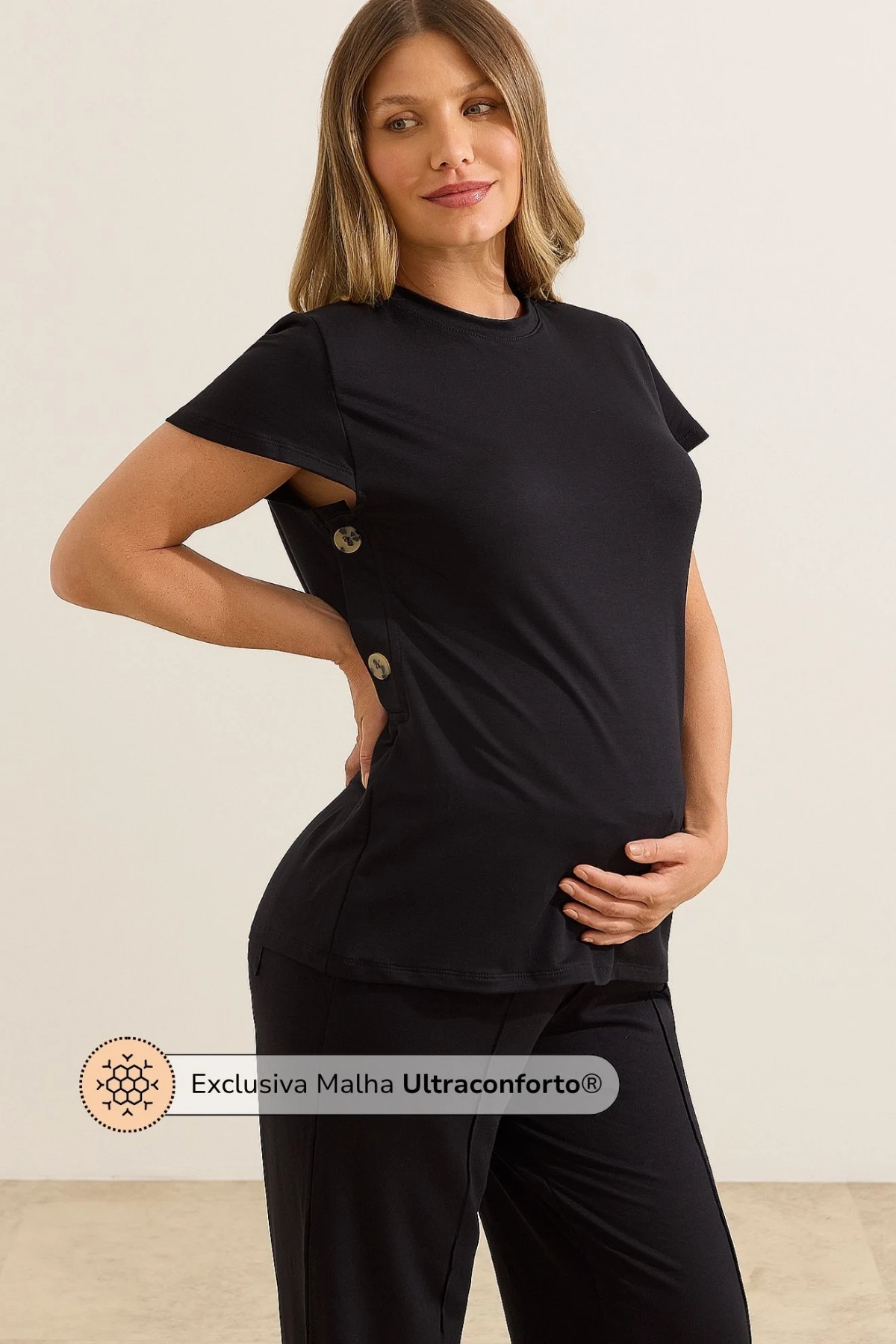 A Blusa Ultraconforto® com Botões Laterais é a peça versátil que atravessa fases com você. Super macia e ZERO POLIÉSTER que não deforma! Durante a gestação, o comprimento ideal cobre a barriga com segurança, sem subir ou incomodar. No pós-parto, os botões laterais facilitam a amamentação de forma prática e discreta.