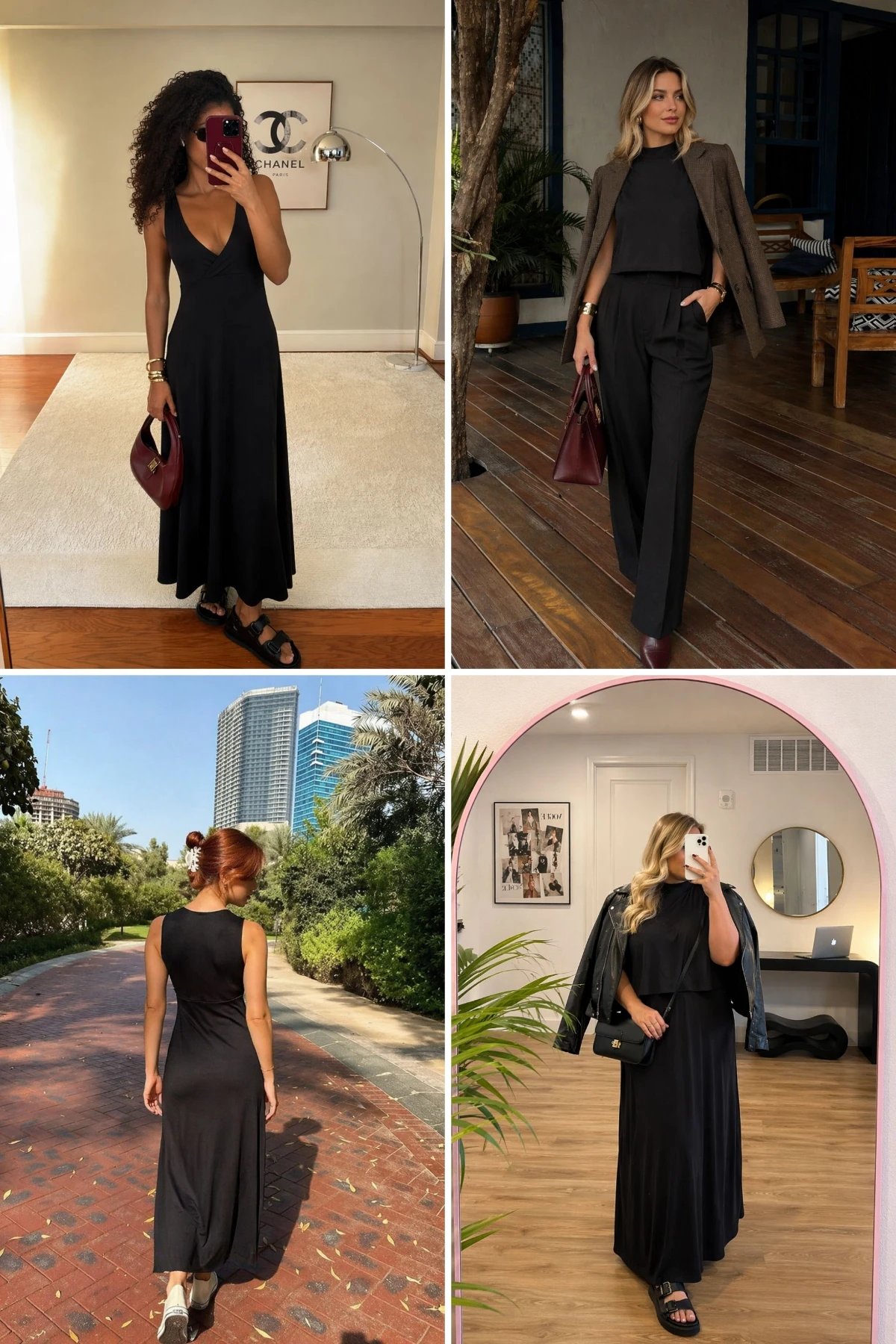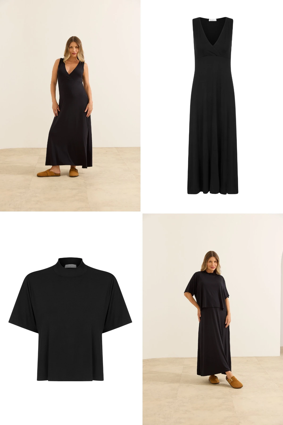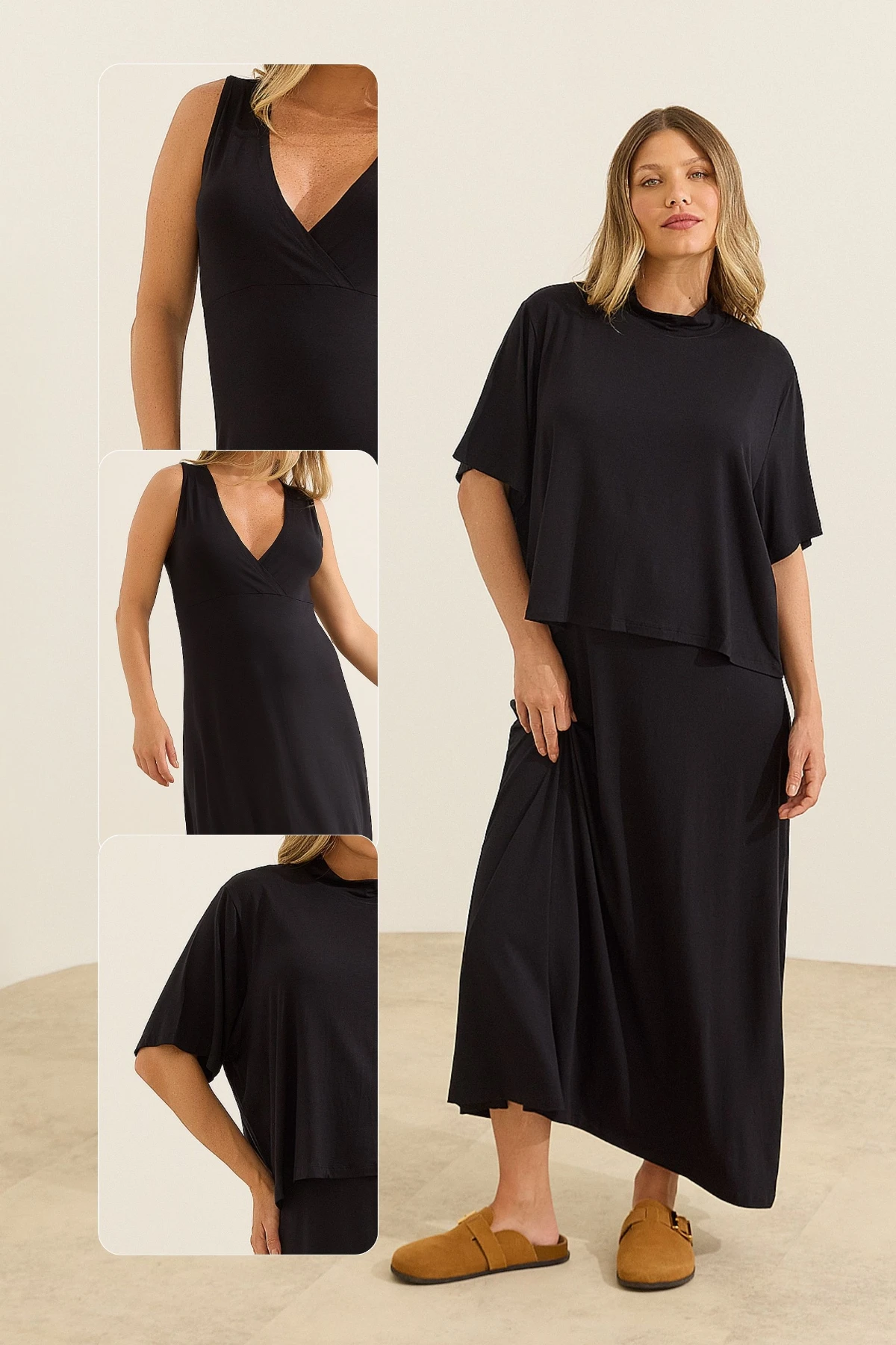 O vestido longo possui modelagem estilo regata, com decote em V e caimento fluido que acompanha as diferentes fases da maternidade. O cropped sobreposto apresenta mangas curtas, golinha e modelagem levemente oversized, criando um visual moderno e garantindo discrição e praticidade para a amamentação.