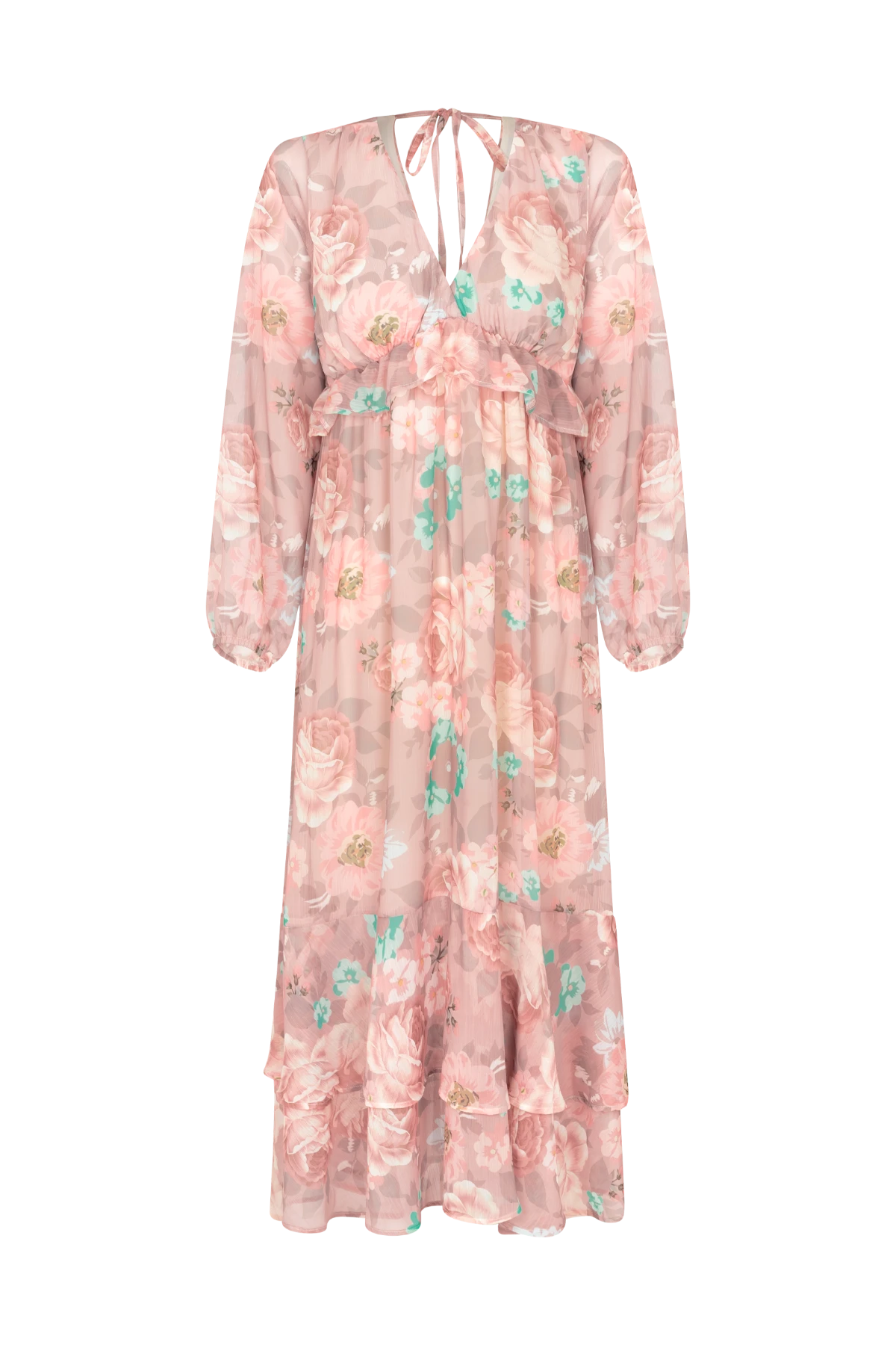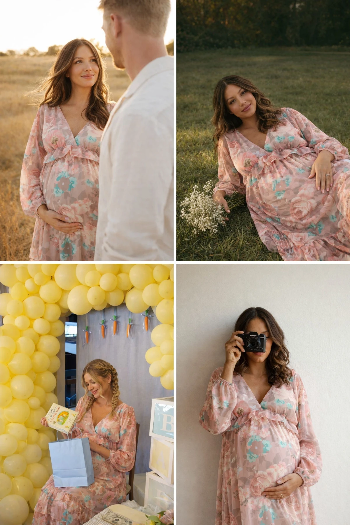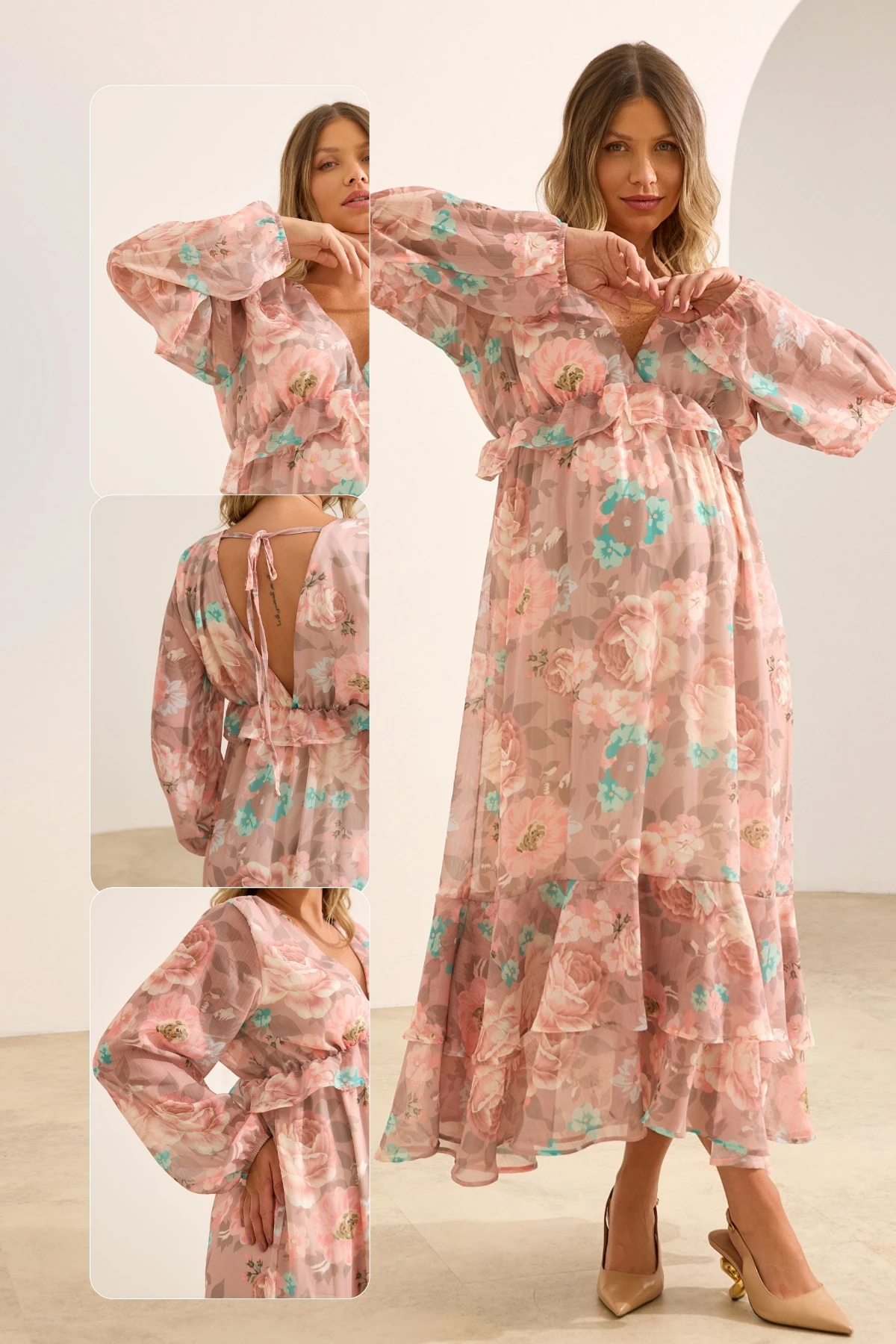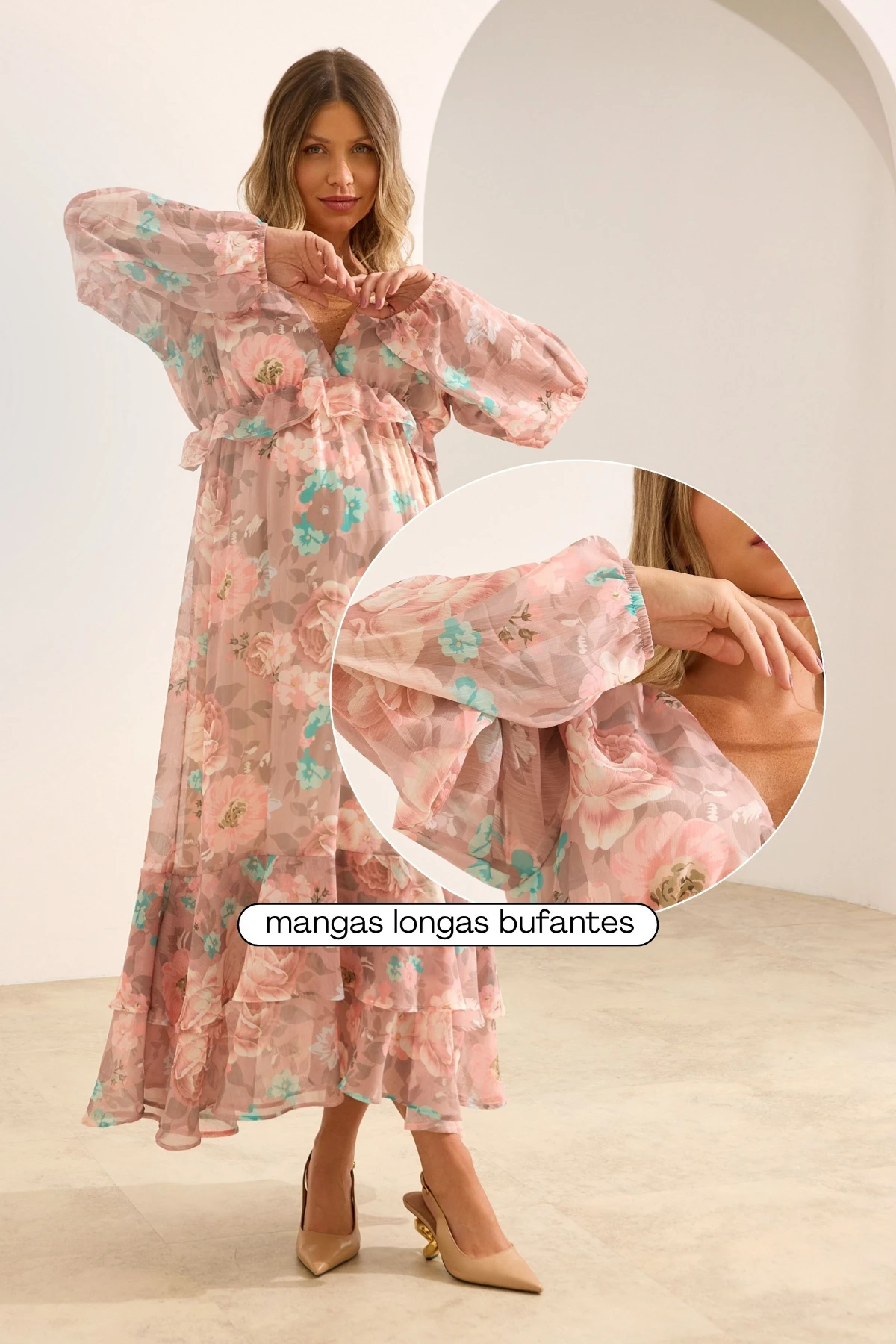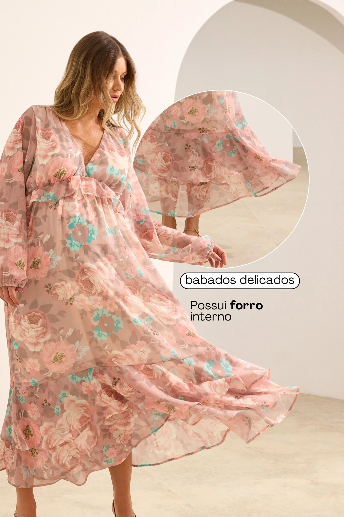 Vestido longo com estampa floral, decote em V e modelagem fluida que acompanha as mudanças do corpo. Possui mangas longas bufantes, babados delicados, costas abertas com amarração ajustável e forro interno, sendo ideal para gestantes e também para o pós-parto.
