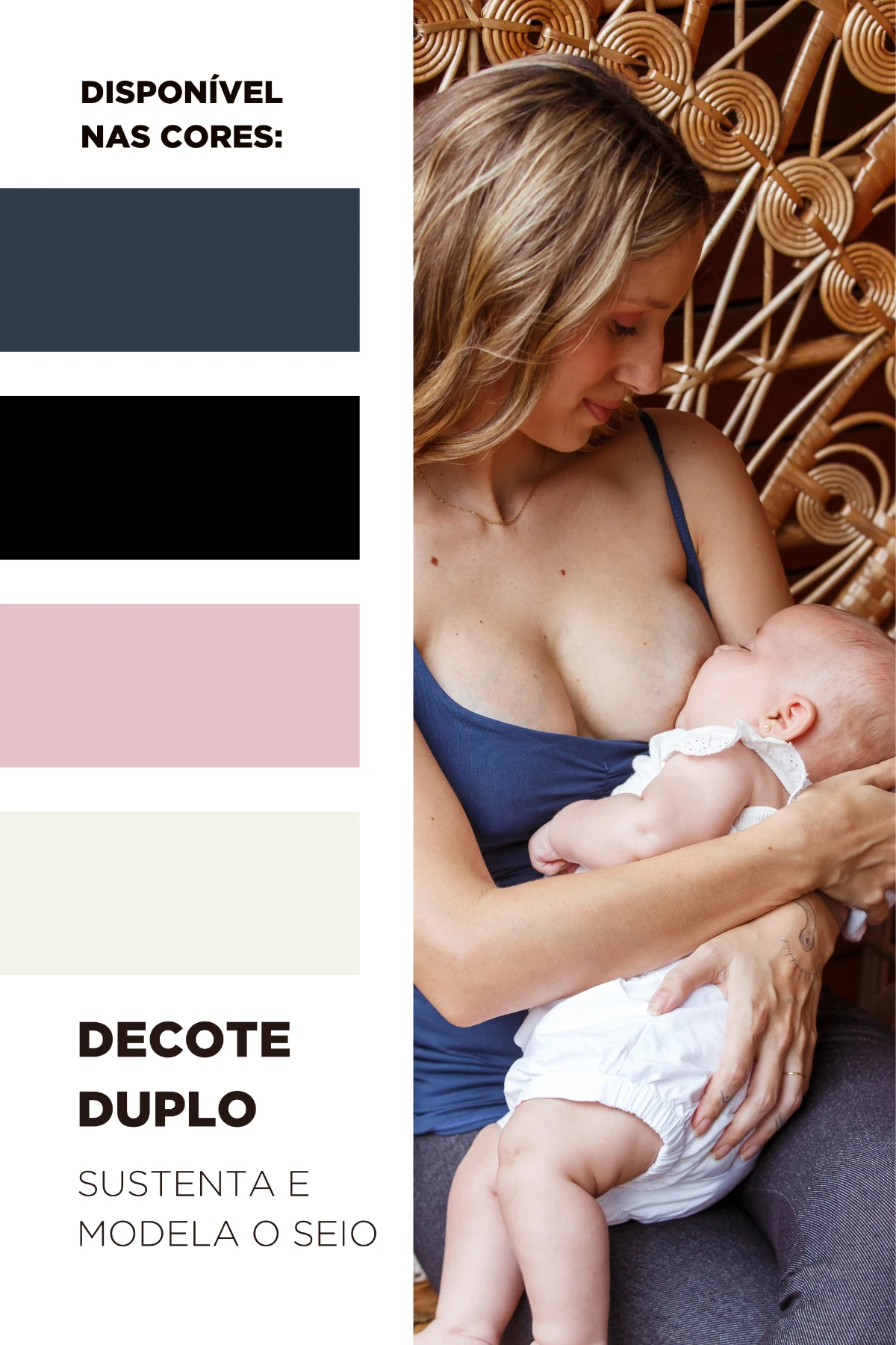 O decote duplo modela delicadamente o busto e garante sustentação ideal, permitindo usar com ou sem sutiã — perfeito para os dias em que o corpo pede leveza. Para amamentar, basta puxar o decote para baixo, de forma prática e discreta, facilitando o momento com o bebê em qualquer lugar.