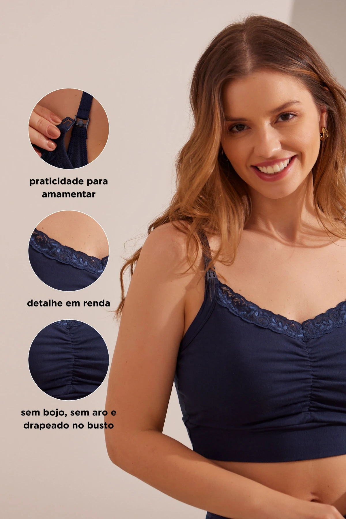 Sem bojo e sem aro, o top oferece leveza sem abrir mão da sustentação: os drapeados no busto ajudam a modelar os seios e garantir firmeza com conforto. Os detalhes em renda na parte superior trazem um toque delicado à peça, que se adapta bem ao corpo sem marcar ou apertar, mesmo para quem tem seios maiores.