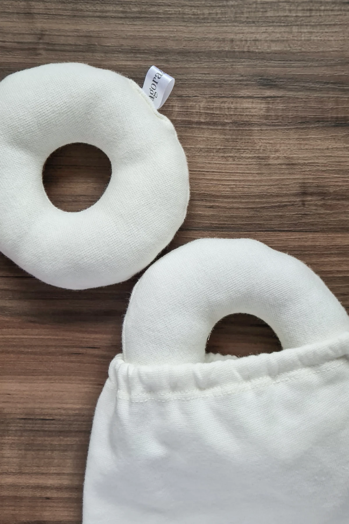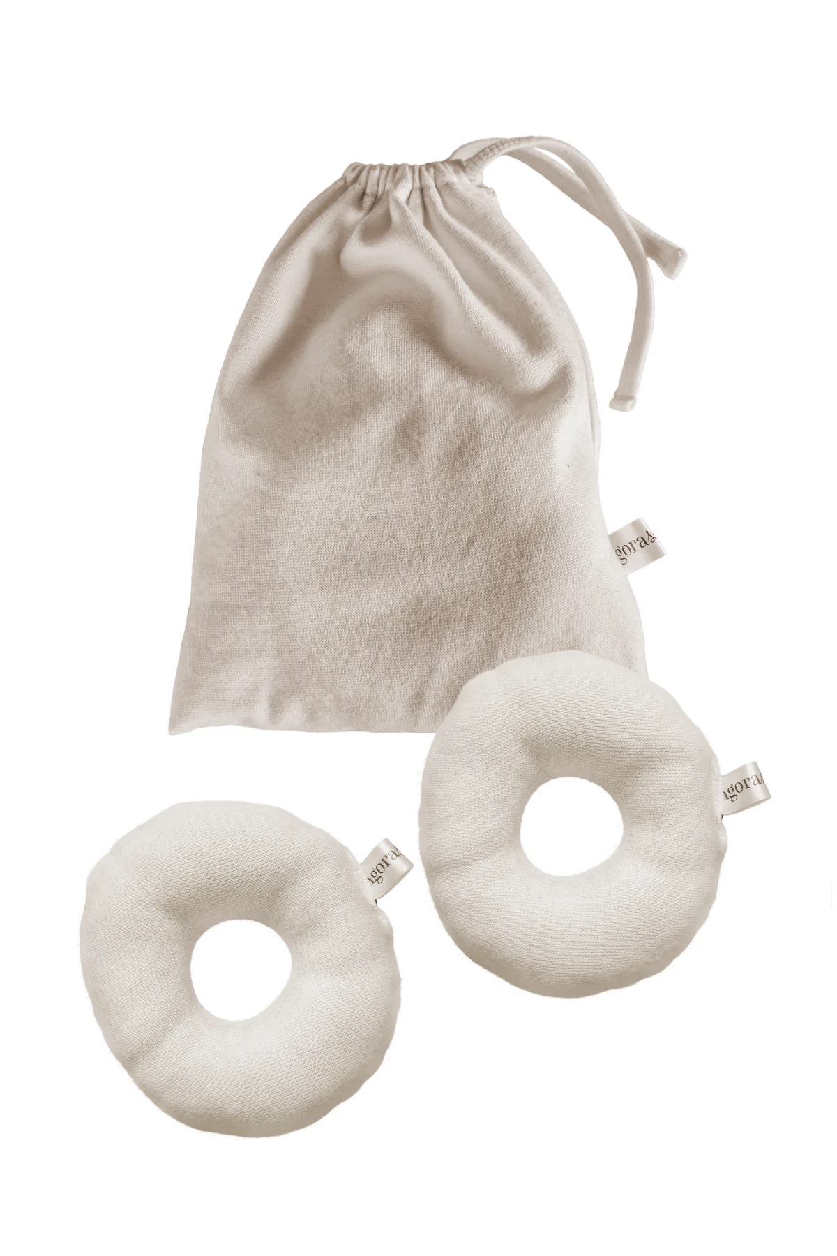 Kit contém 1 par de rosquinhas e 1 saquinho de algodão orgânico.