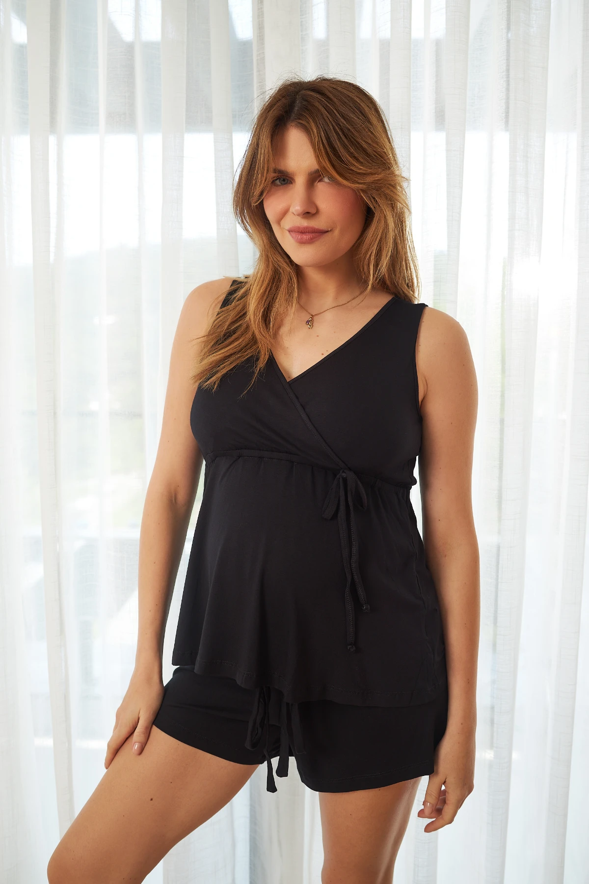 O short completa o conjunto com modelagem soltinha que permite liberdade de movimento e repouso. O corte prioriza conforto prolongado, sendo prático para usar durante a gestação, para dormir ou para a rotina em casa.
