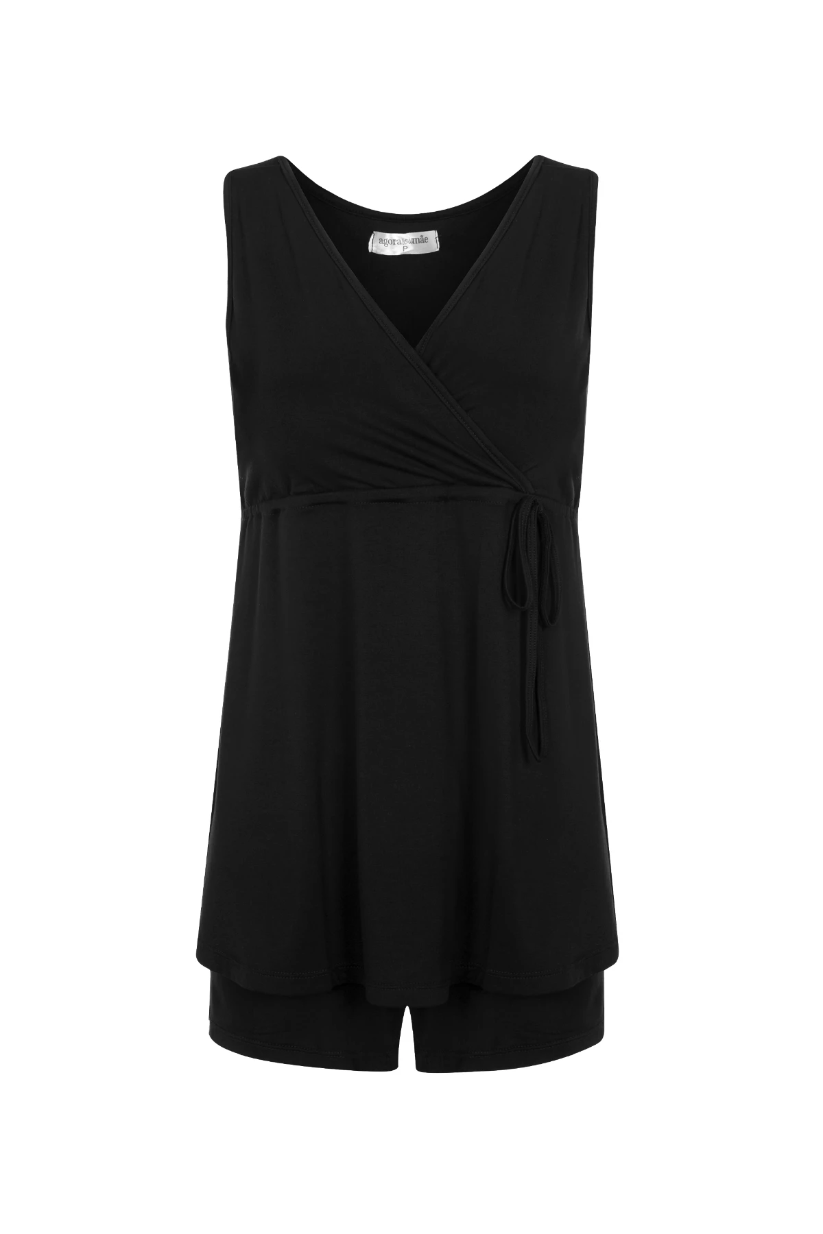 O decote transpassado é a solução para amamentar com rapidez e discrição: basta puxar a camada adequada para o acesso ao seio. A construção mantém o acabamento feminino mesmo com a abertura parcial.