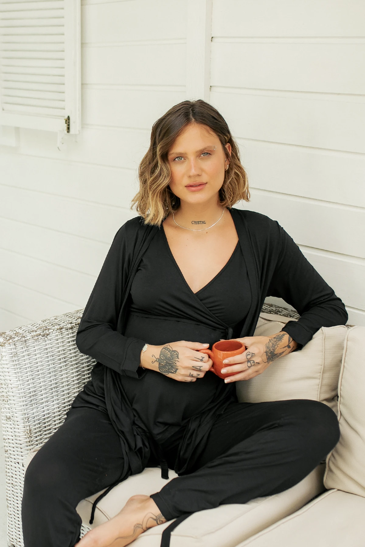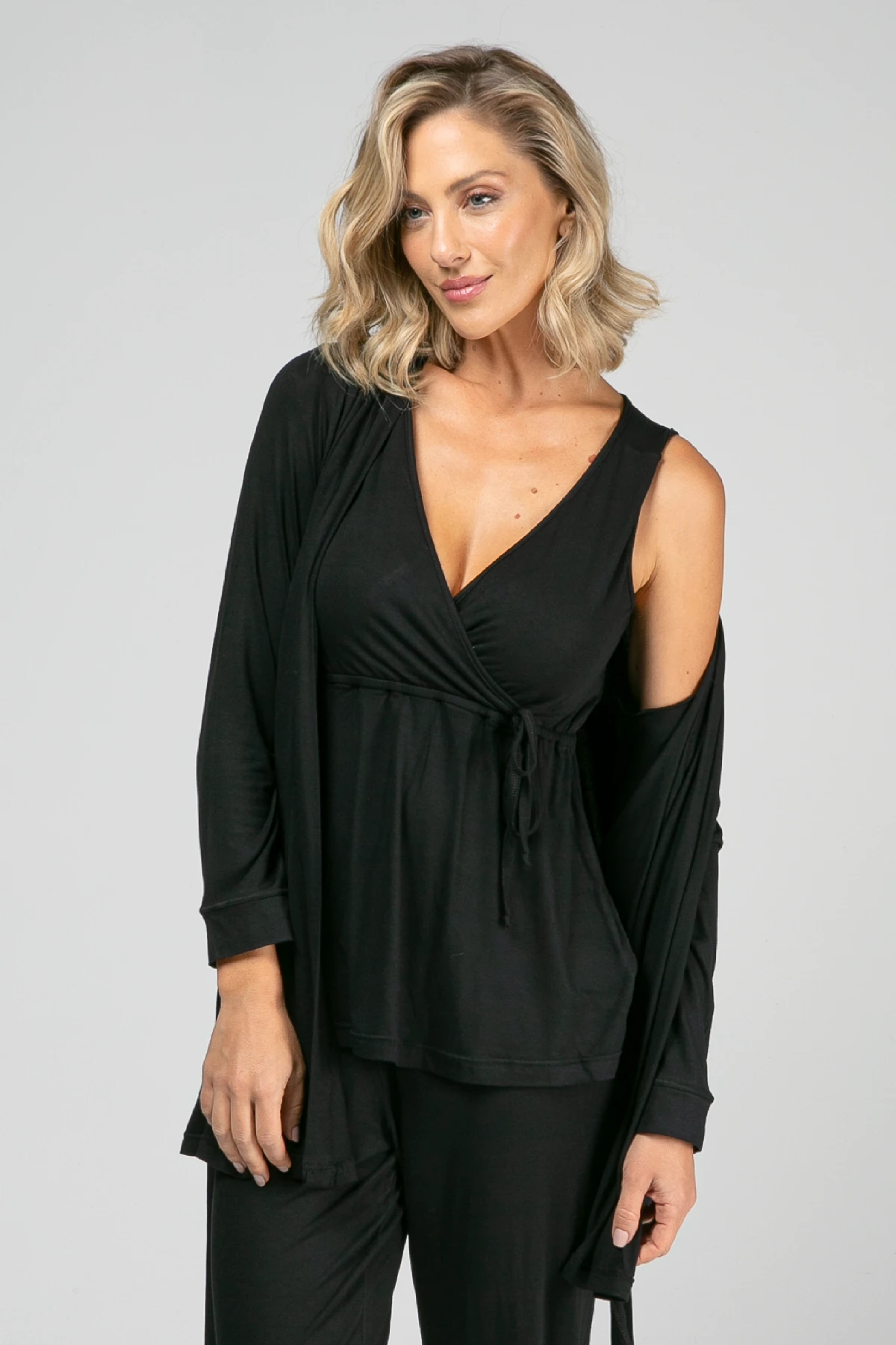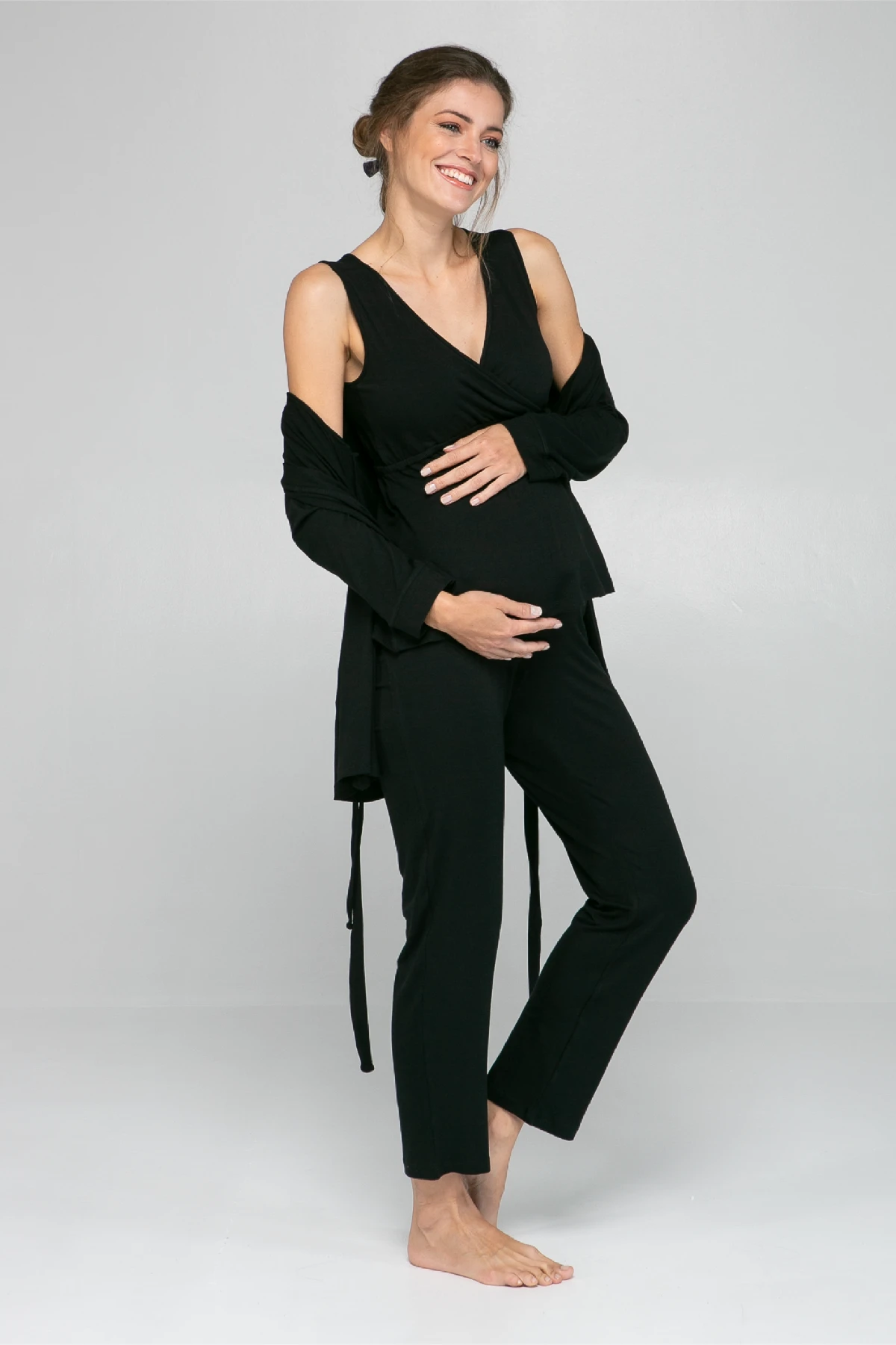 Pijama maternidade em 3 peças: regata transpassada, calça regulável e robe na altura do quadril.
