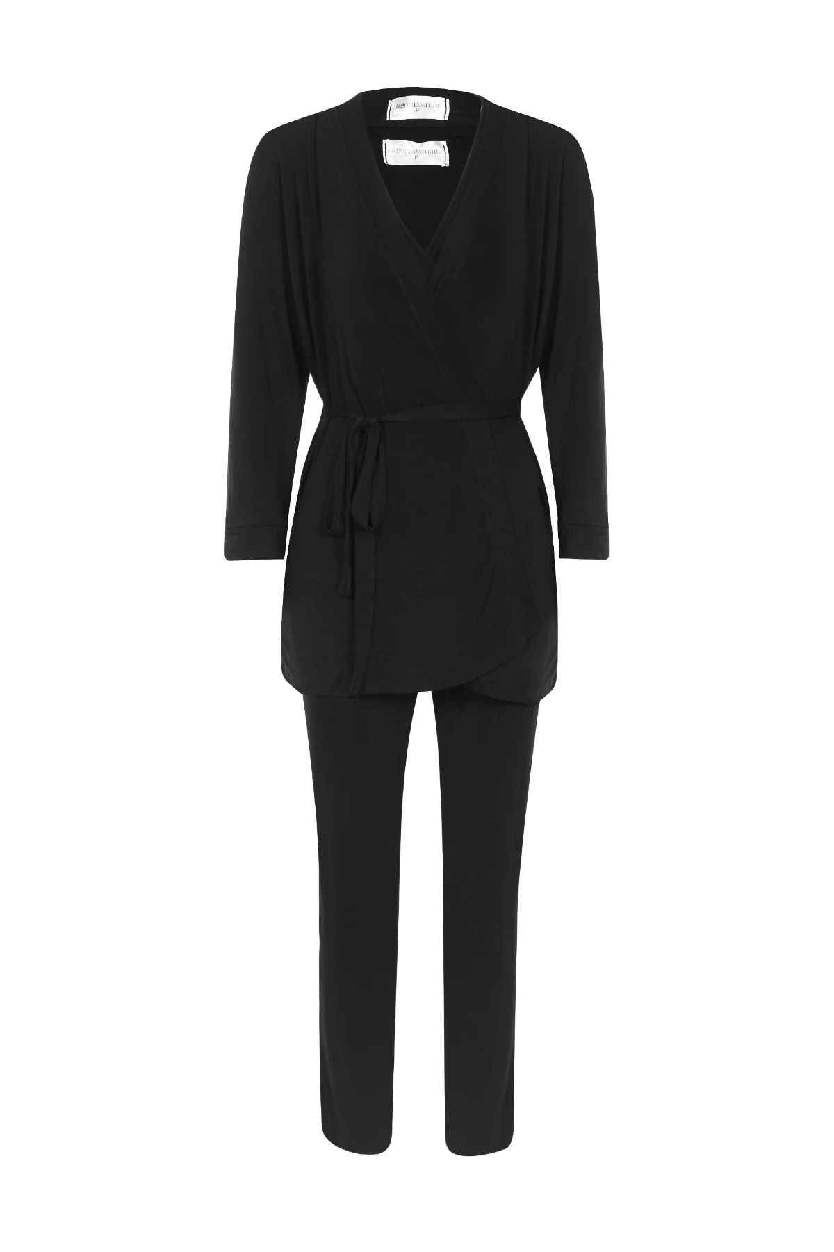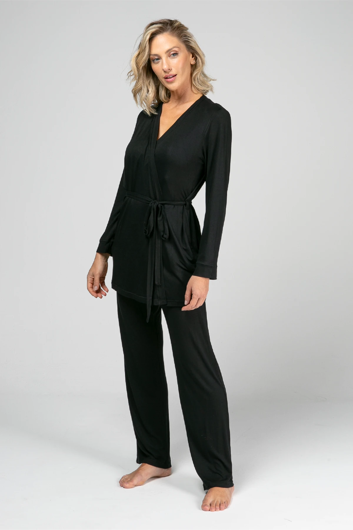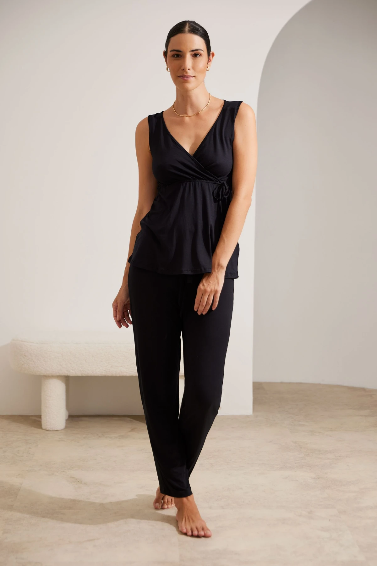 Pijama maternidade em 3 peças: regata transpassada, calça regulável e robe na altura do quadril.