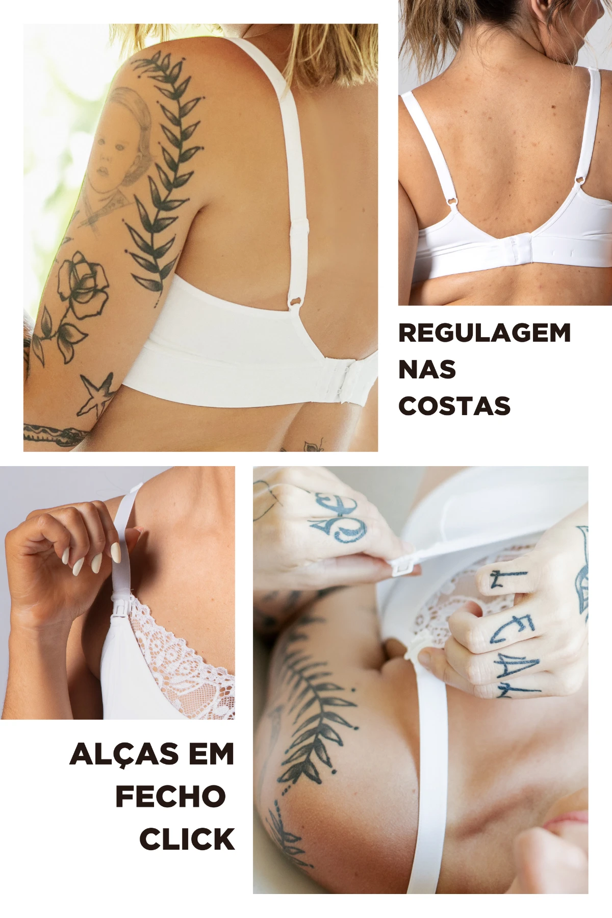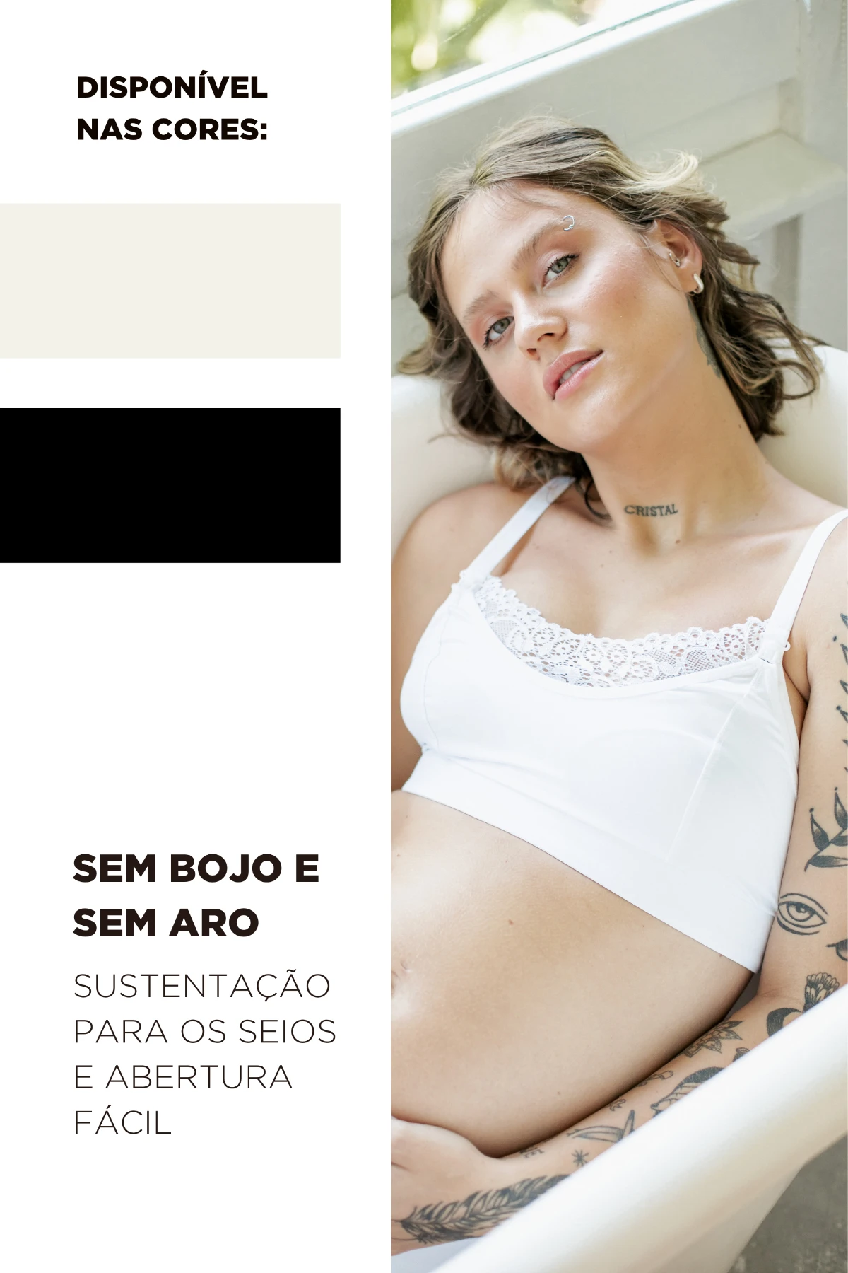 Nas costas, o fecho regulável com múltiplos níveis de ajuste garante o encaixe perfeito conforme o corpo muda ao longo da gestação e pós-parto. O tecido respirável mantém a pele seca e confortável por mais tempo, evitando incômodos.
