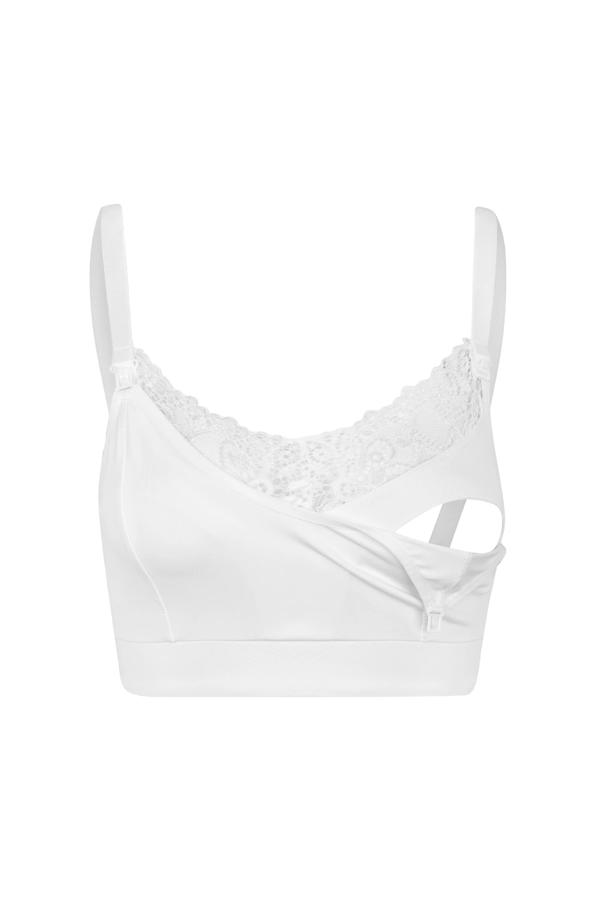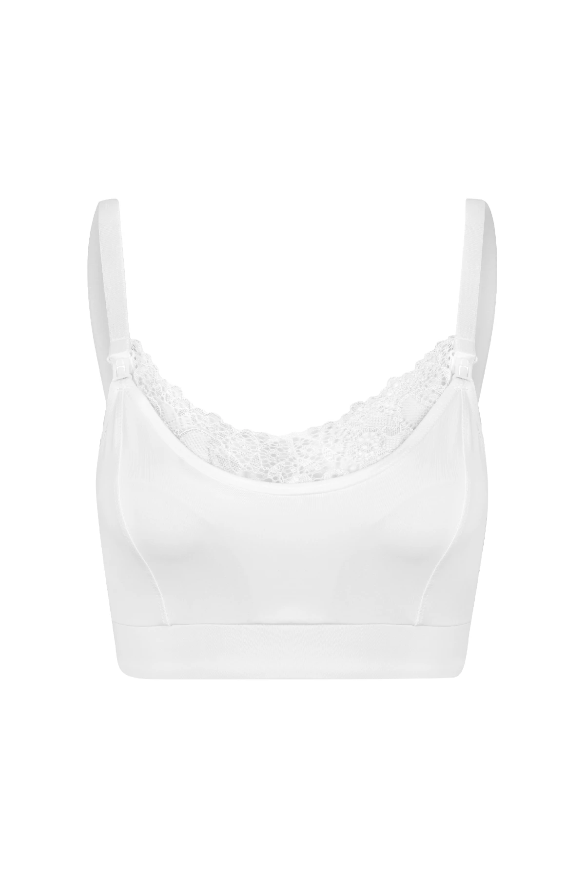 O detalhe em renda no colo traz um toque delicado e sofisticado, ideal para quem busca uma lingerie funcional e elegante. O decote fechado oferece cobertura discreta e segurança durante o uso, enquanto o fecho click nas alças permite abrir e fechar facilmente com uma só mão — tornando o momento da amamentação mais simples e confortável.