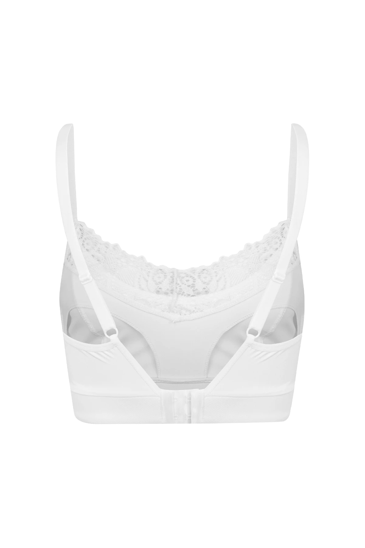 Sem bojo e sem aro, oferece firmeza com toque suave, abertura prática com fecho click e detalhe em renda que valoriza o colo.