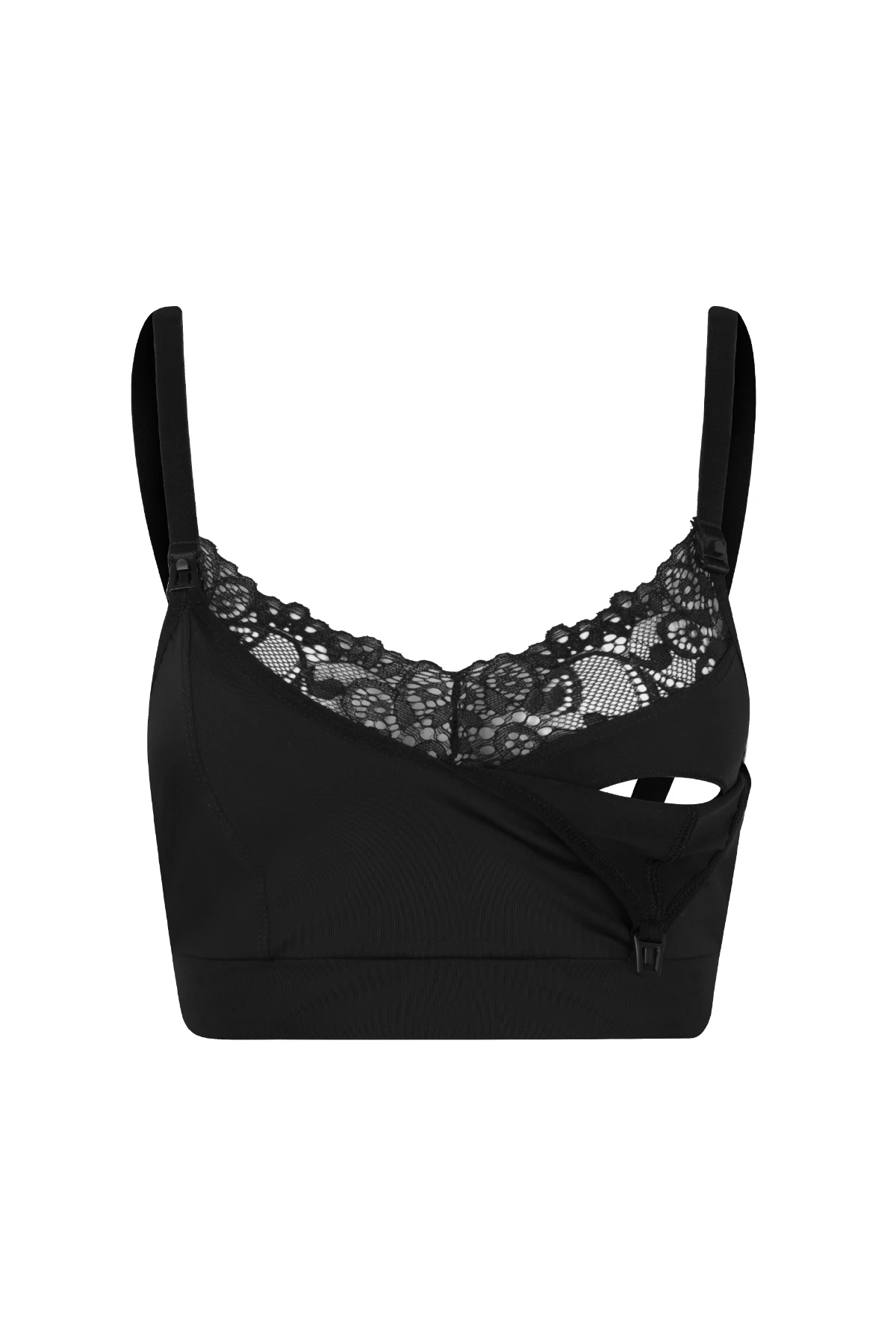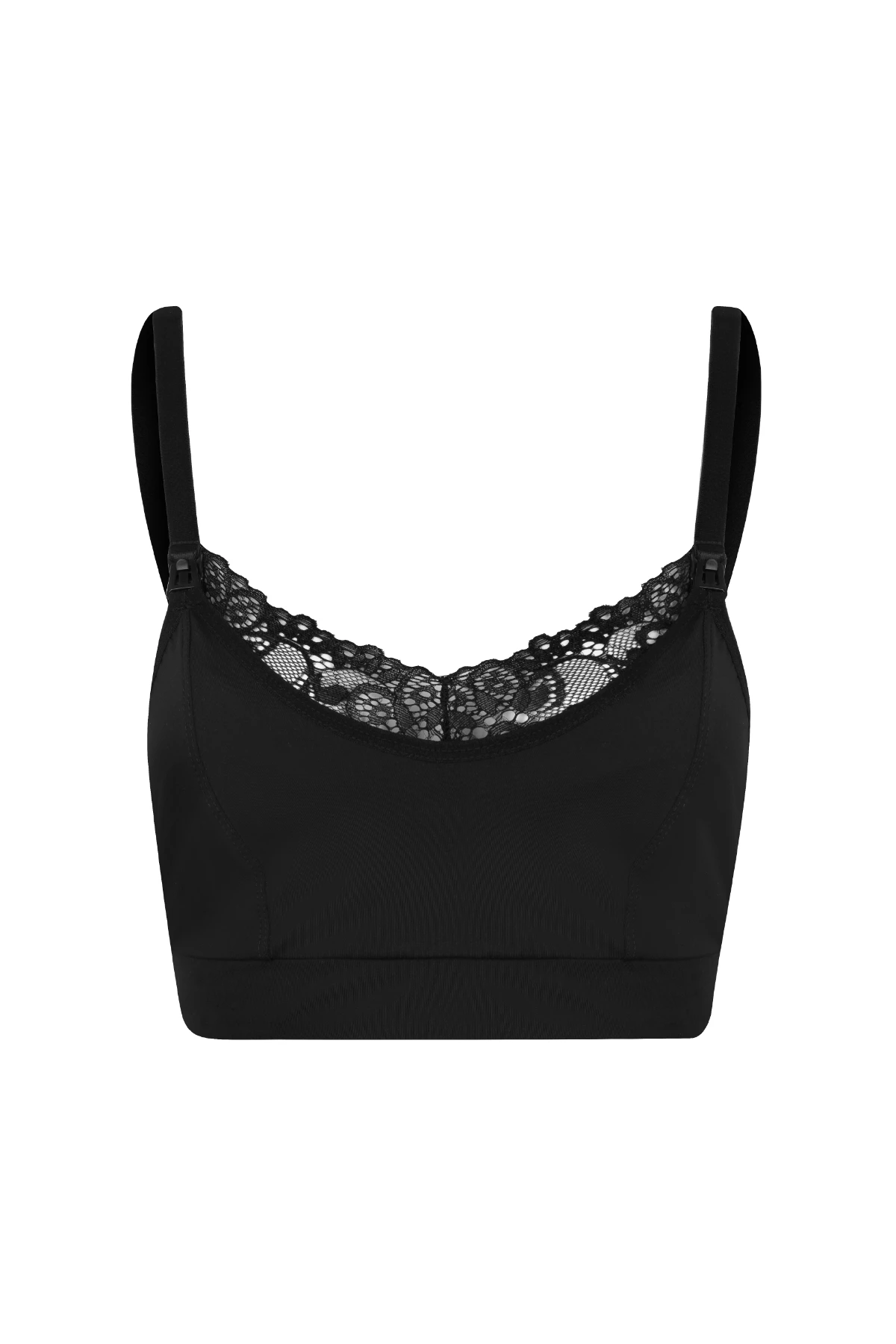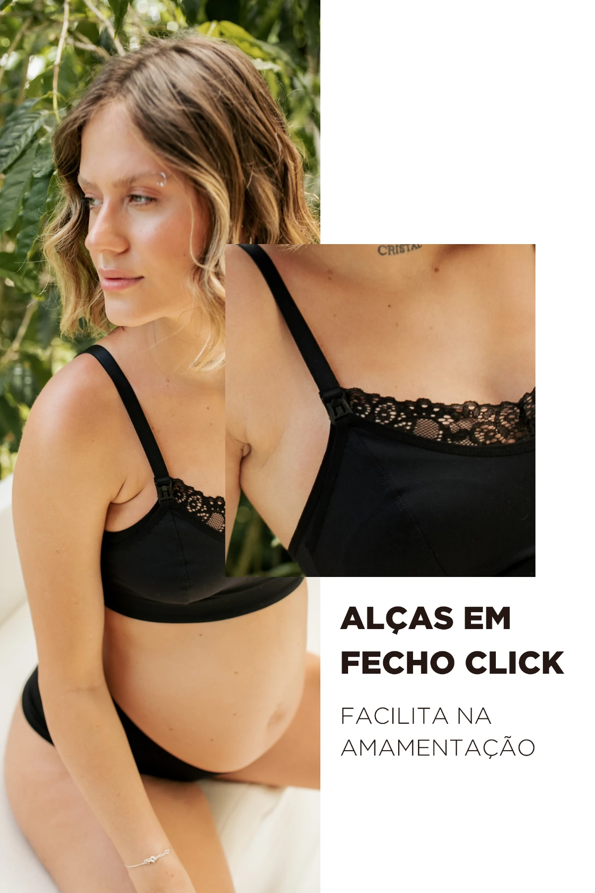 O detalhe em renda no colo traz um toque delicado e sofisticado, ideal para quem busca uma lingerie funcional e elegante. O decote fechado oferece cobertura discreta e segurança durante o uso, enquanto o fecho click nas alças permite abrir e fechar facilmente com uma só mão — tornando o momento da amamentação mais simples e confortável.