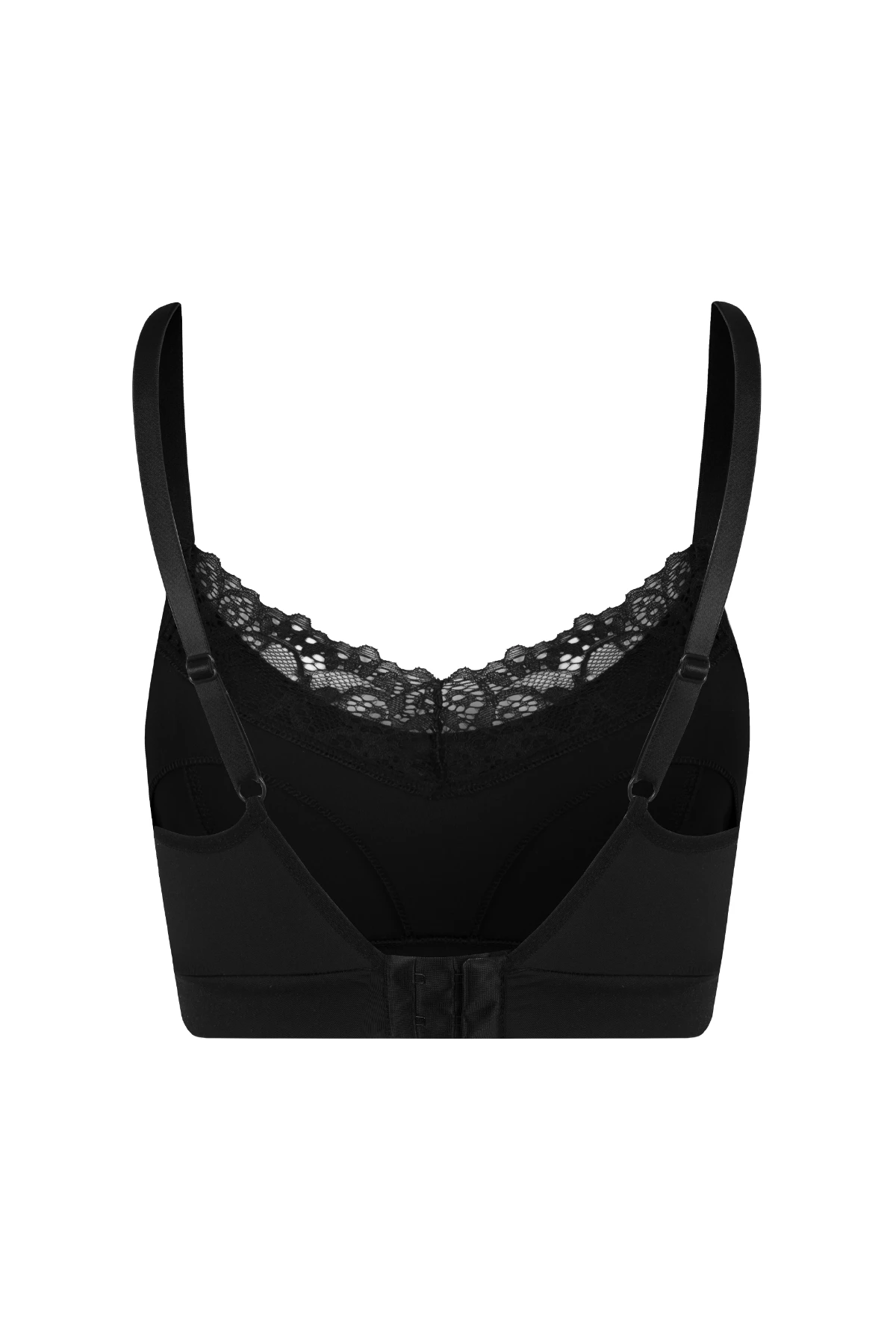 Sem bojo e sem aro, oferece firmeza com toque suave, abertura prática com fecho click e detalhe em renda que valoriza o colo.