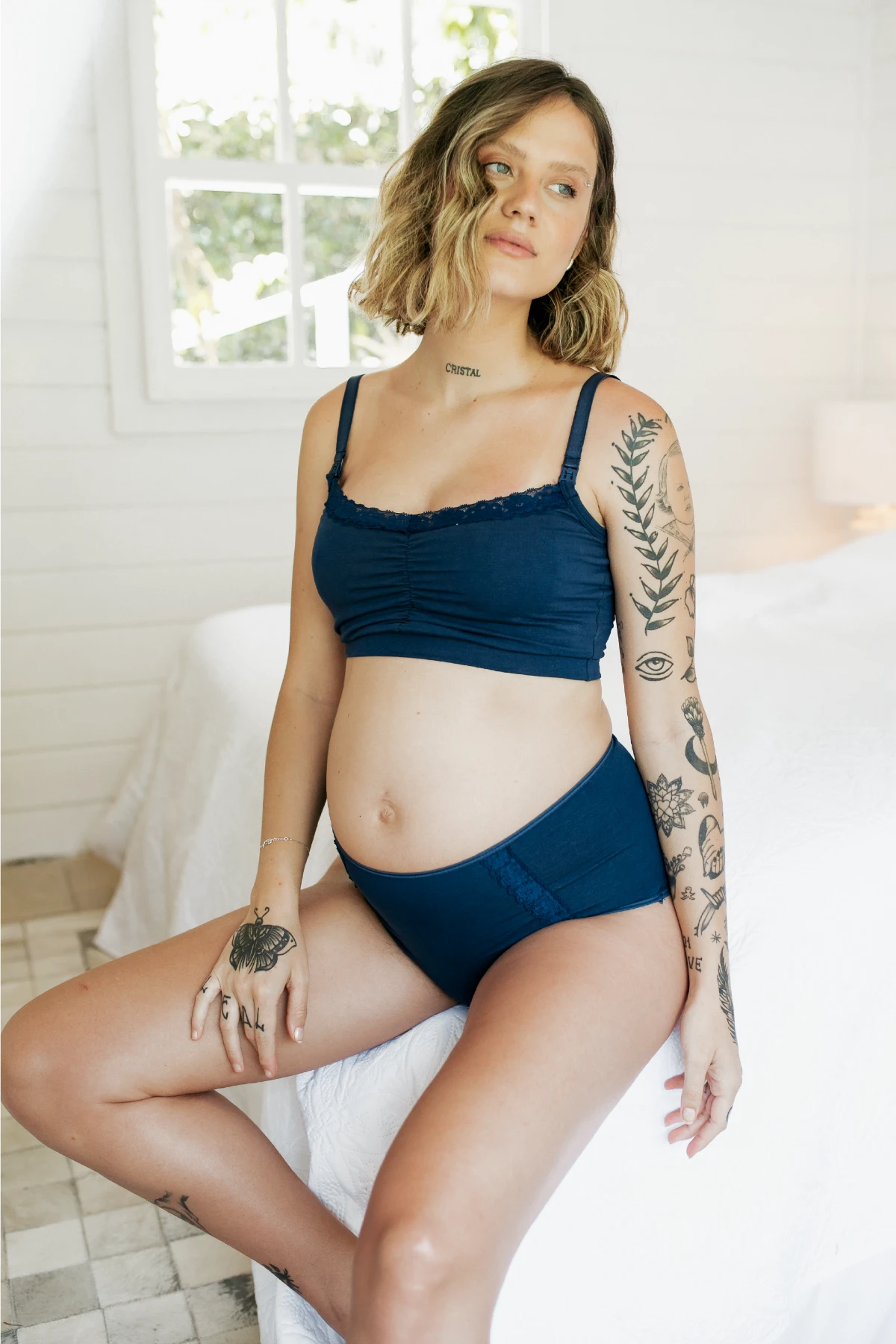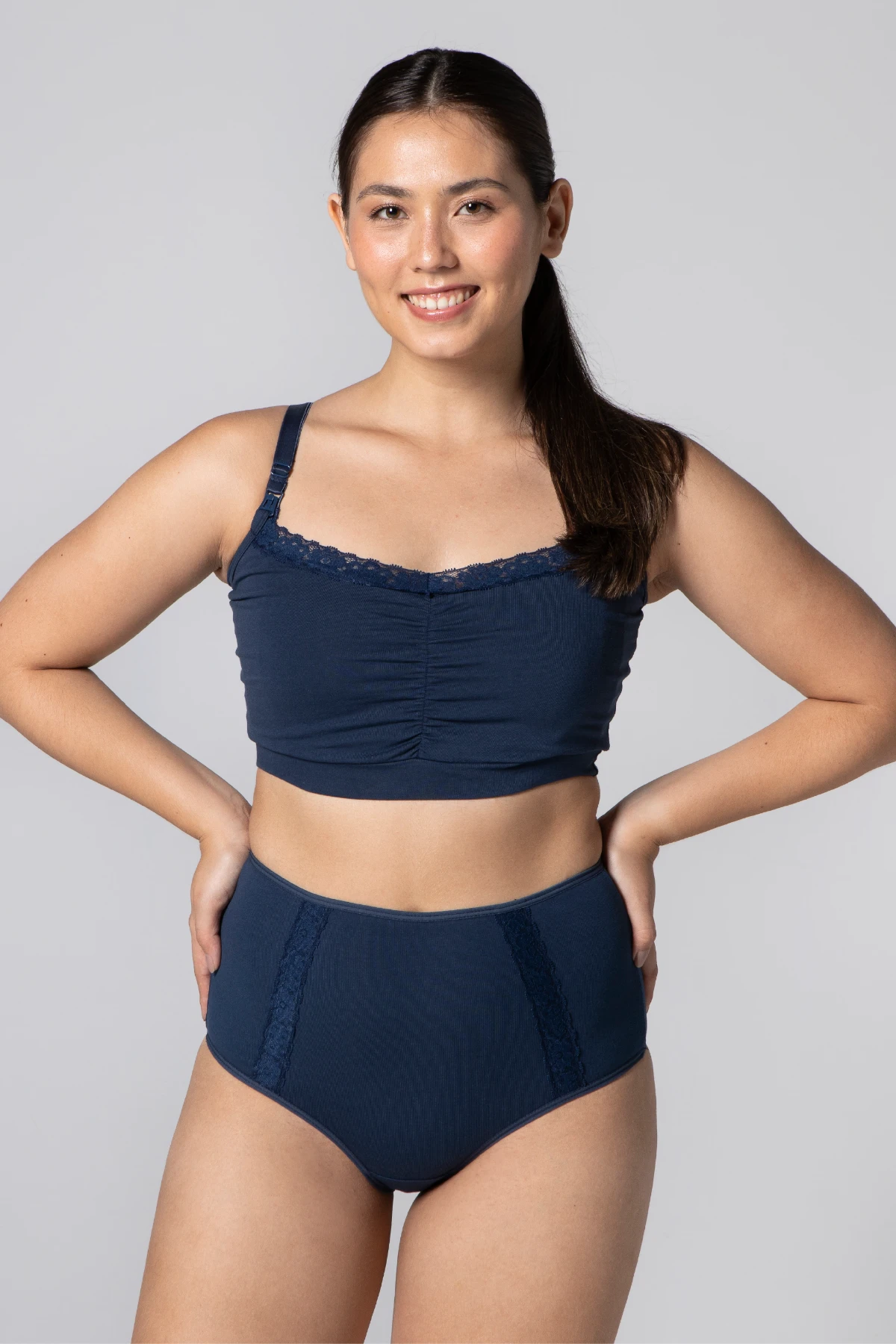 A combinação da elasticidade do elastano com a delicadeza da renda resulta em uma peça versátil e confortável, pensada no pós parto.