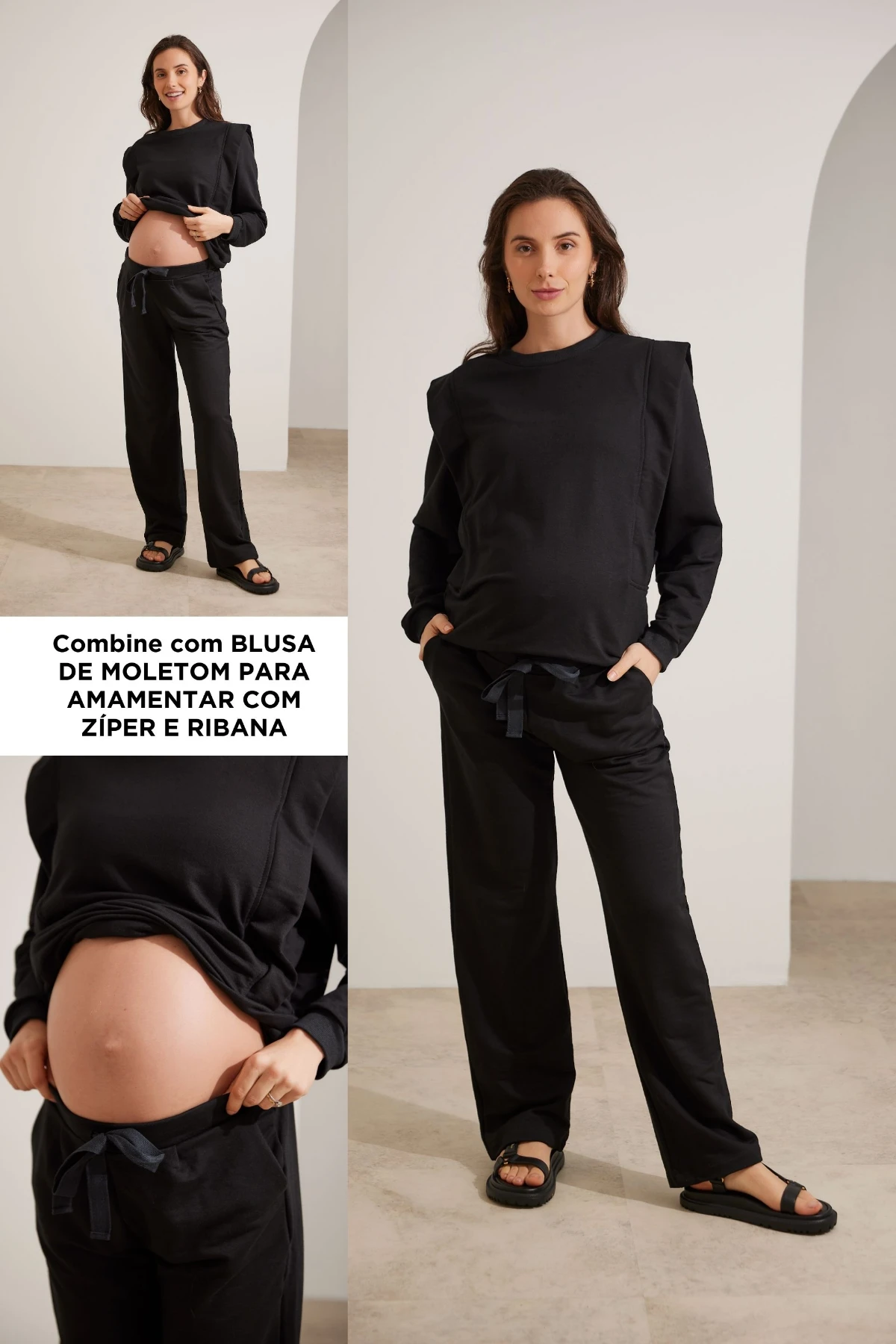 Pensando nisso, a calça aposta no conforto sem abrir mão da praticidade: a modelagem reta e soltinha dá liberdade de movimento, enquanto o cós flexível com elástico e amarração permite regular o ajuste conforme a barriga cresce. Os bolsos laterais adicionam utilidade, tornando a peça ideal para a rotina da maternidade.