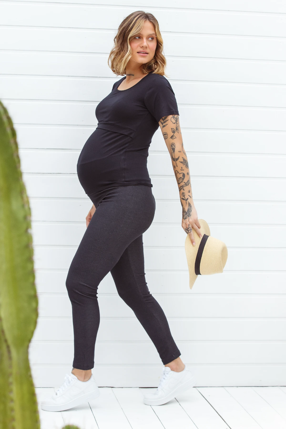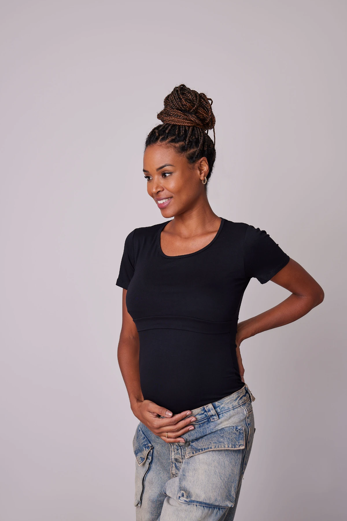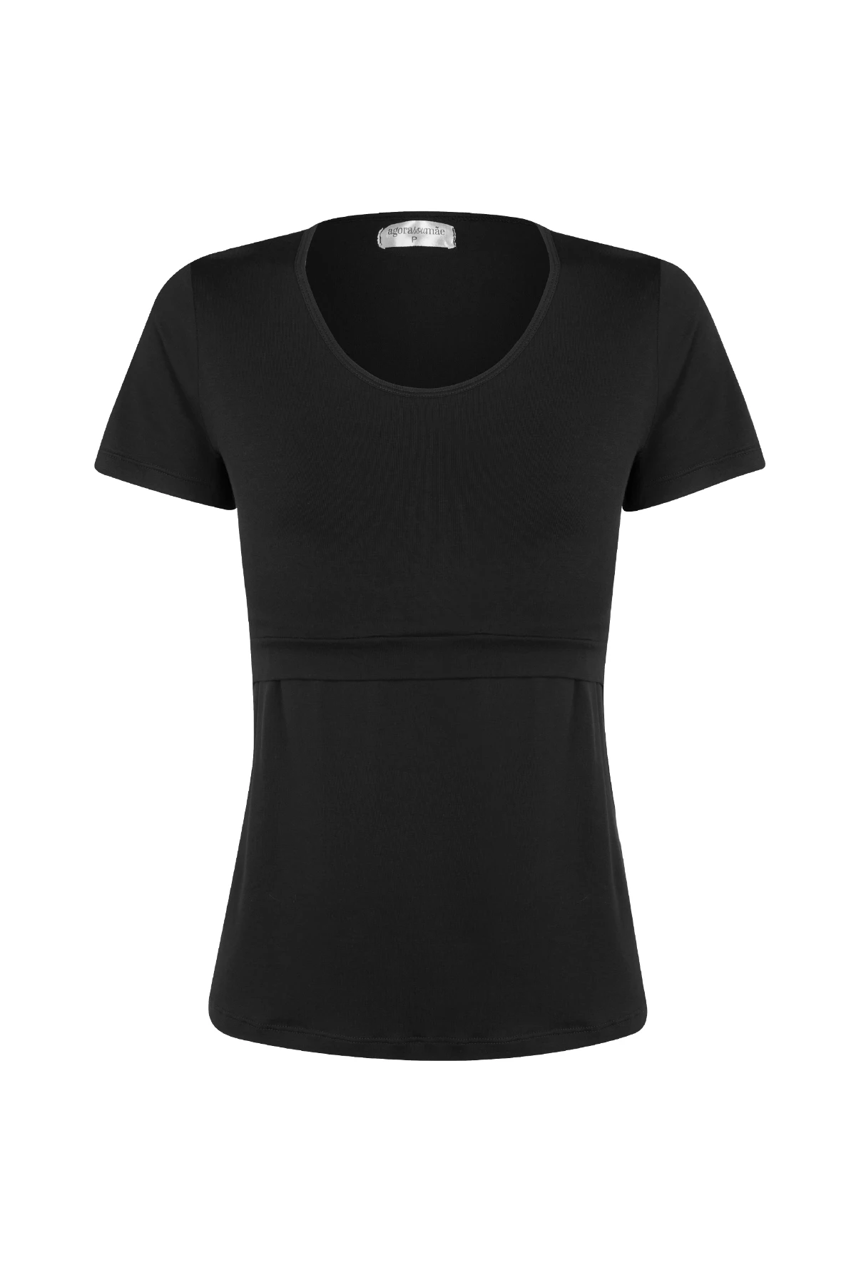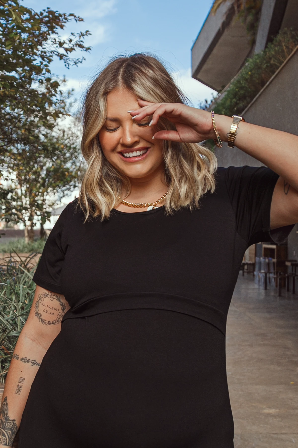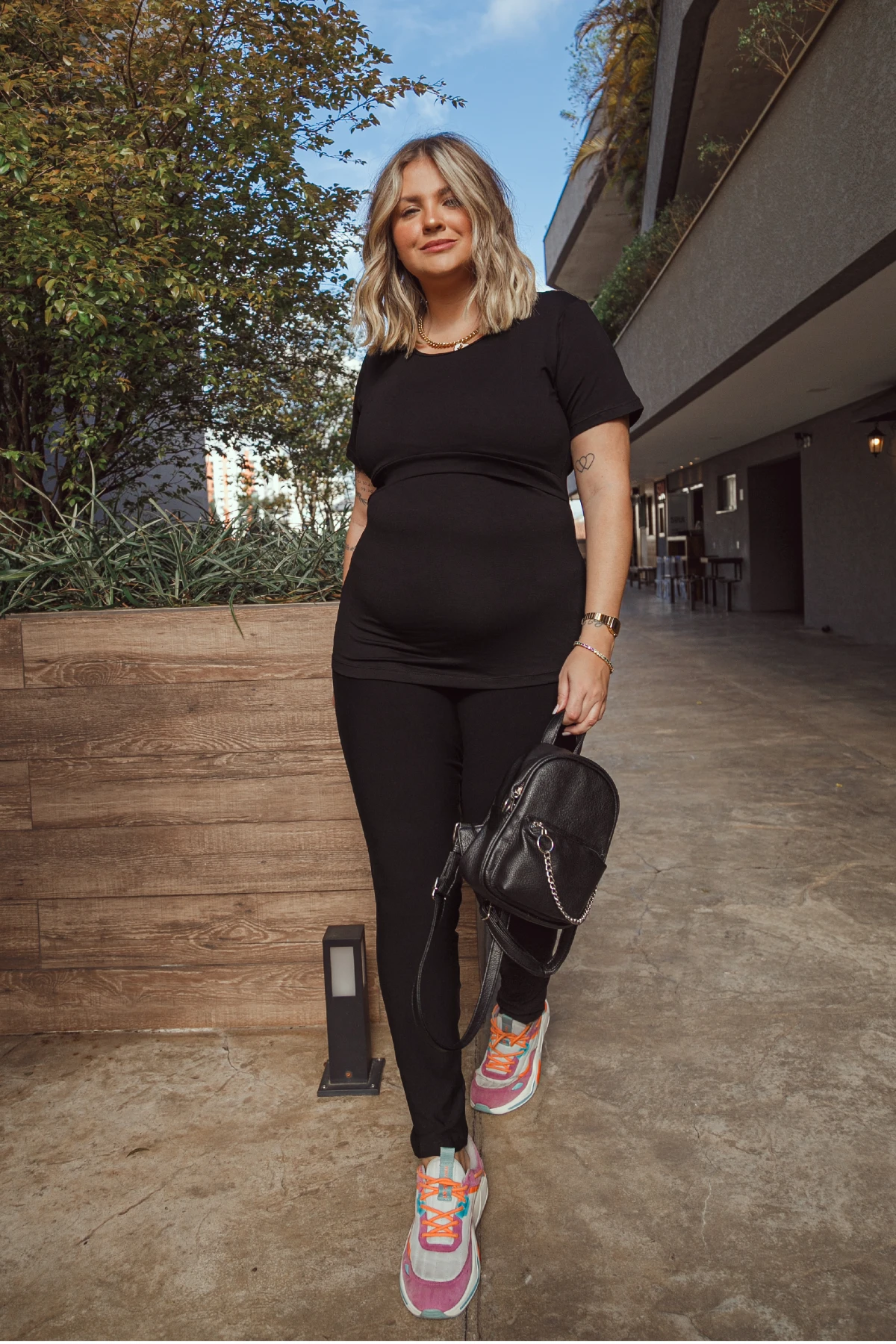 T-shirt básica com modelagem justinha e tecido em viscolycra flexível, macio e confortável. Possui uma sobreposição com decote interno para a amamentação.